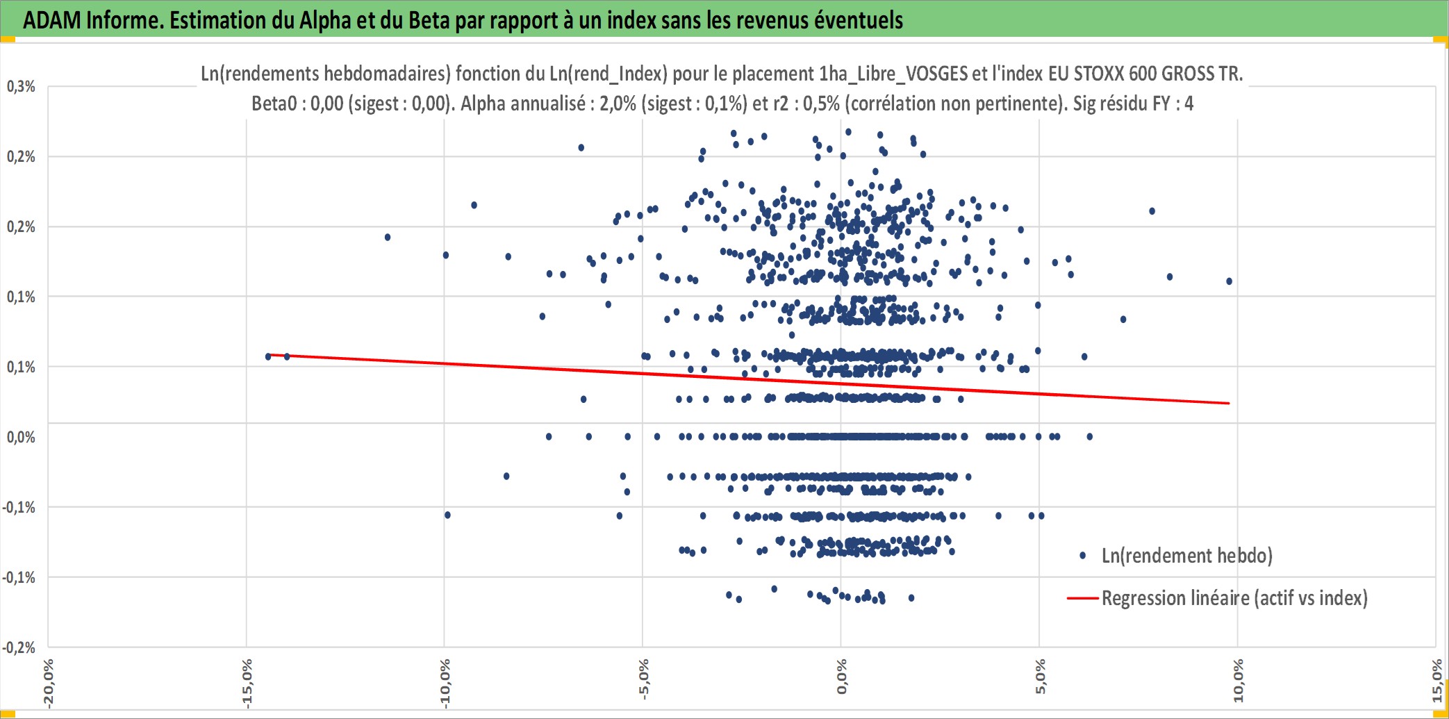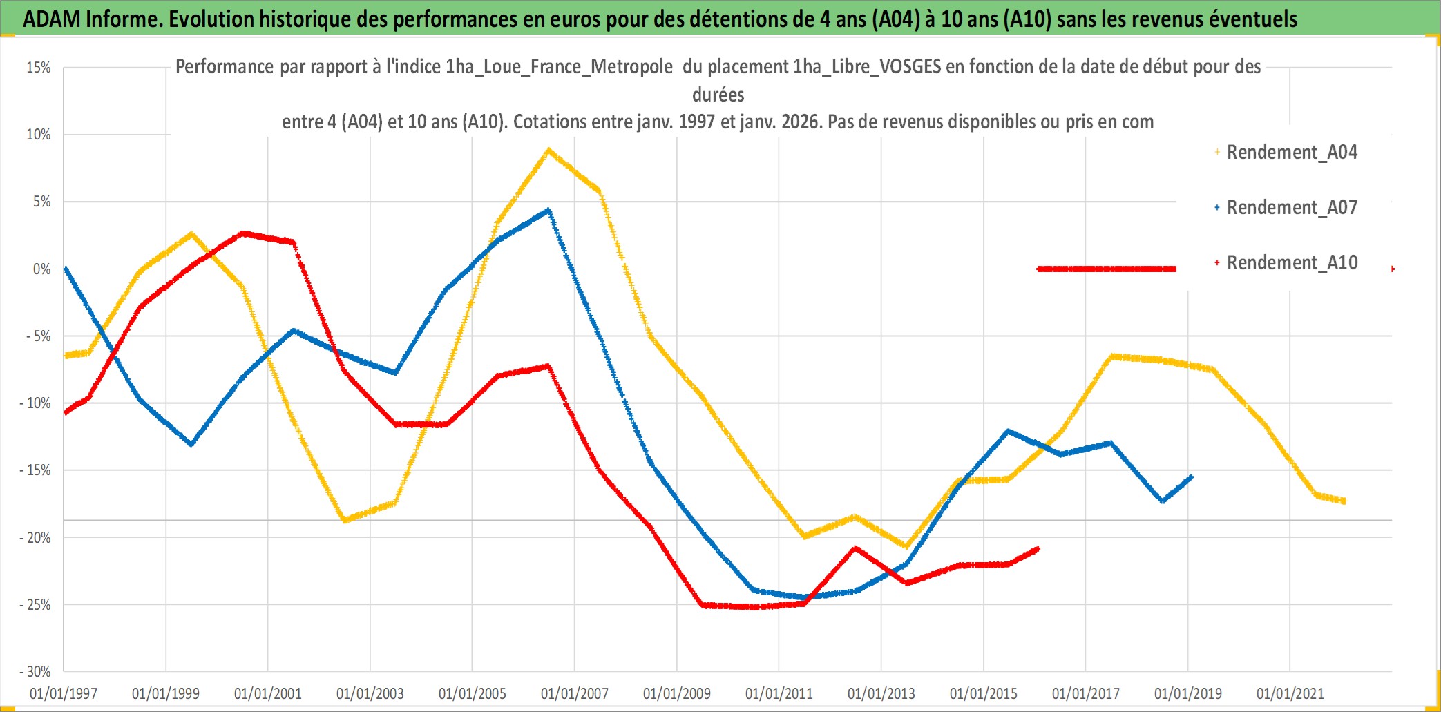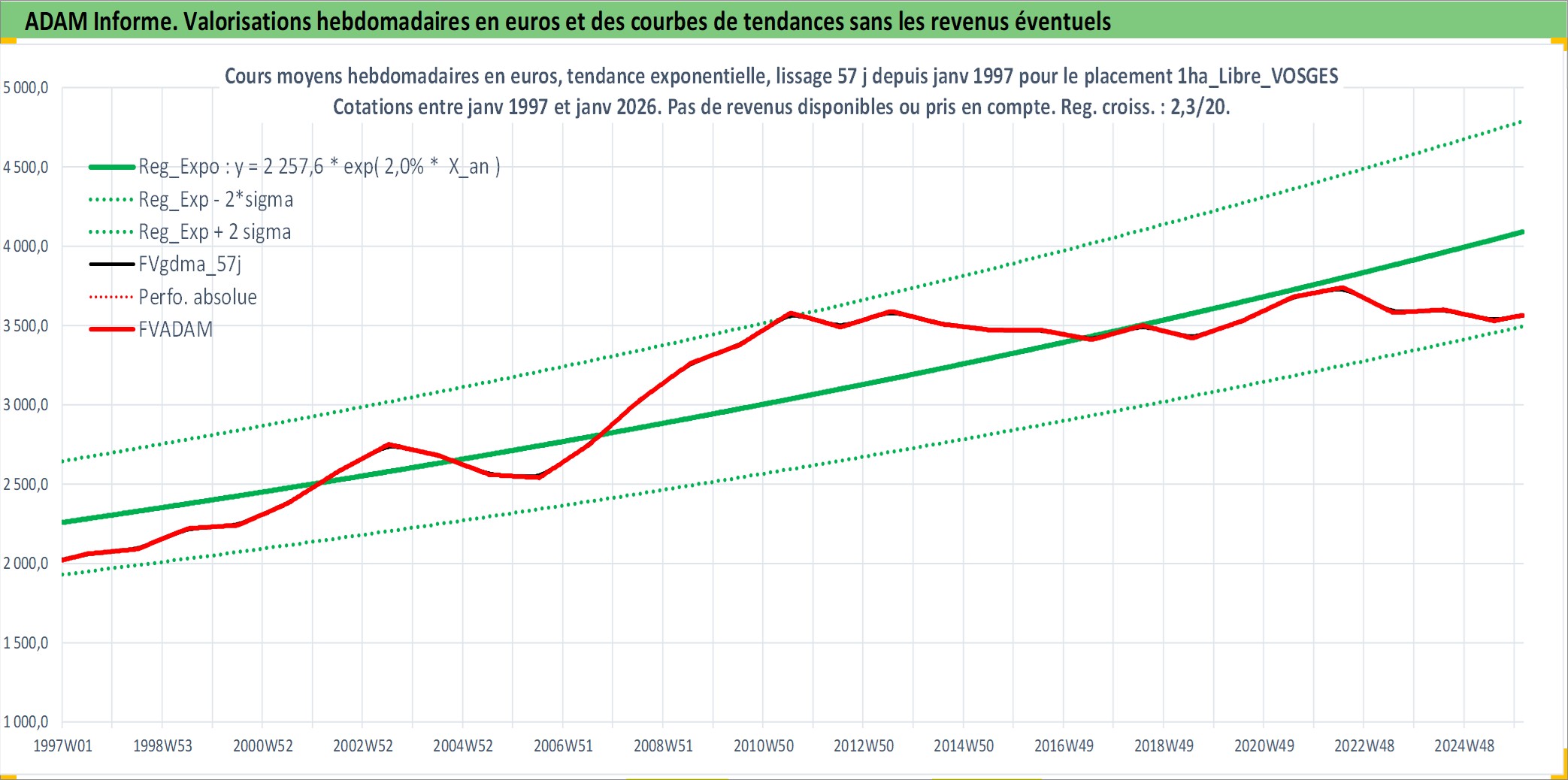 Site dédié aux investisseursPage dédiée sur site financeAnalyse des valorisations hebdomadaires de l'actif 1ha_Libre_VOSGES. Cet actif est cote en EUR. Les valorisations couvrent les semaines 1997W01 a 2026W05. Les fermages de ce bien foncier sont pris egaux a 2,5% annuels de la valeur venale du bien.