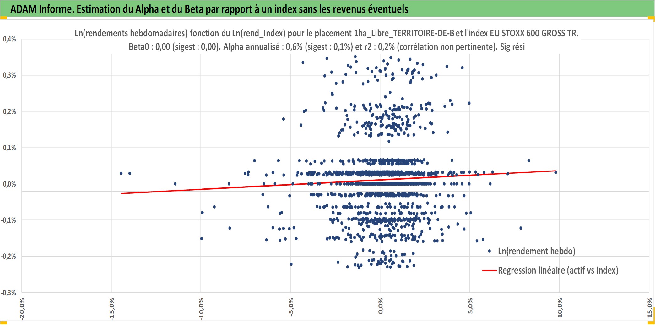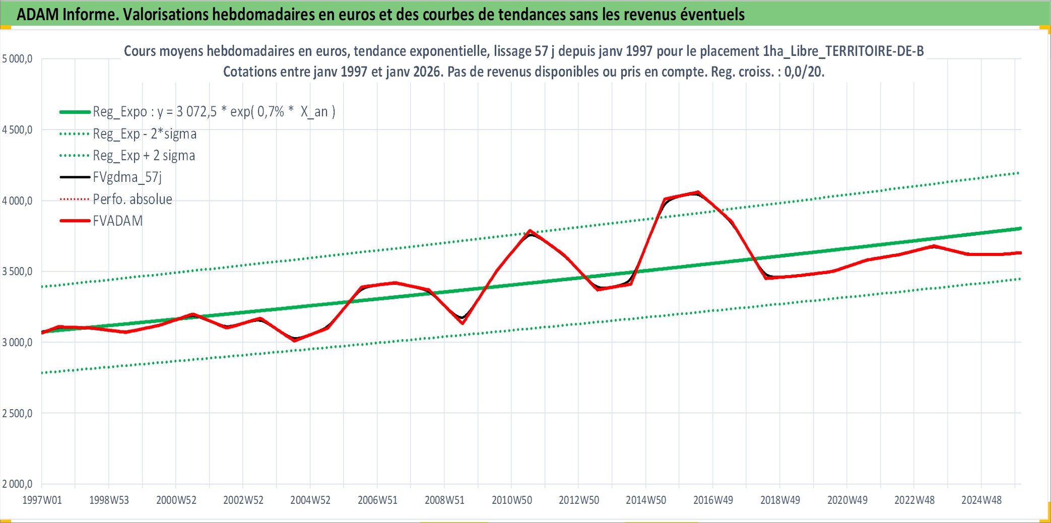 Site dédié aux investisseursPage dédiée sur site financeAnalyse des valorisations hebdomadaires de l'actif 1ha_Libre_TERRITOIRE-DE-BELFORT. Cet actif est cote en EUR. Les valorisations couvrent les semaines 1997W01 a 2026W05. Les fermages de ce bien foncier sont pris egaux a 2,5% annuels de la valeur venale du bien.
