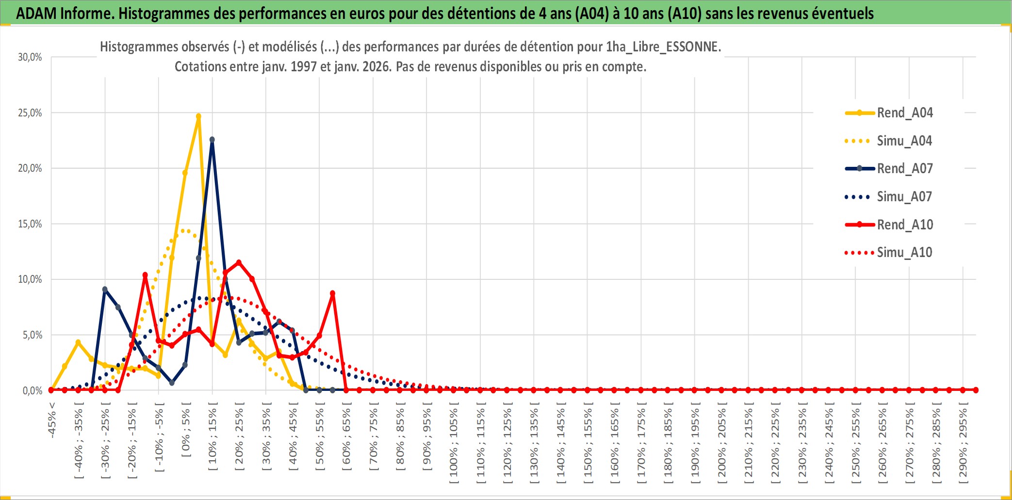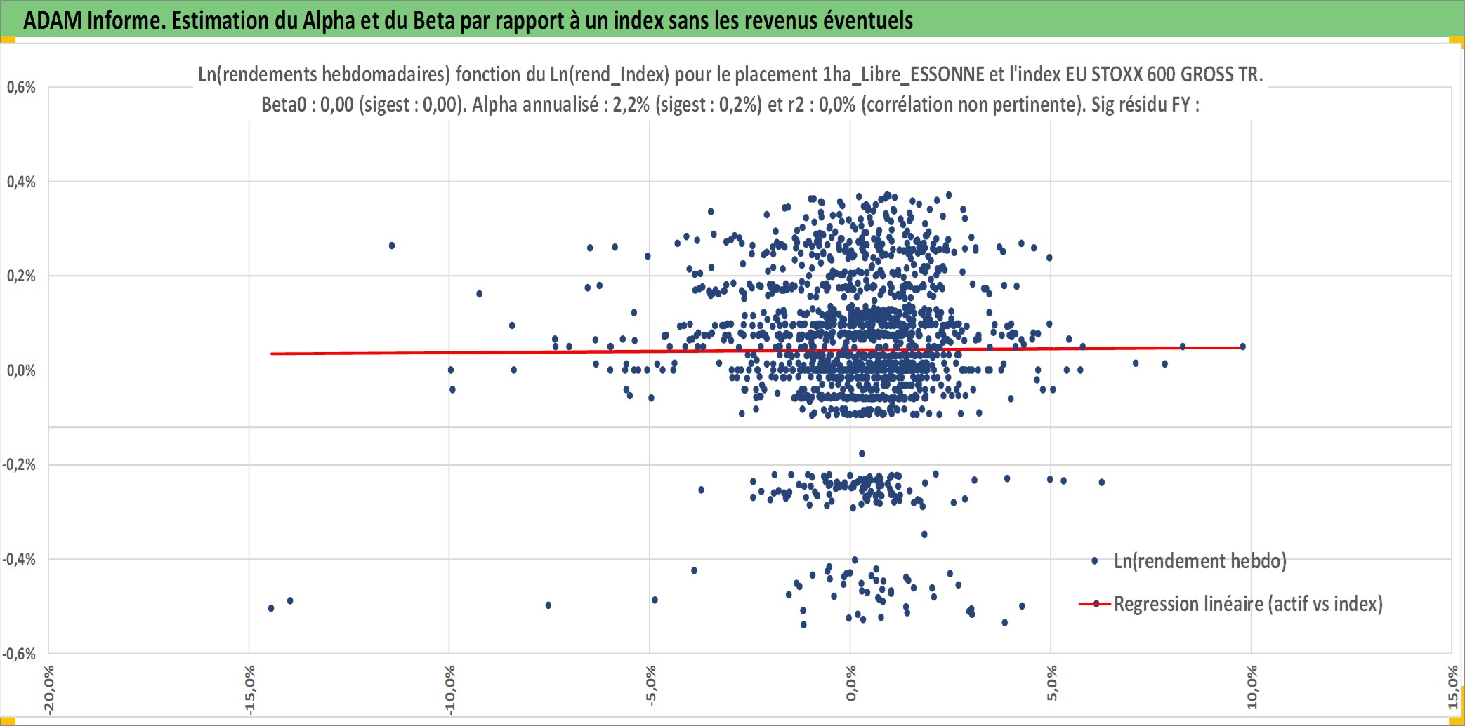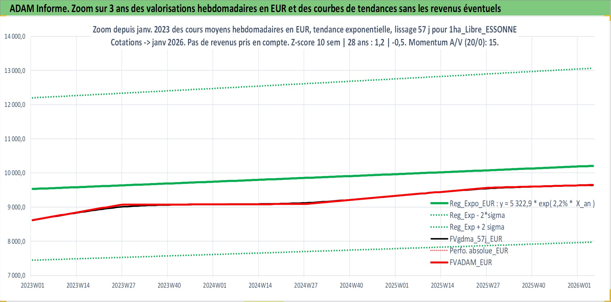 Site dédié aux investisseursPage dédiée sur site financeAnalyse des valorisations hebdomadaires de l'actif 1ha_Libre_ESSONNE. Cet actif est cote en EUR. Les valorisations couvrent les semaines 1997W01 a 2026W05. Les fermages de ce bien foncier sont pris egaux a 2,5% annuels de la valeur venale du bien.