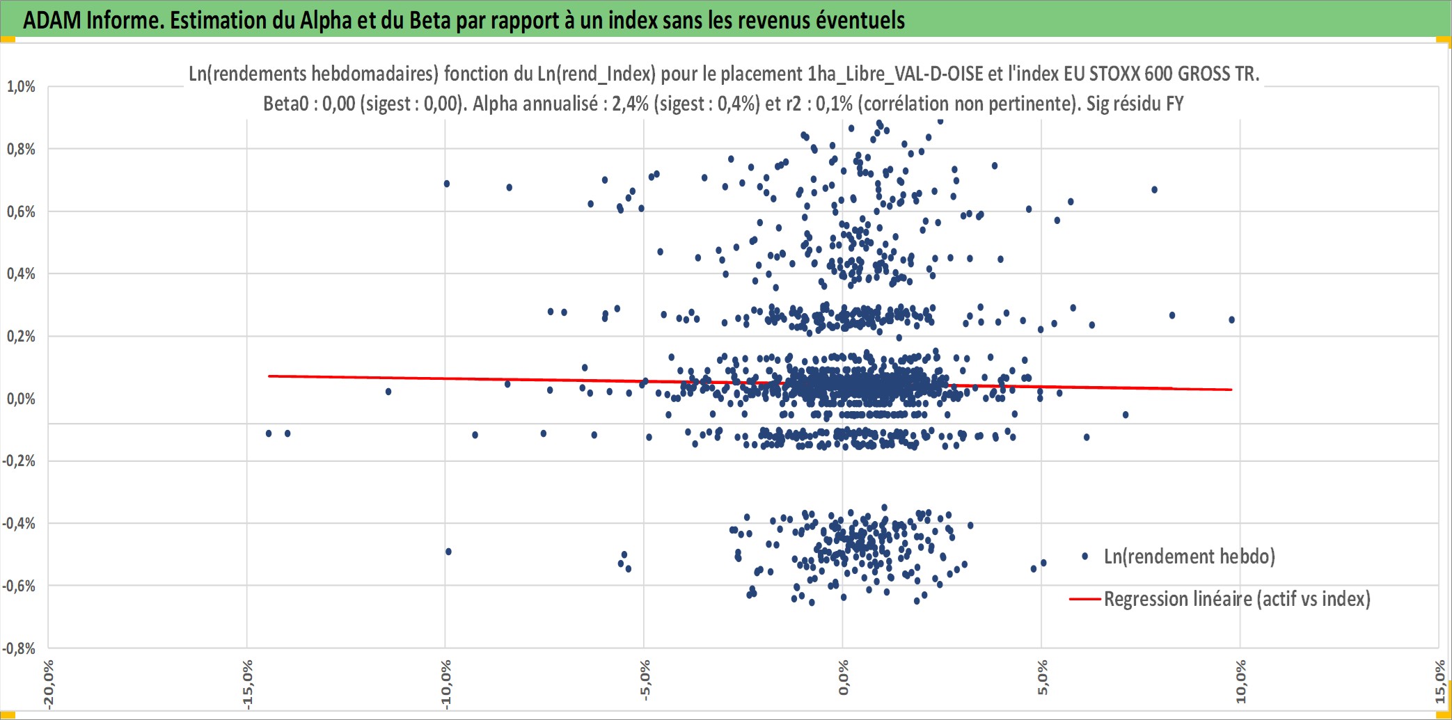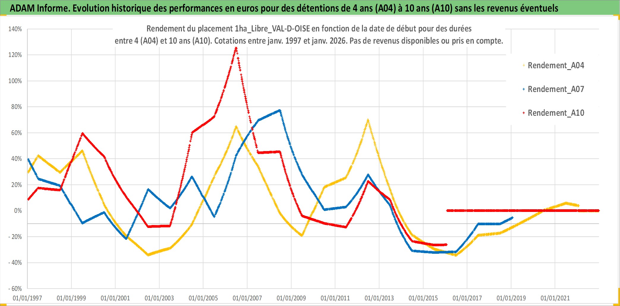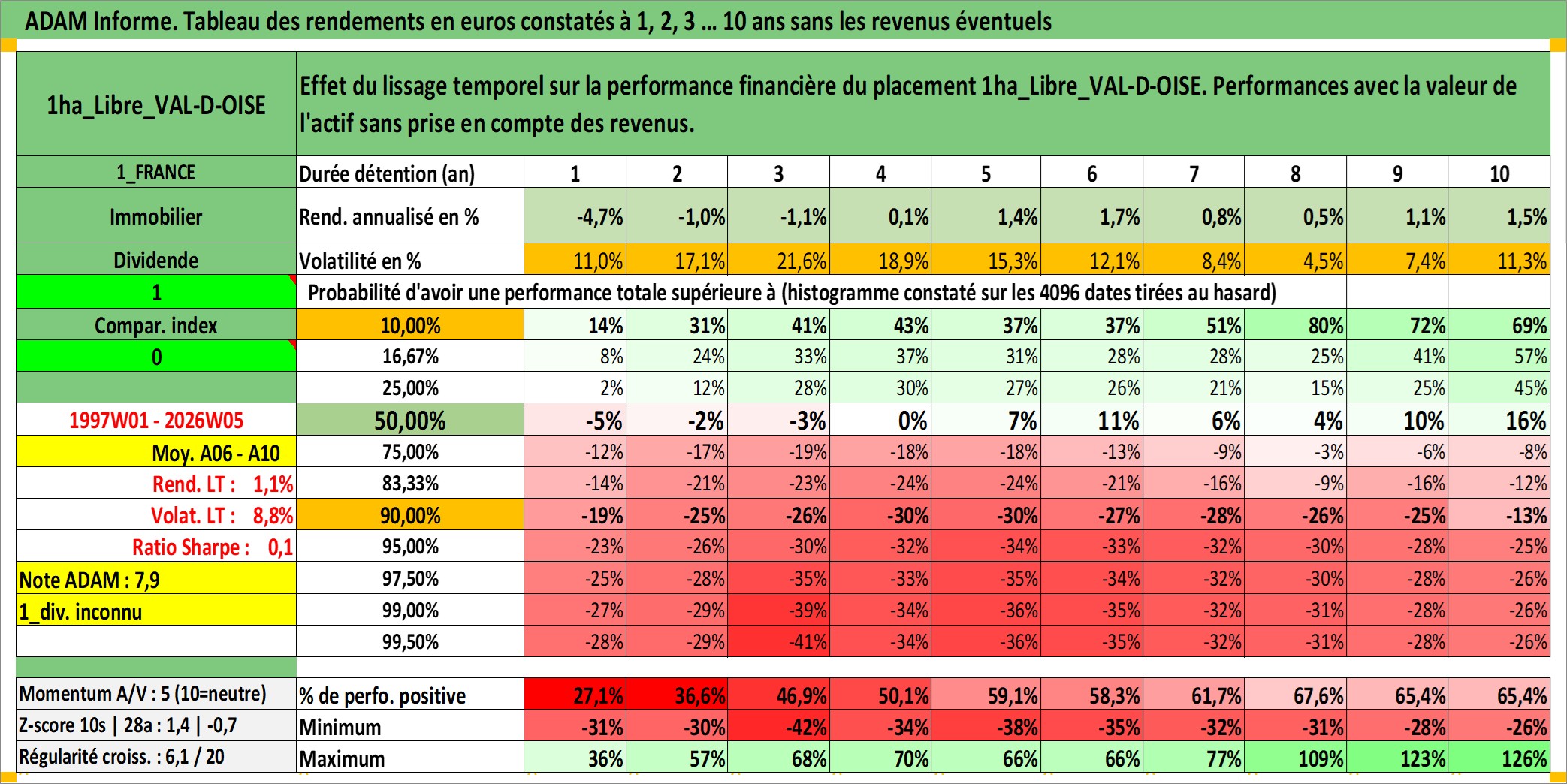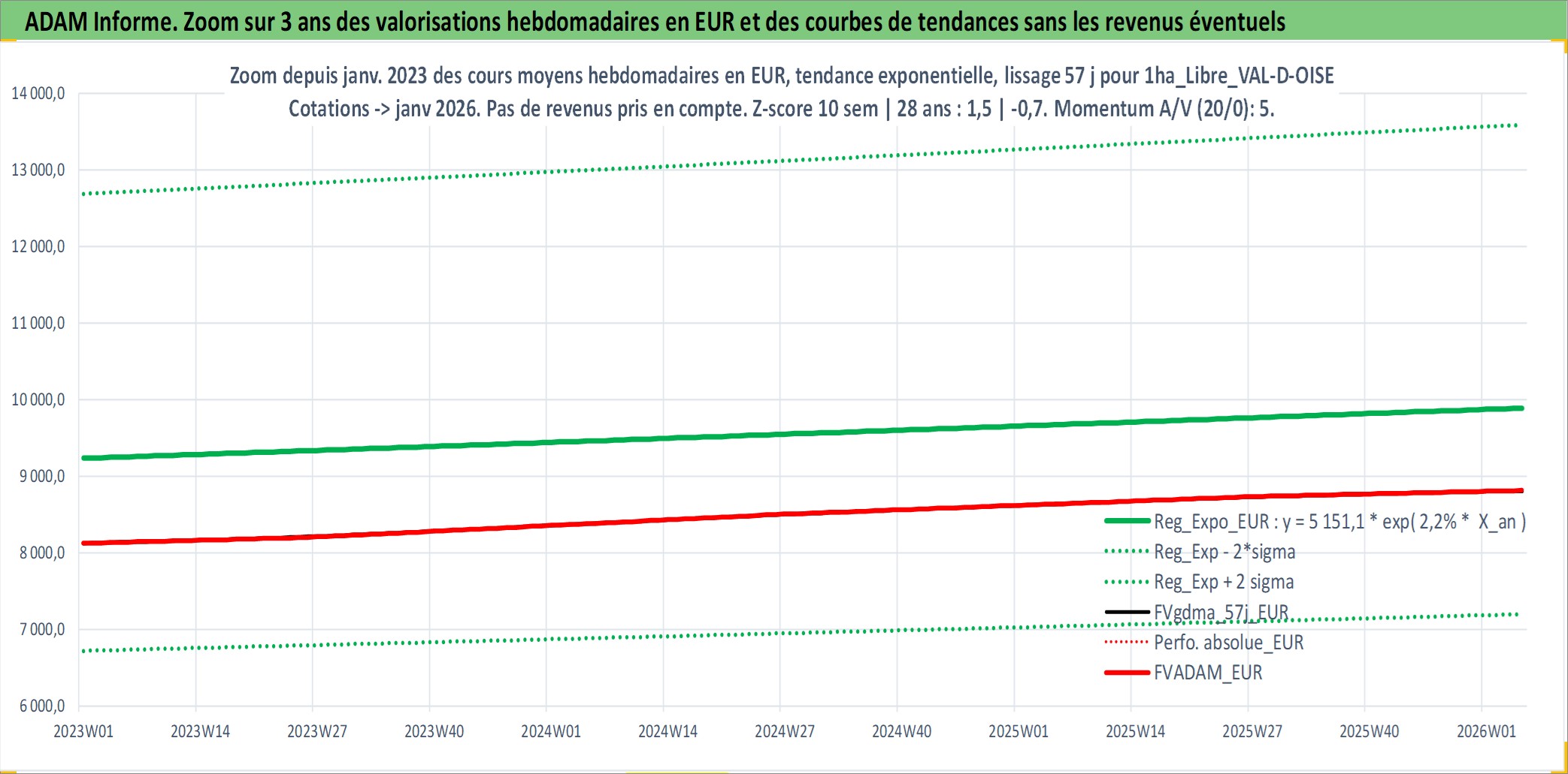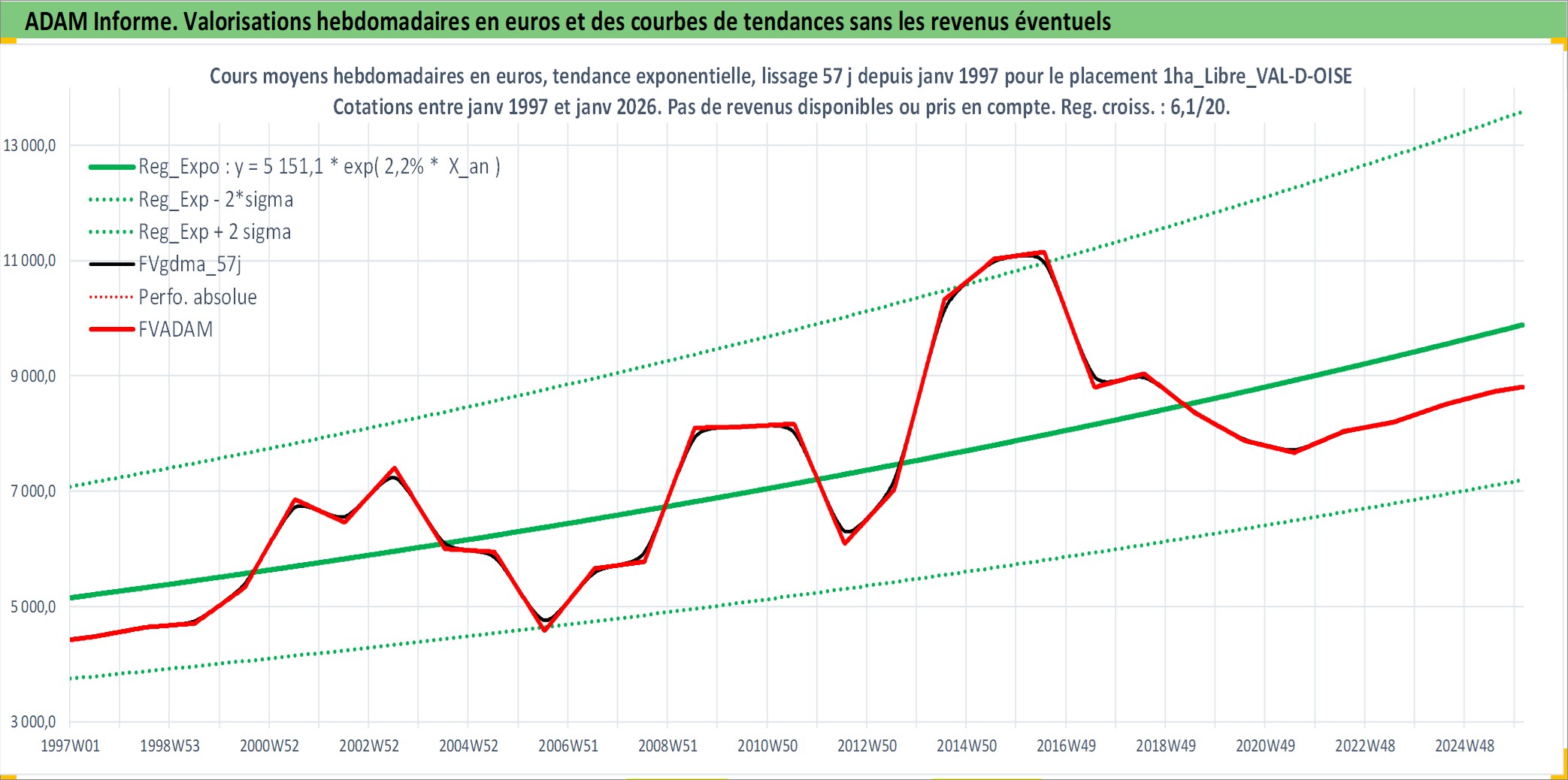 Site dédié aux investisseursPage dédiée sur site financeAnalyse des valorisations hebdomadaires de l'actif 1ha_Libre_VAL-D-OISE. Cet actif est cote en EUR. Les valorisations couvrent les semaines 1997W01 a 2026W05. Les fermages de ce bien foncier sont pris egaux a 2,5% annuels de la valeur venale du bien.