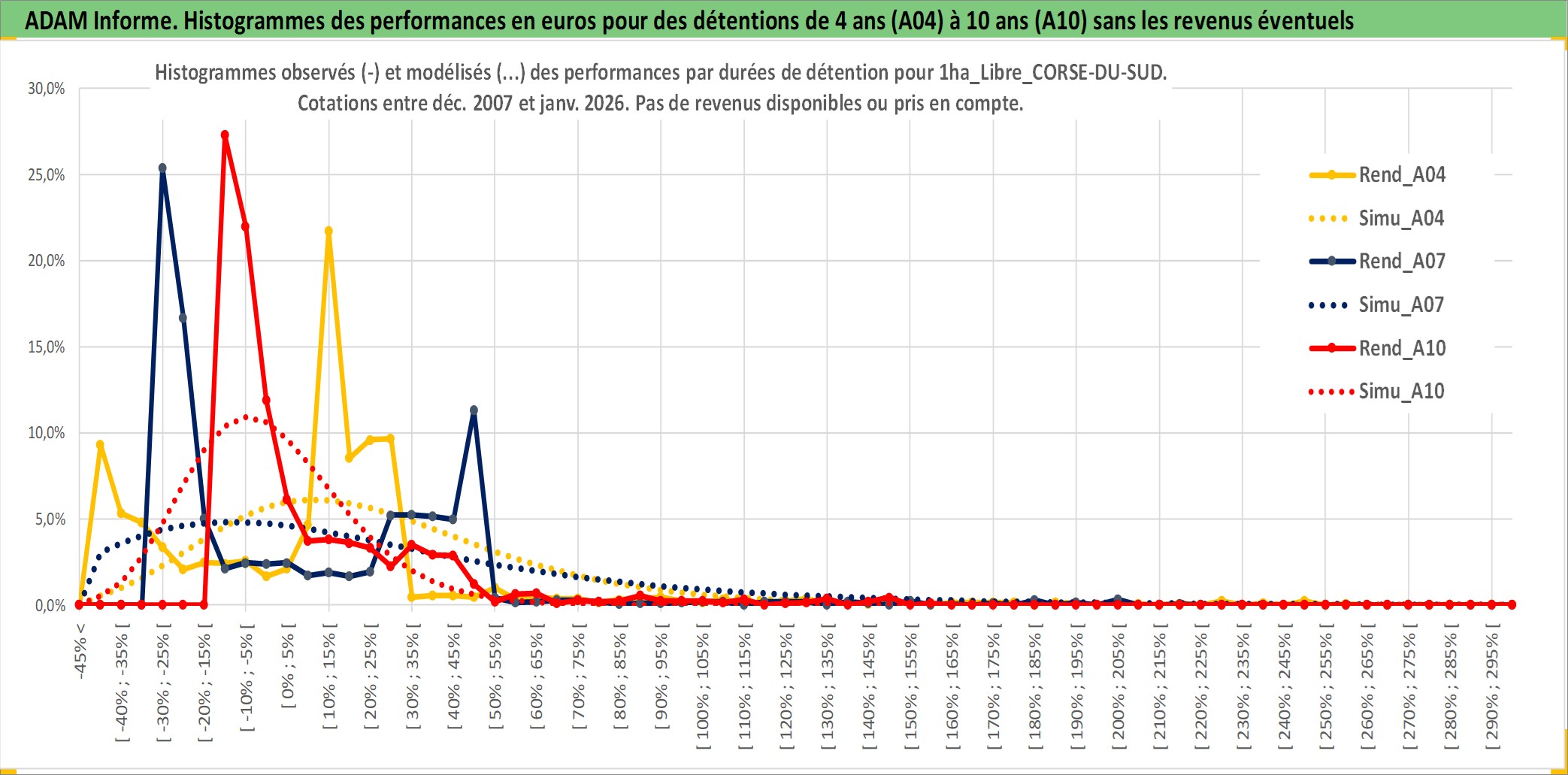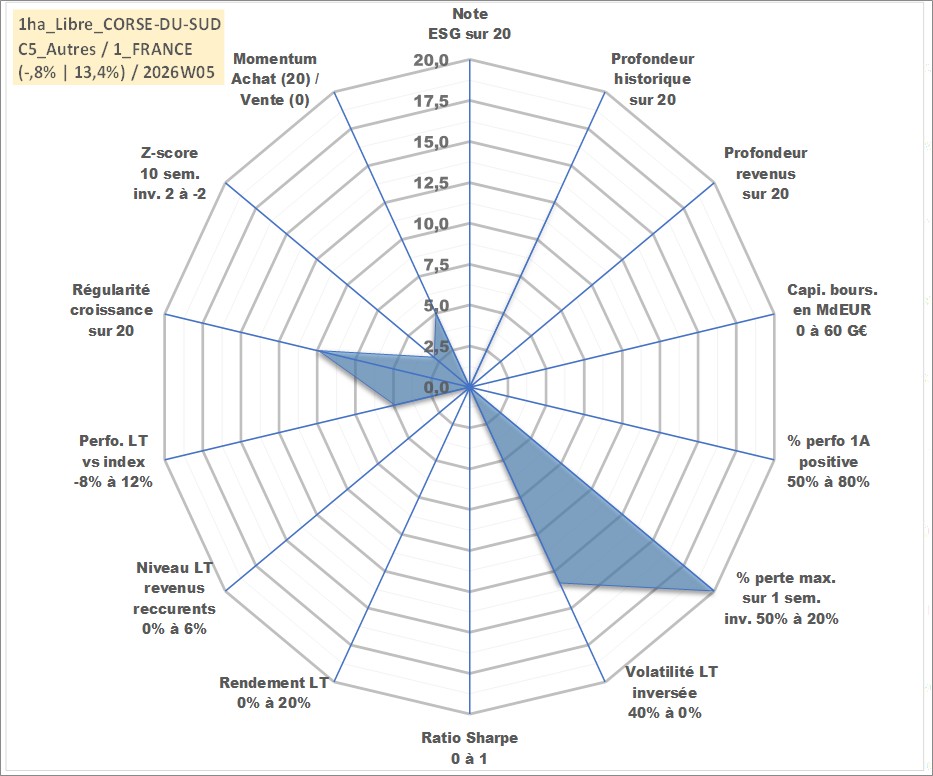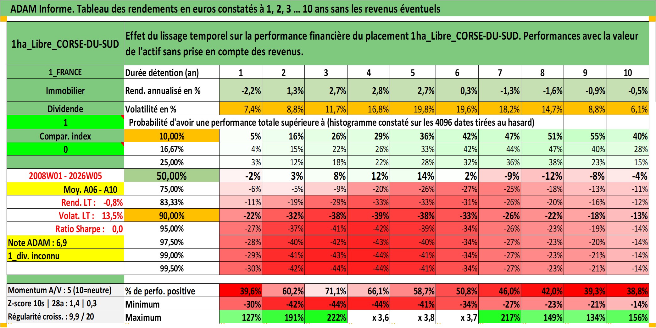 Site dédié aux investisseursPage dédiée sur site financeAnalyse des valorisations hebdomadaires de l'actif 1ha_Libre_CORSE-DU-SUD. Cet actif est cote en EUR. Les valorisations couvrent les semaines 2008W01 a 2026W05. Les fermages de ce bien foncier sont pris egaux a 2,5% annuels de la valeur venale du bien.