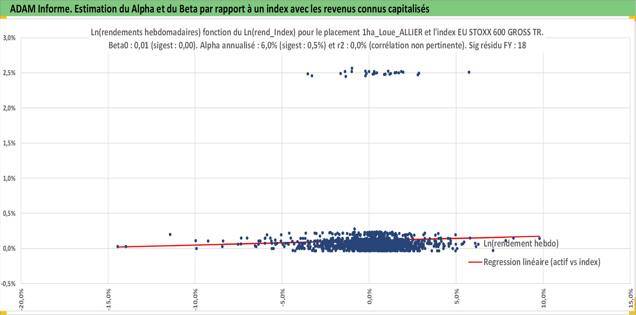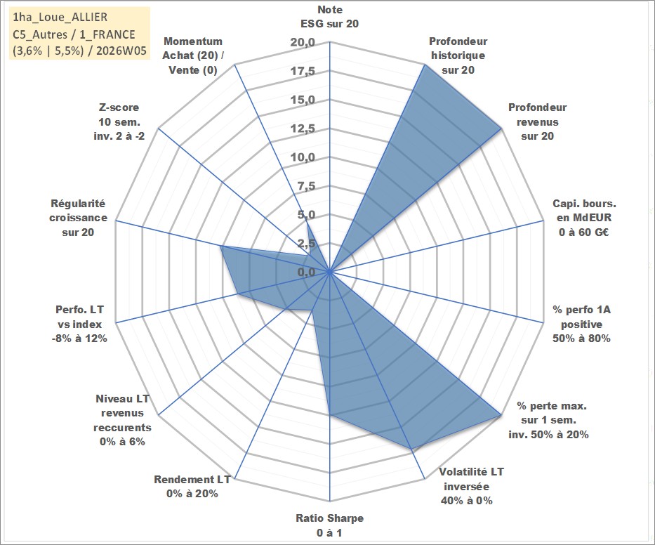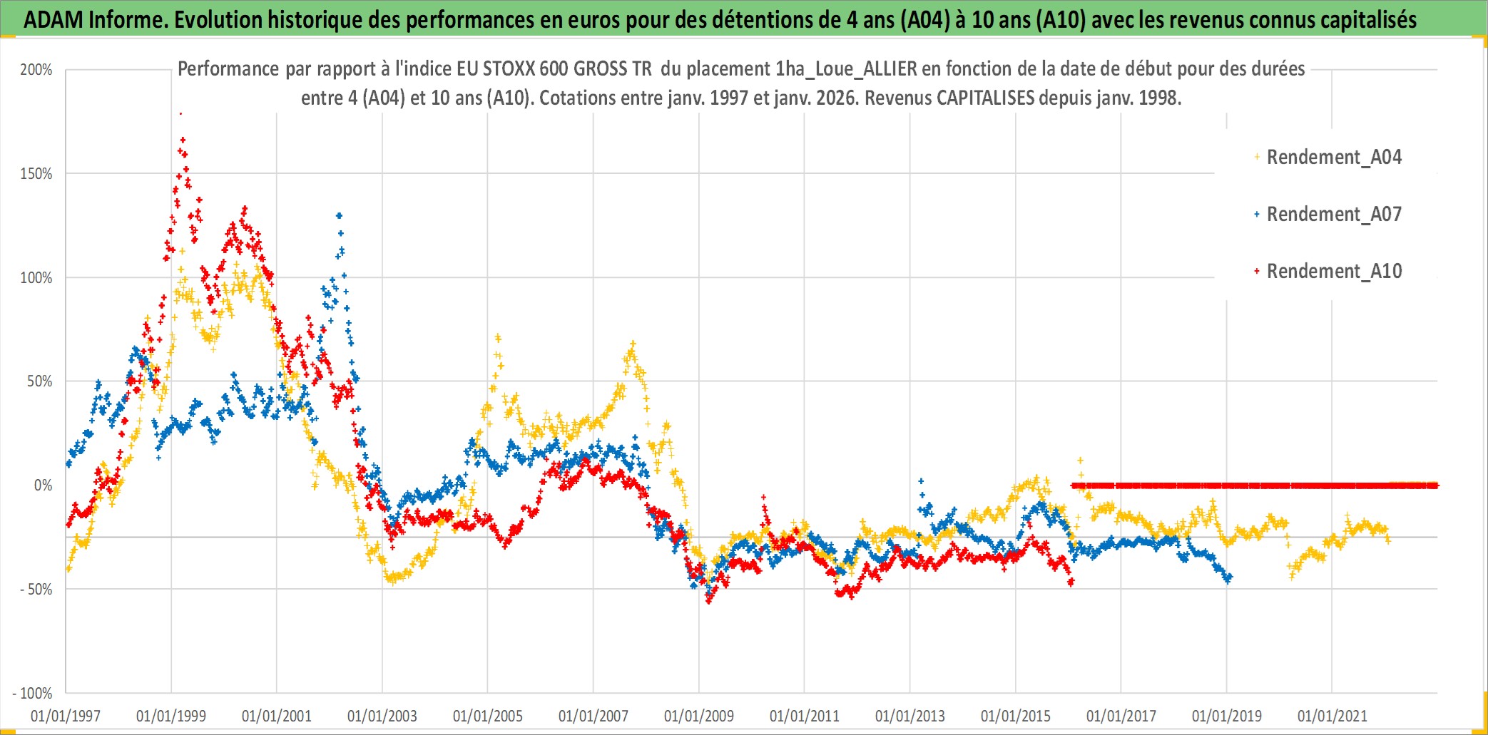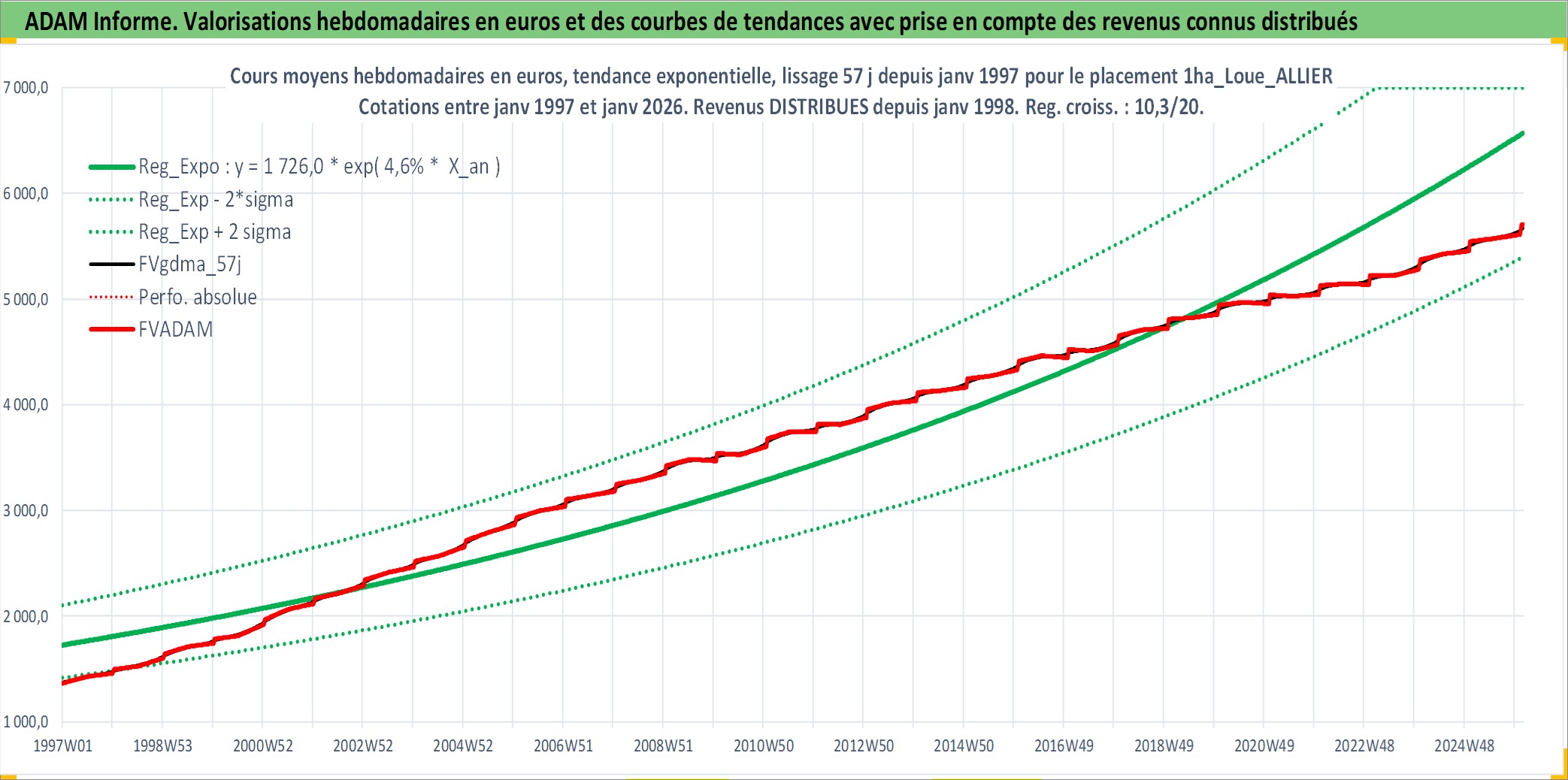 Site dédié aux investisseursPage dédiée sur site financeAnalyse des valorisations hebdomadaires de l'actif 1ha_Loue_ALLIER. Cet actif est cote en EUR. Les valorisations couvrent les semaines 1997W01 a 2026W05. Les fermages de ce bien foncier sont pris egaux a 2,5% annuels de la valeur venale du bien.