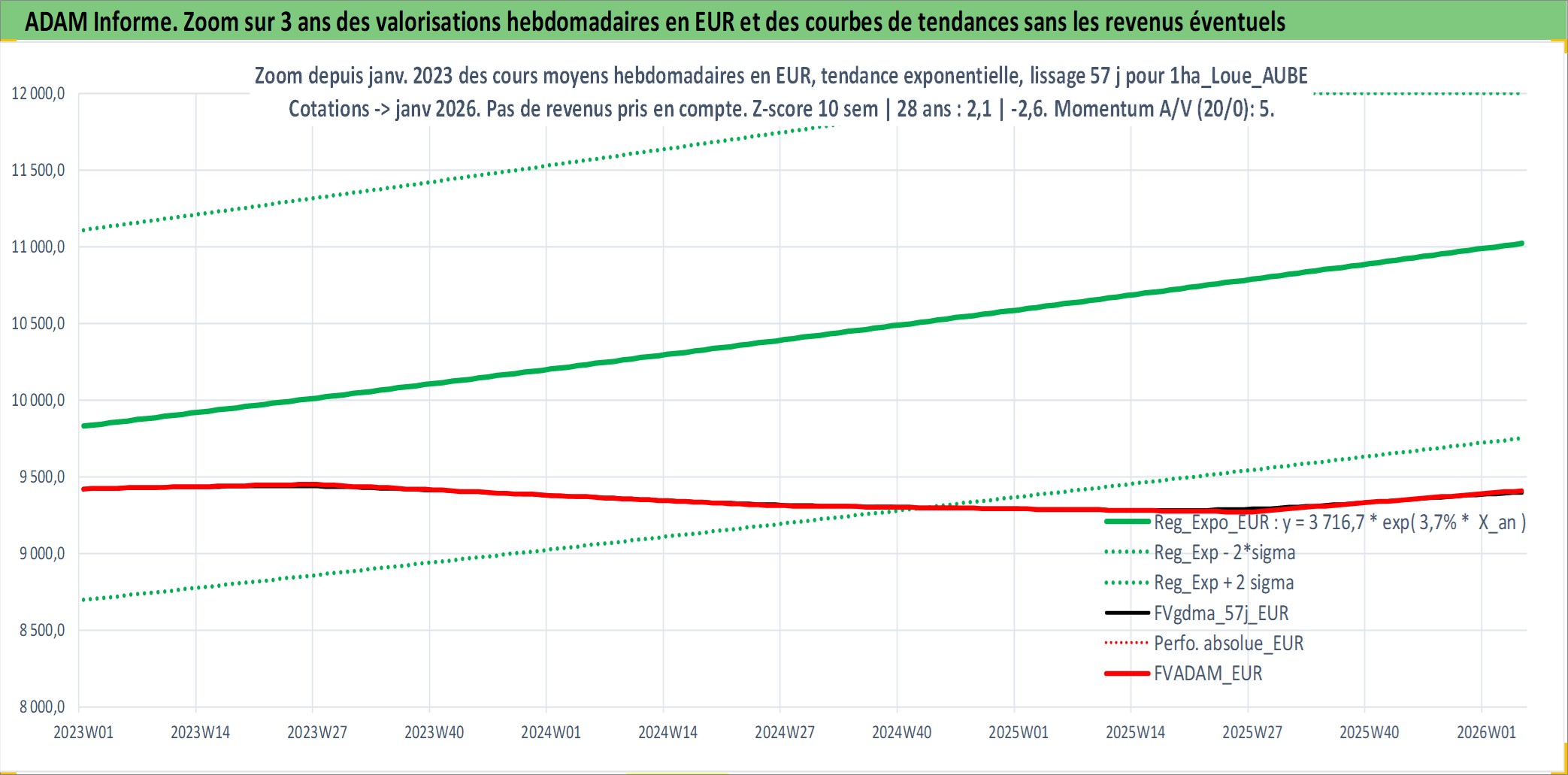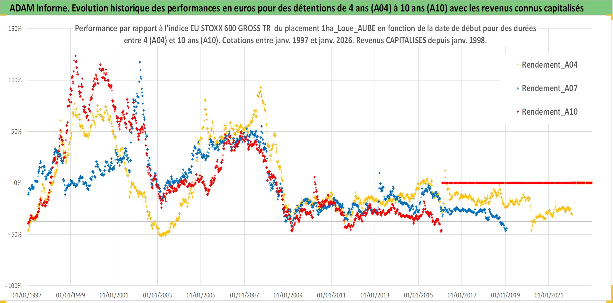 Site dédié aux investisseursPage dédiée sur site financeAnalyse des valorisations hebdomadaires de l'actif 1ha_Loue_AUBE. Cet actif est cote en EUR. Les valorisations couvrent les semaines 1997W01 a 2026W05. Les fermages de ce bien foncier sont pris egaux a 2,5% annuels de la valeur venale du bien.