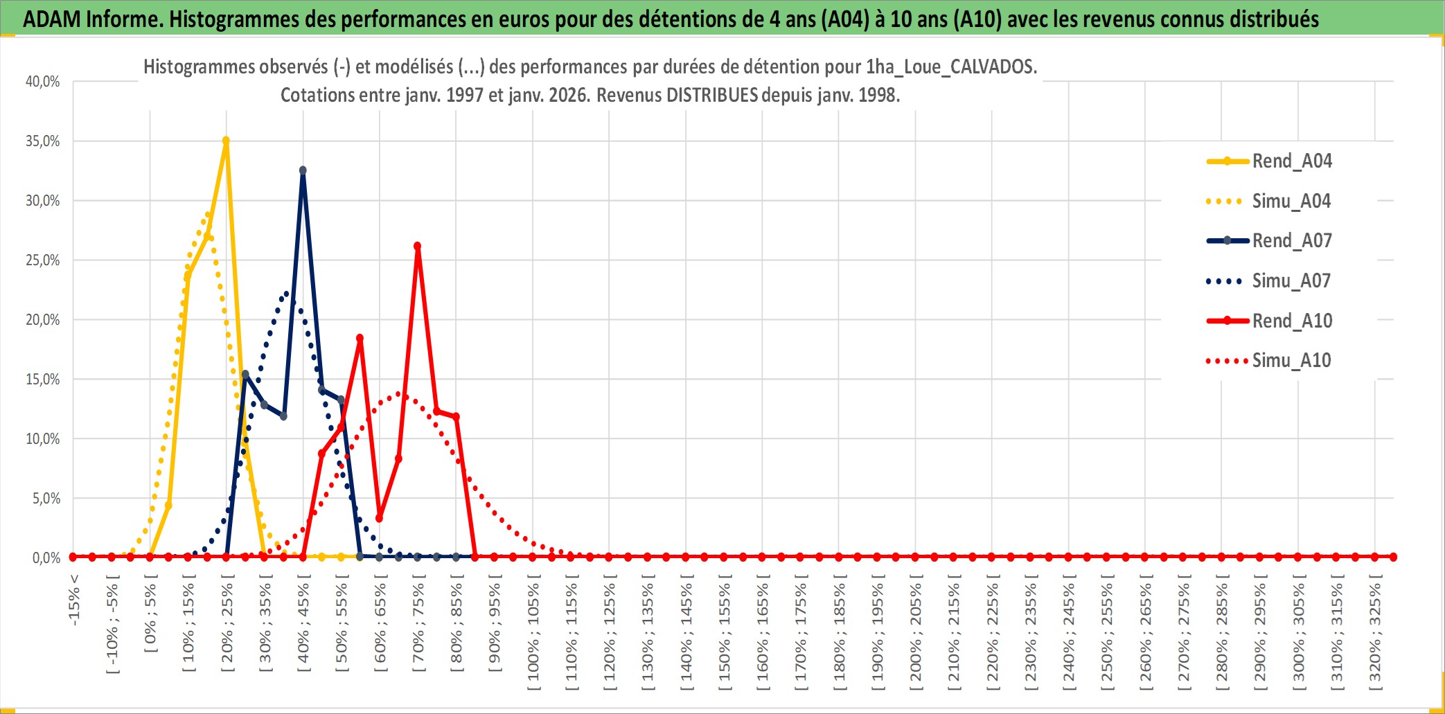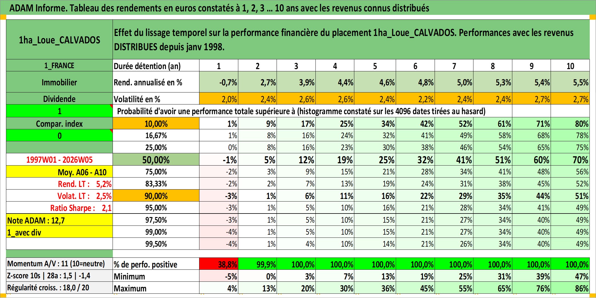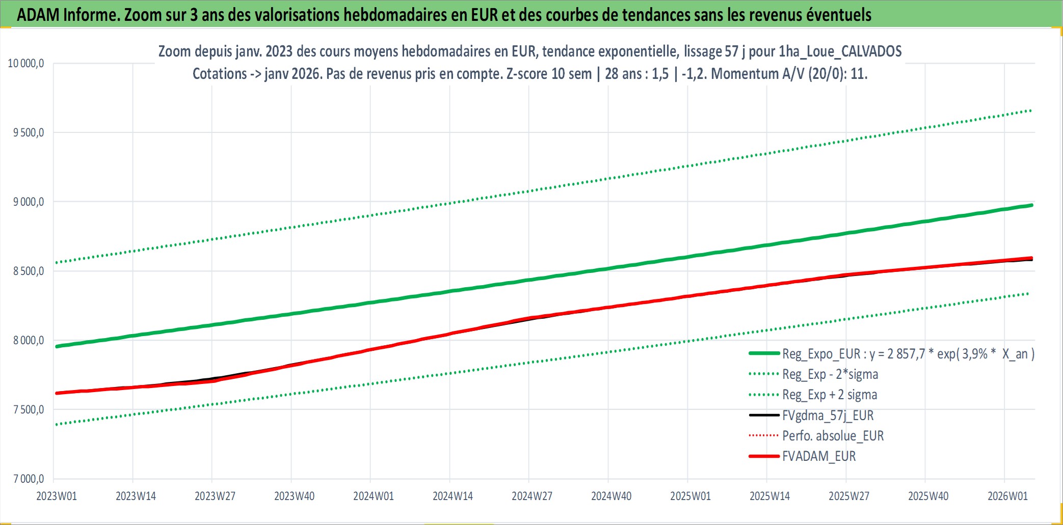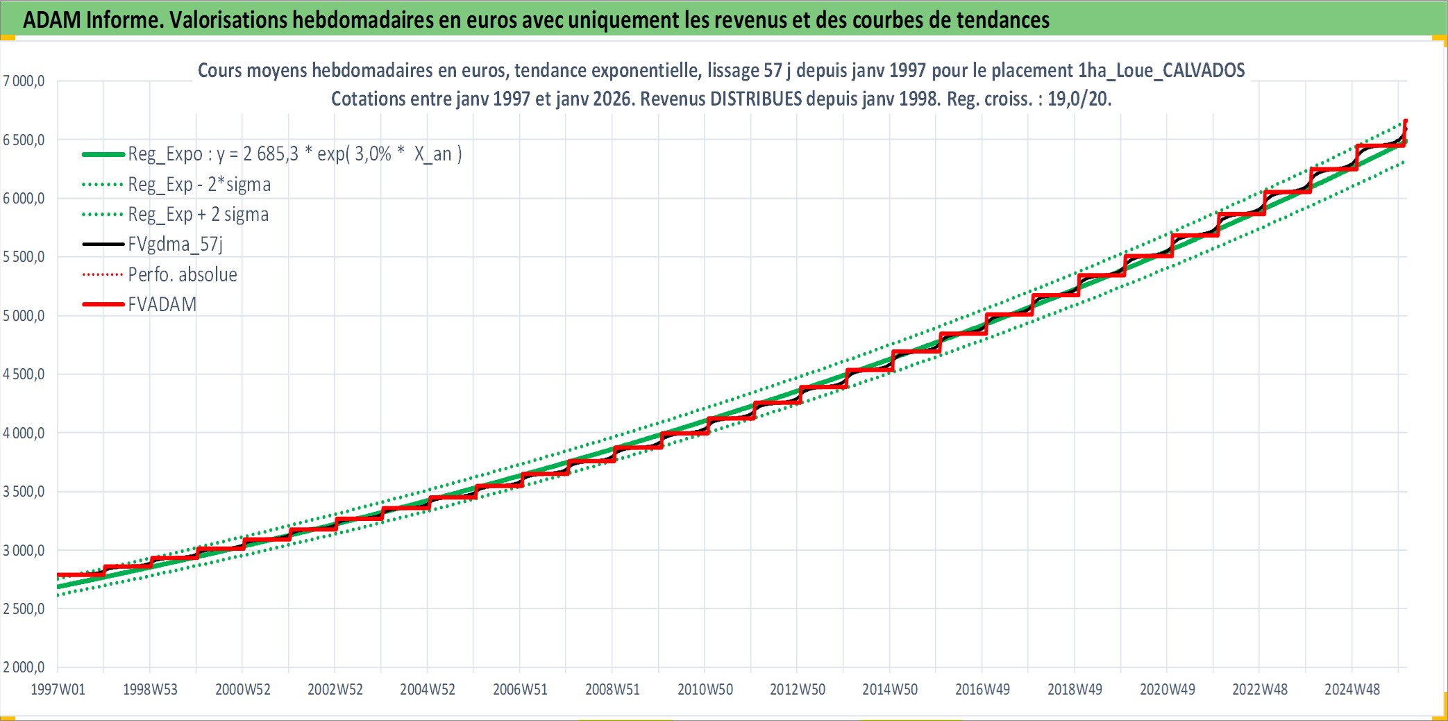 Site dédié aux investisseursPage dédiée sur site financeAnalyse des valorisations hebdomadaires de l'actif 1ha_Loue_CALVADOS. Cet actif est cote en EUR. Les valorisations couvrent les semaines 1997W01 a 2026W05. Les fermages de ce bien foncier sont pris egaux a 2,5% annuels de la valeur venale du bien.