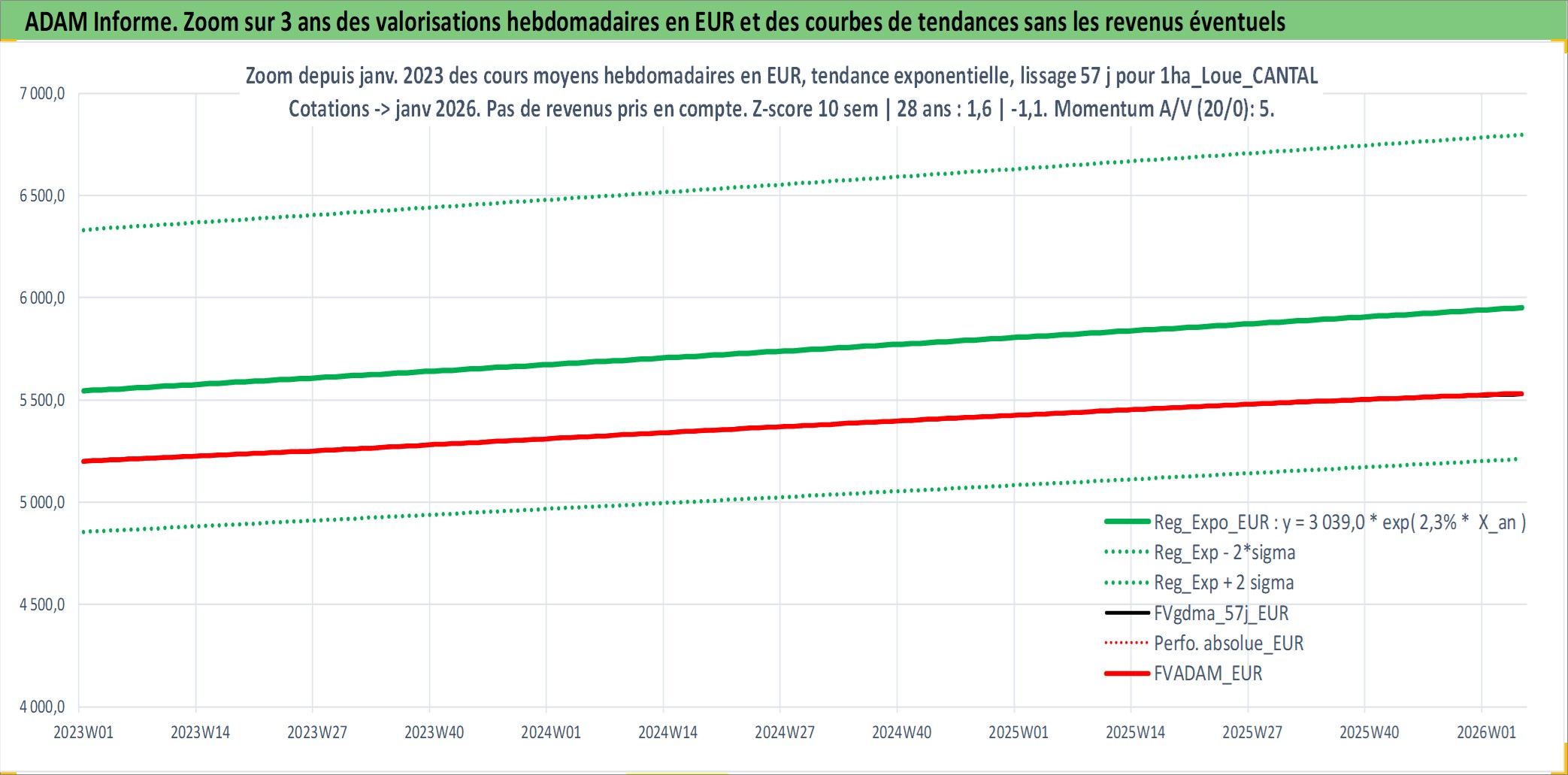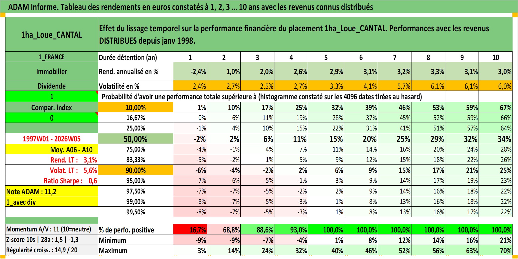 Site dédié aux investisseursPage dédiée sur site financeAnalyse des valorisations hebdomadaires de l'actif 1ha_Loue_CANTAL. Cet actif est cote en EUR. Les valorisations couvrent les semaines 1997W01 a 2026W05. Les fermages de ce bien foncier sont pris egaux a 2,5% annuels de la valeur venale du bien.