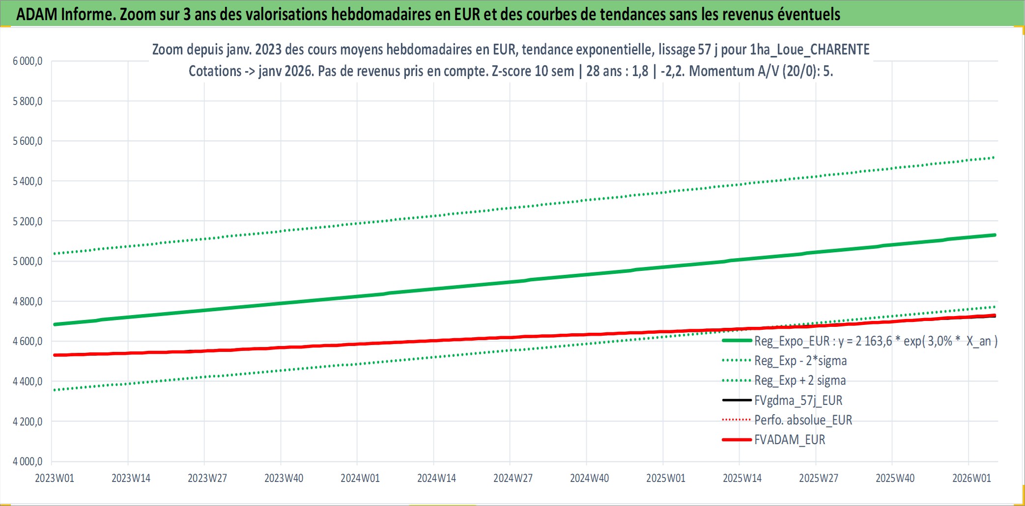 Site dédié aux investisseursPage dédiée sur site financeAnalyse des valorisations hebdomadaires de l'actif 1ha_Loue_CHARENTE. Cet actif est cote en EUR. Les valorisations couvrent les semaines 1997W01 a 2026W05. Les fermages de ce bien foncier sont pris egaux a 2,5% annuels de la valeur venale du bien.