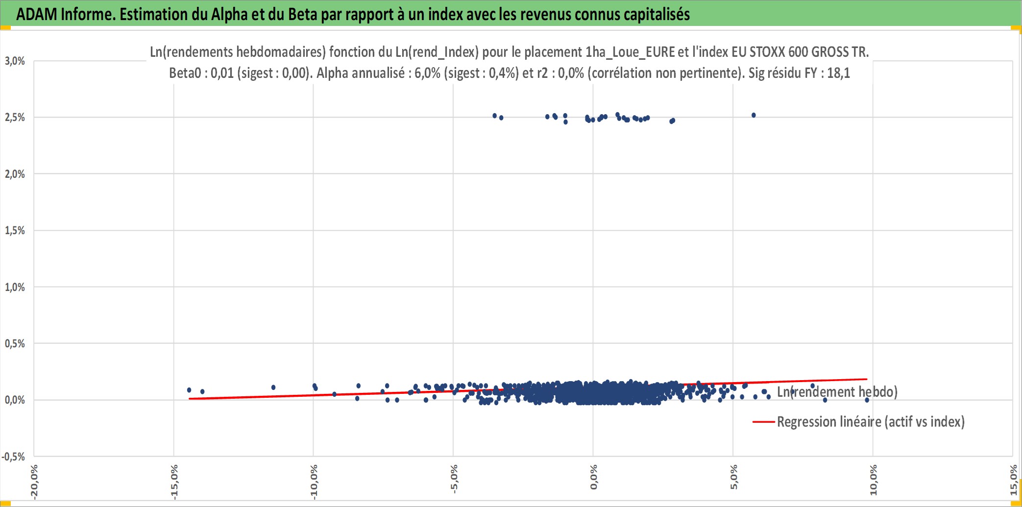 Site dédié aux investisseursPage dédiée sur site financeAnalyse des valorisations hebdomadaires de l'actif 1ha_Loue_EURE. Cet actif est cote en EUR. Les valorisations couvrent les semaines 1997W01 a 2026W05. Les fermages de ce bien foncier sont pris egaux a 2,5% annuels de la valeur venale du bien.