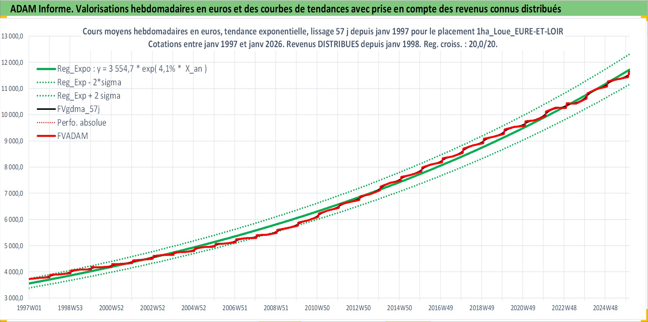 Site dédié aux investisseursPage dédiée sur site financeAnalyse des valorisations hebdomadaires de l'actif 1ha_Loue_EURE-ET-LOIR. Cet actif est cote en EUR. Les valorisations couvrent les semaines 1997W01 a 2026W05. Les fermages de ce bien foncier sont pris egaux a 2,5% annuels de la valeur venale du bien.
