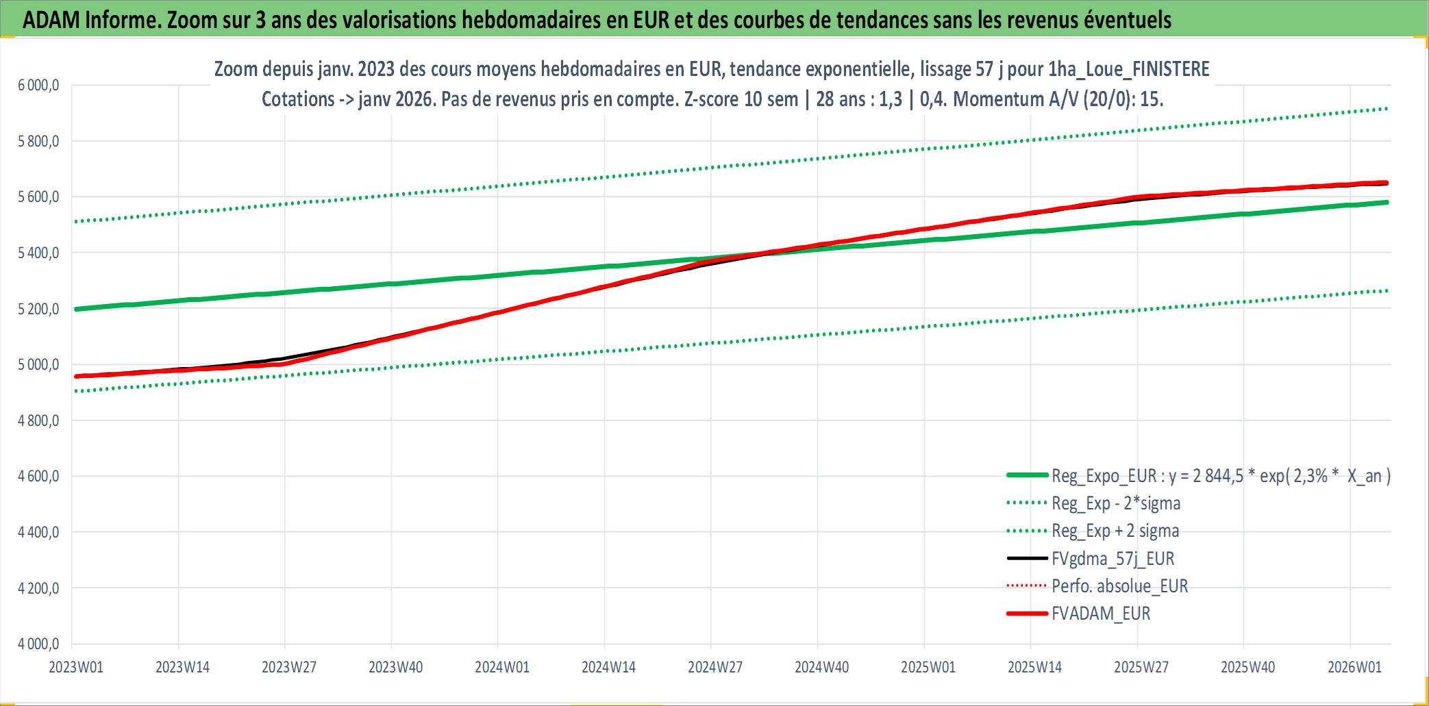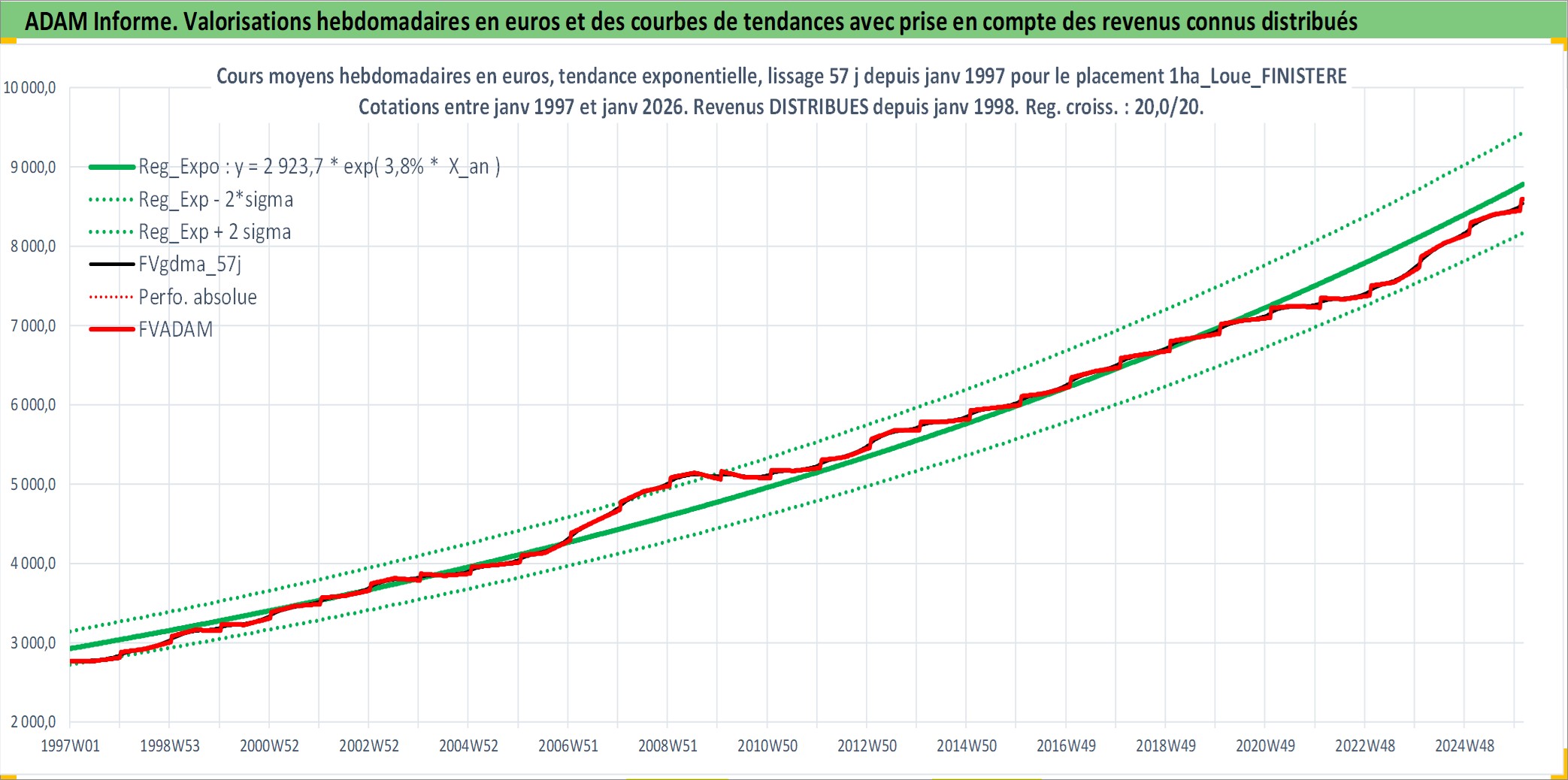 Site dédié aux investisseursPage dédiée sur site financeAnalyse des valorisations hebdomadaires de l'actif 1ha_Loue_FINISTERE. Cet actif est cote en EUR. Les valorisations couvrent les semaines 1997W01 a 2026W05. Les fermages de ce bien foncier sont pris egaux a 2,5% annuels de la valeur venale du bien.