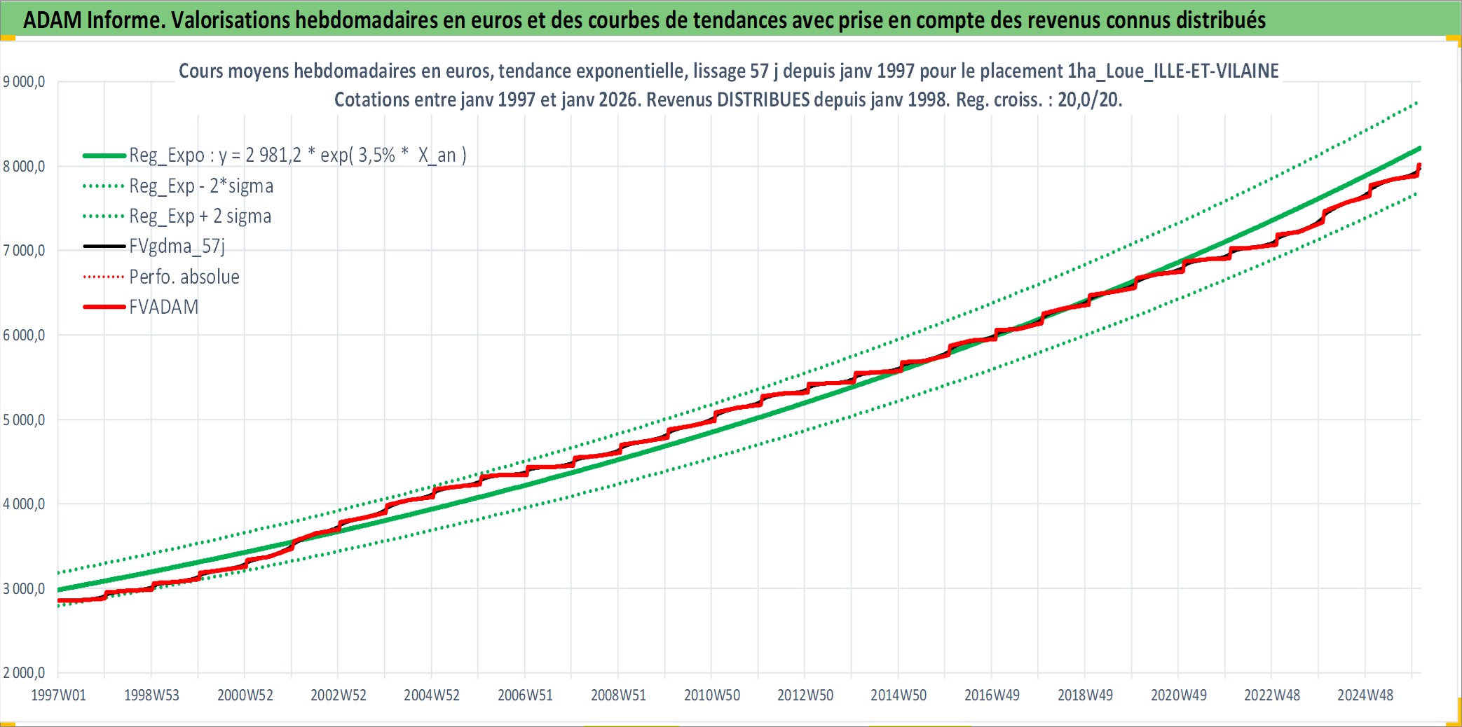Site dédié aux investisseursPage dédiée sur site financeAnalyse des valorisations hebdomadaires de l'actif 1ha_Loue_ILLE-ET-VILAINE. Cet actif est cote en EUR. Les valorisations couvrent les semaines 1997W01 a 2026W05. Les fermages de ce bien foncier sont pris egaux a 2,5% annuels de la valeur venale du bien.