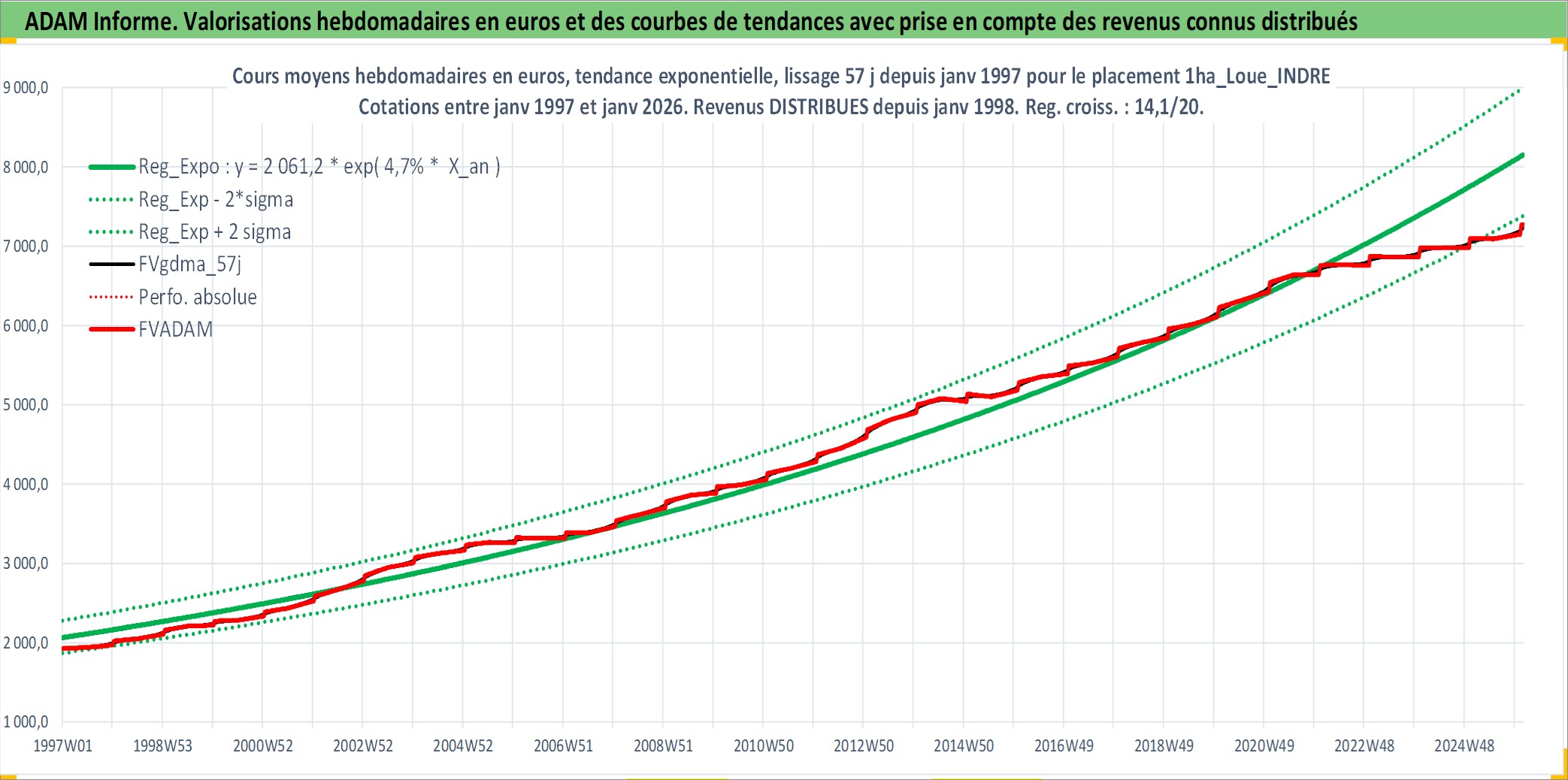 Site dédié aux investisseursPage dédiée sur site financeAnalyse des valorisations hebdomadaires de l'actif 1ha_Loue_INDRE. Cet actif est cote en EUR. Les valorisations couvrent les semaines 1997W01 a 2026W05. Les fermages de ce bien foncier sont pris egaux a 2,5% annuels de la valeur venale du bien.