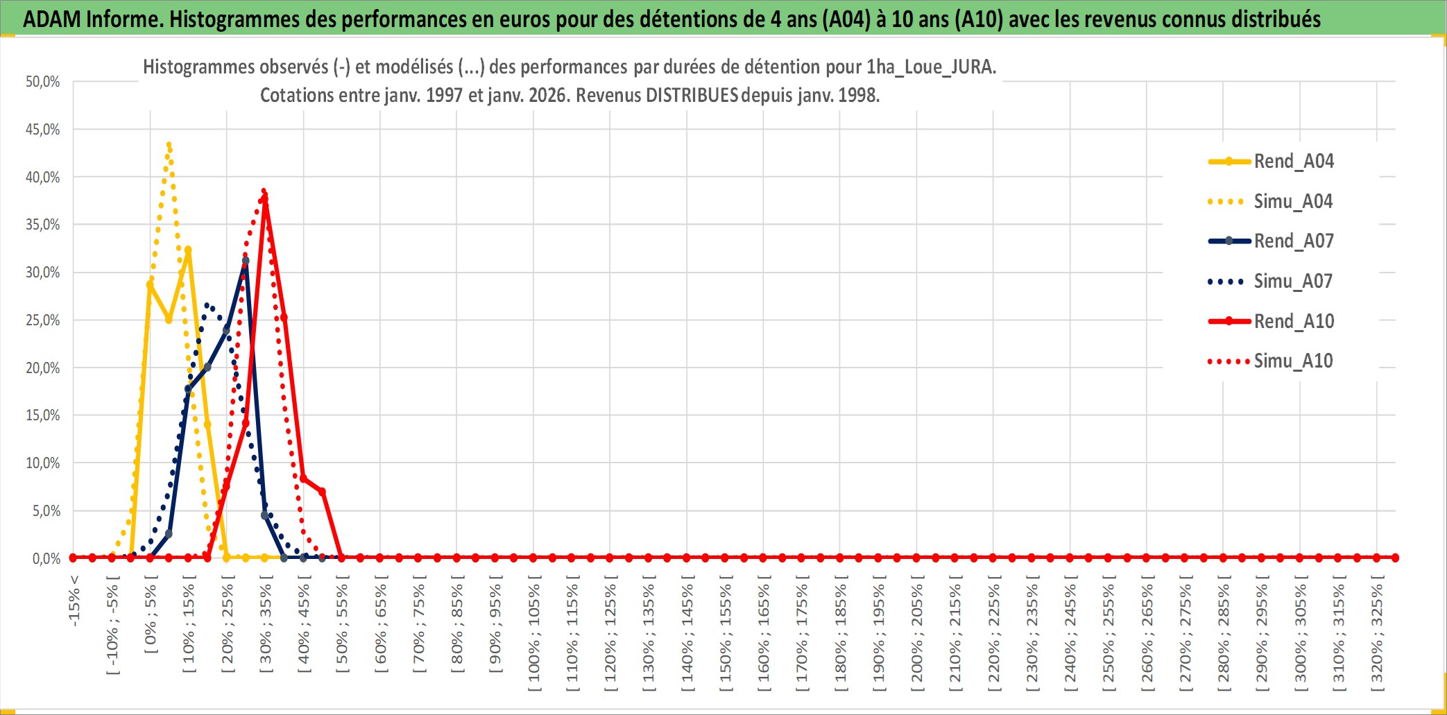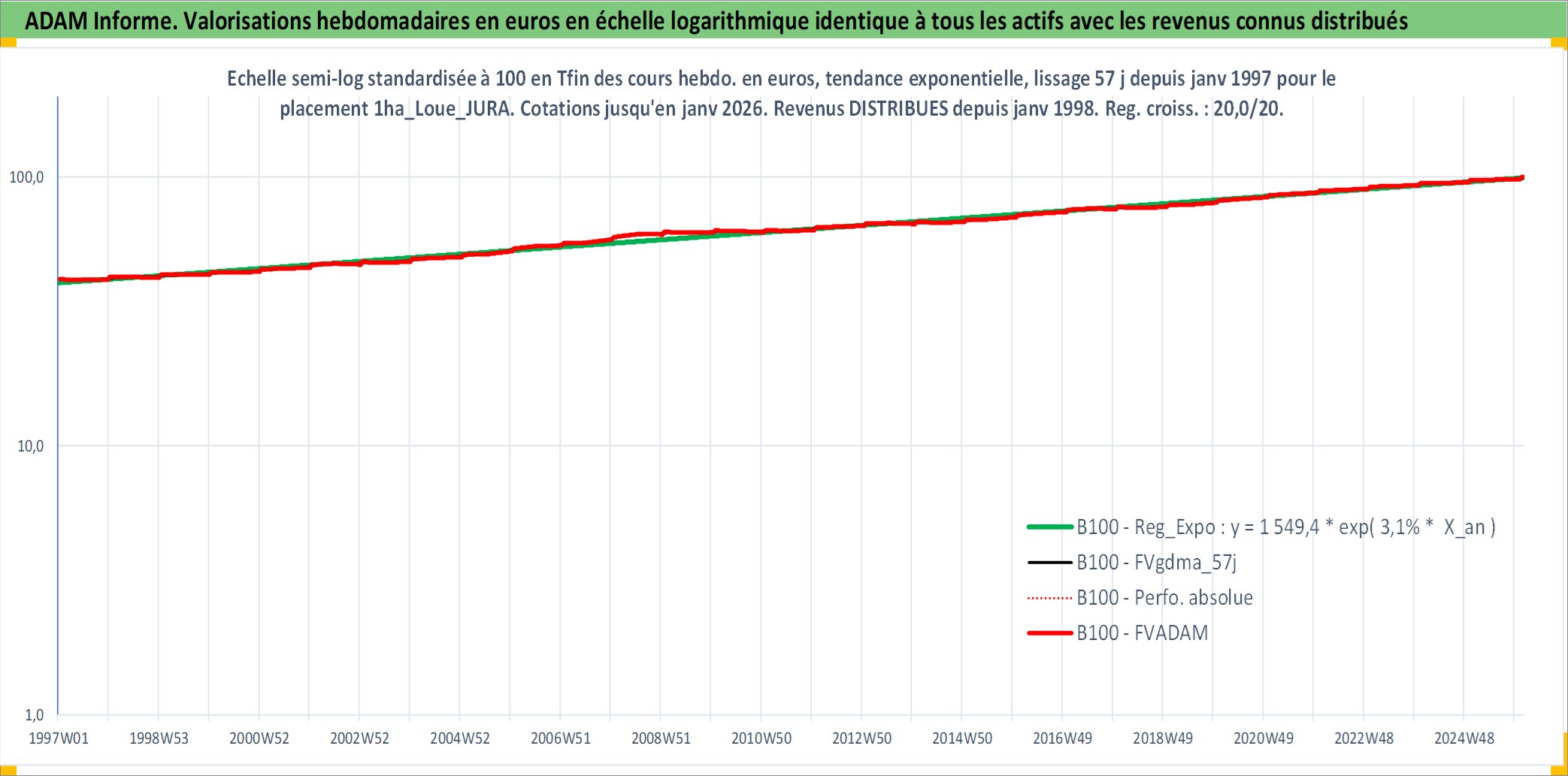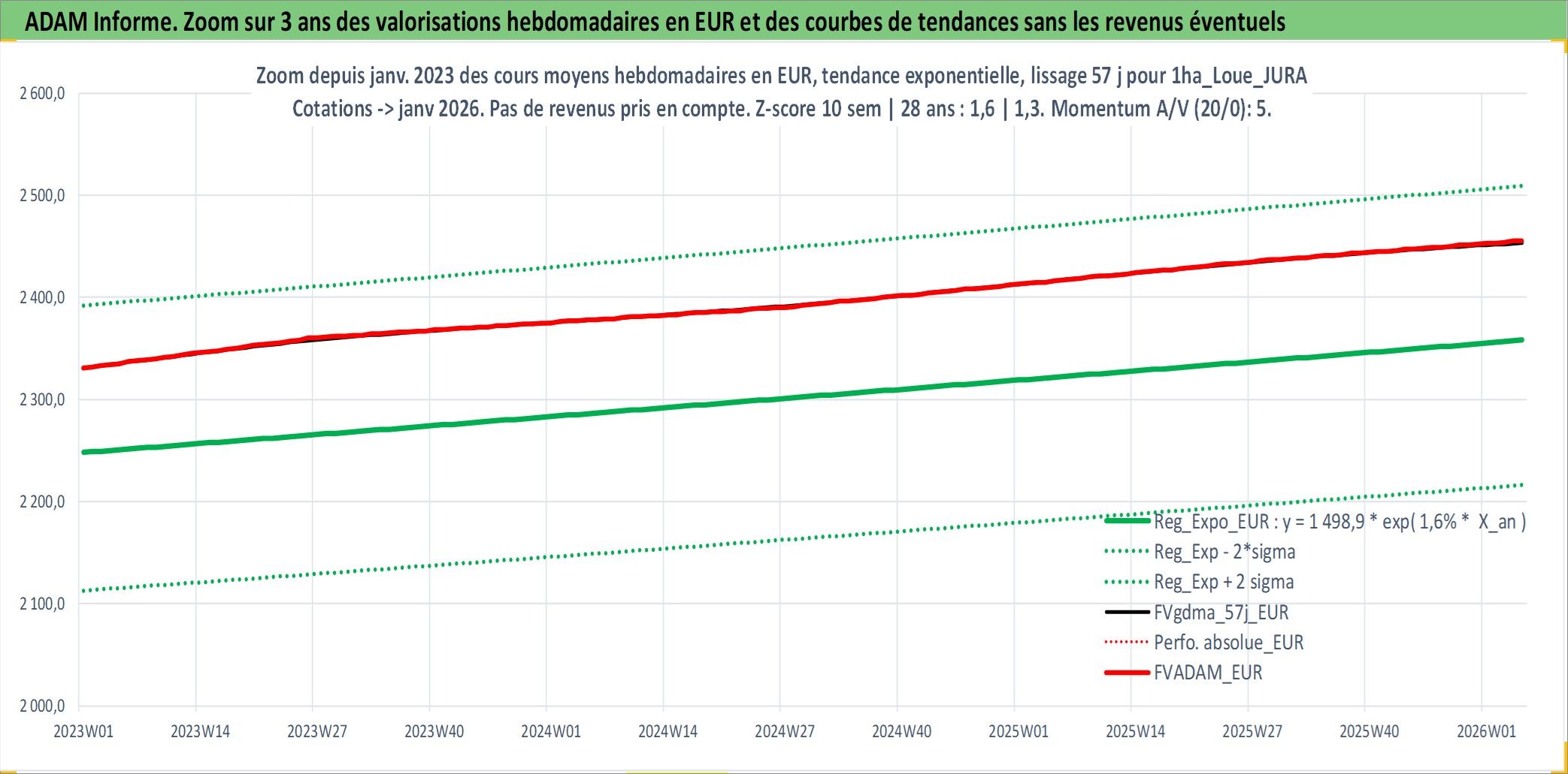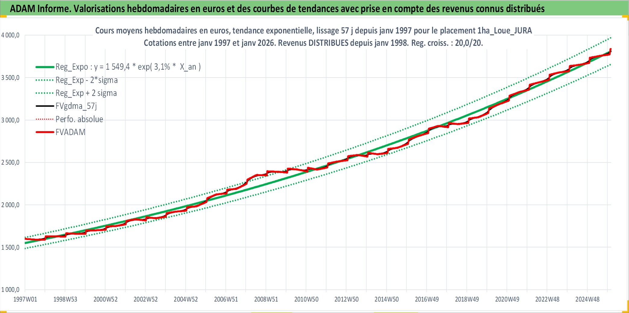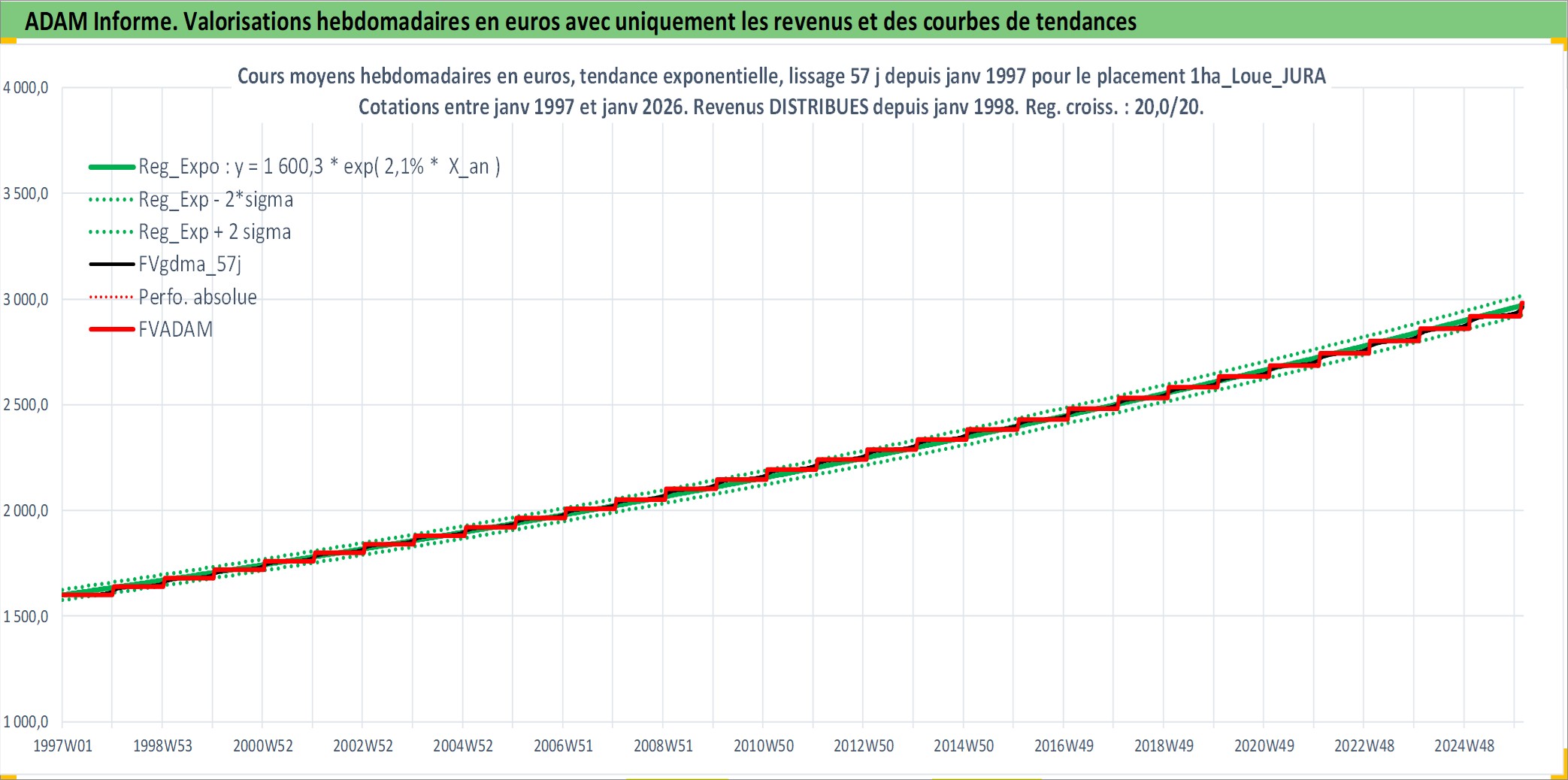 Site dédié aux investisseursPage dédiée sur site financeAnalyse des valorisations hebdomadaires de l'actif 1ha_Loue_JURA. Cet actif est cote en EUR. Les valorisations couvrent les semaines 1997W01 a 2026W05. Les fermages de ce bien foncier sont pris egaux a 2,5% annuels de la valeur venale du bien.