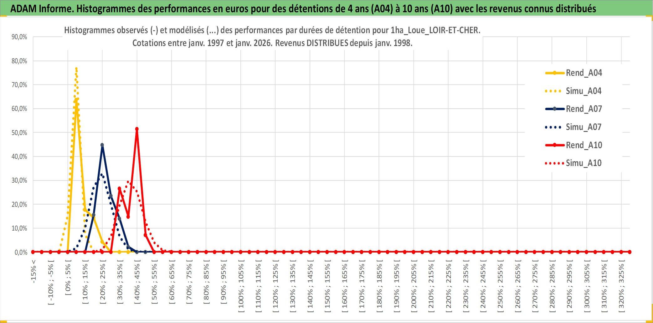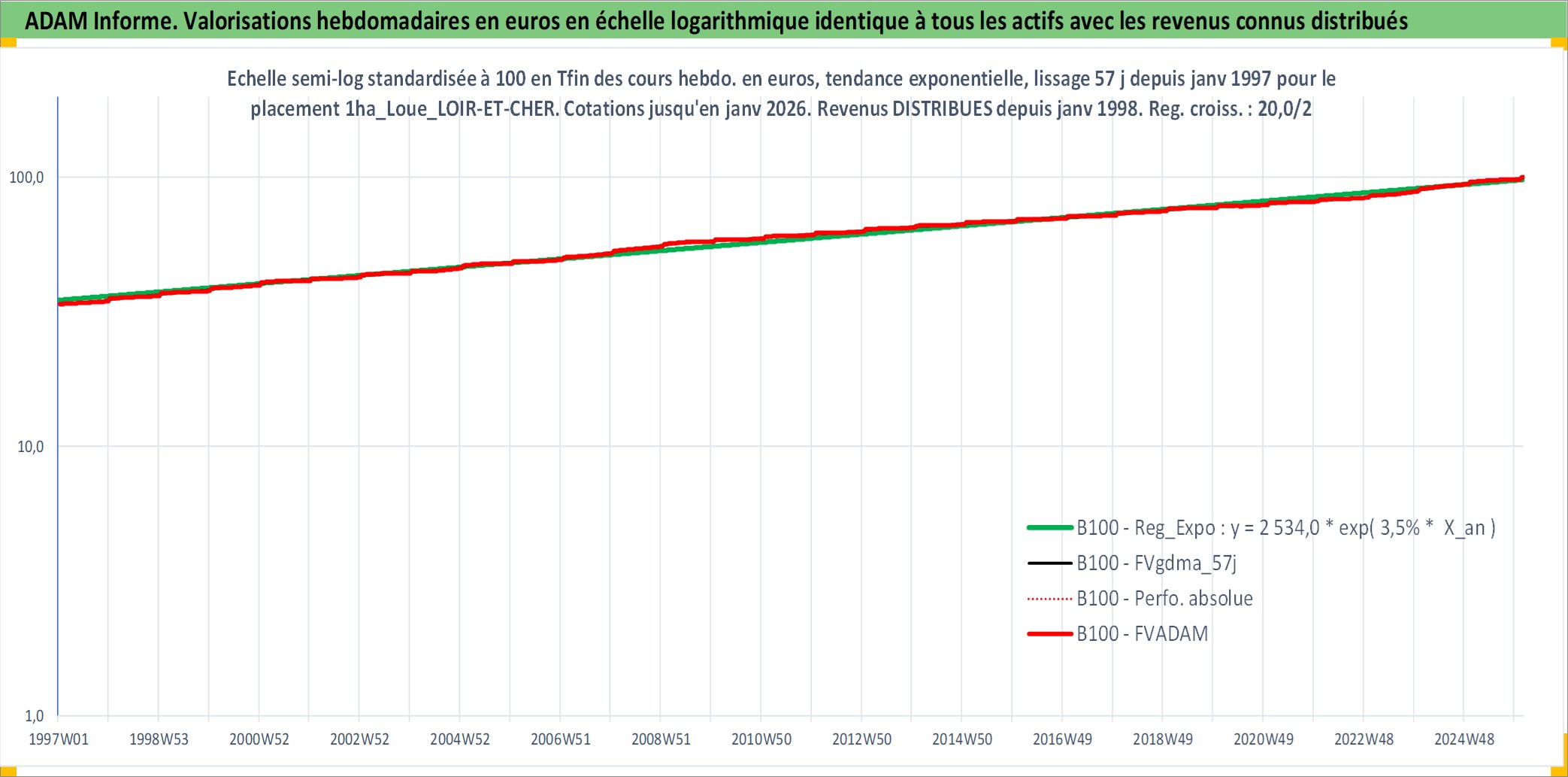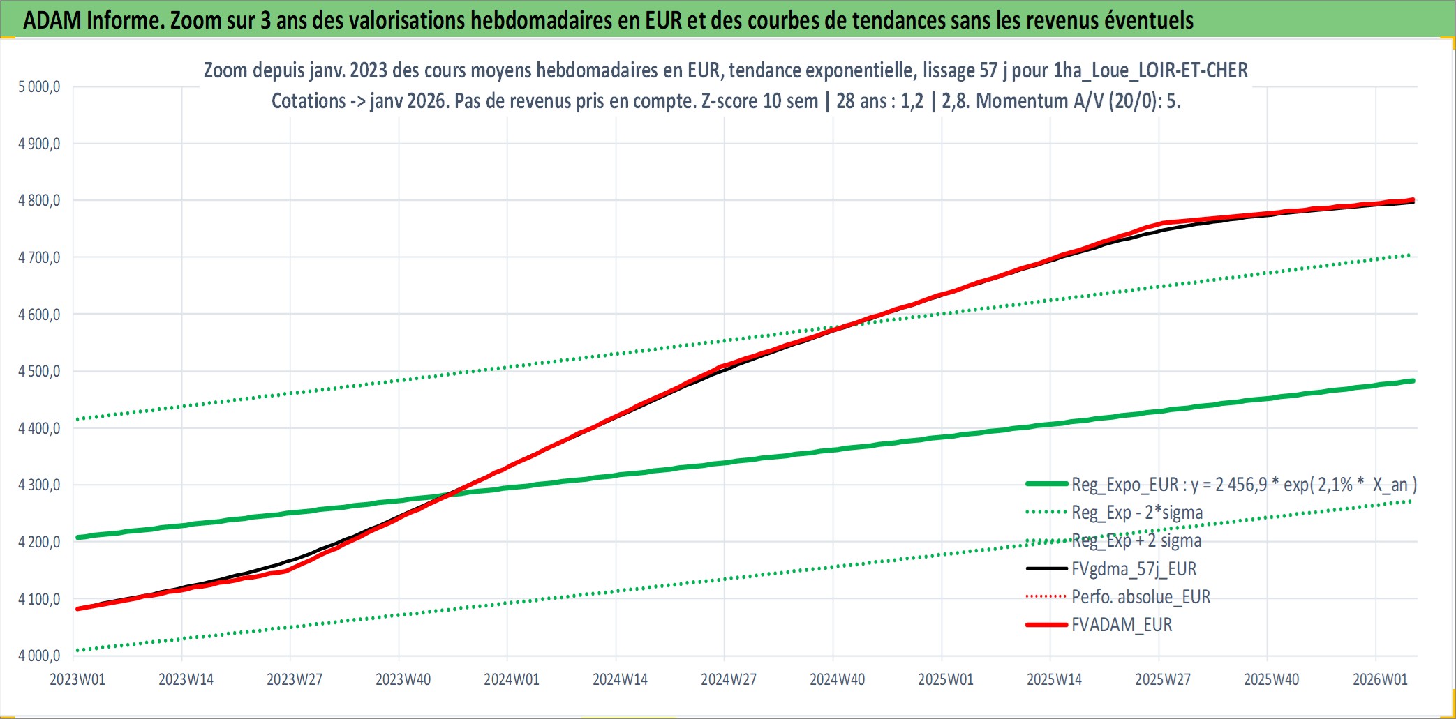 Site dédié aux investisseursPage dédiée sur site financeAnalyse des valorisations hebdomadaires de l'actif 1ha_Loue_LOIR-ET-CHER. Cet actif est cote en EUR. Les valorisations couvrent les semaines 1997W01 a 2026W05. Les fermages de ce bien foncier sont pris egaux a 2,5% annuels de la valeur venale du bien.