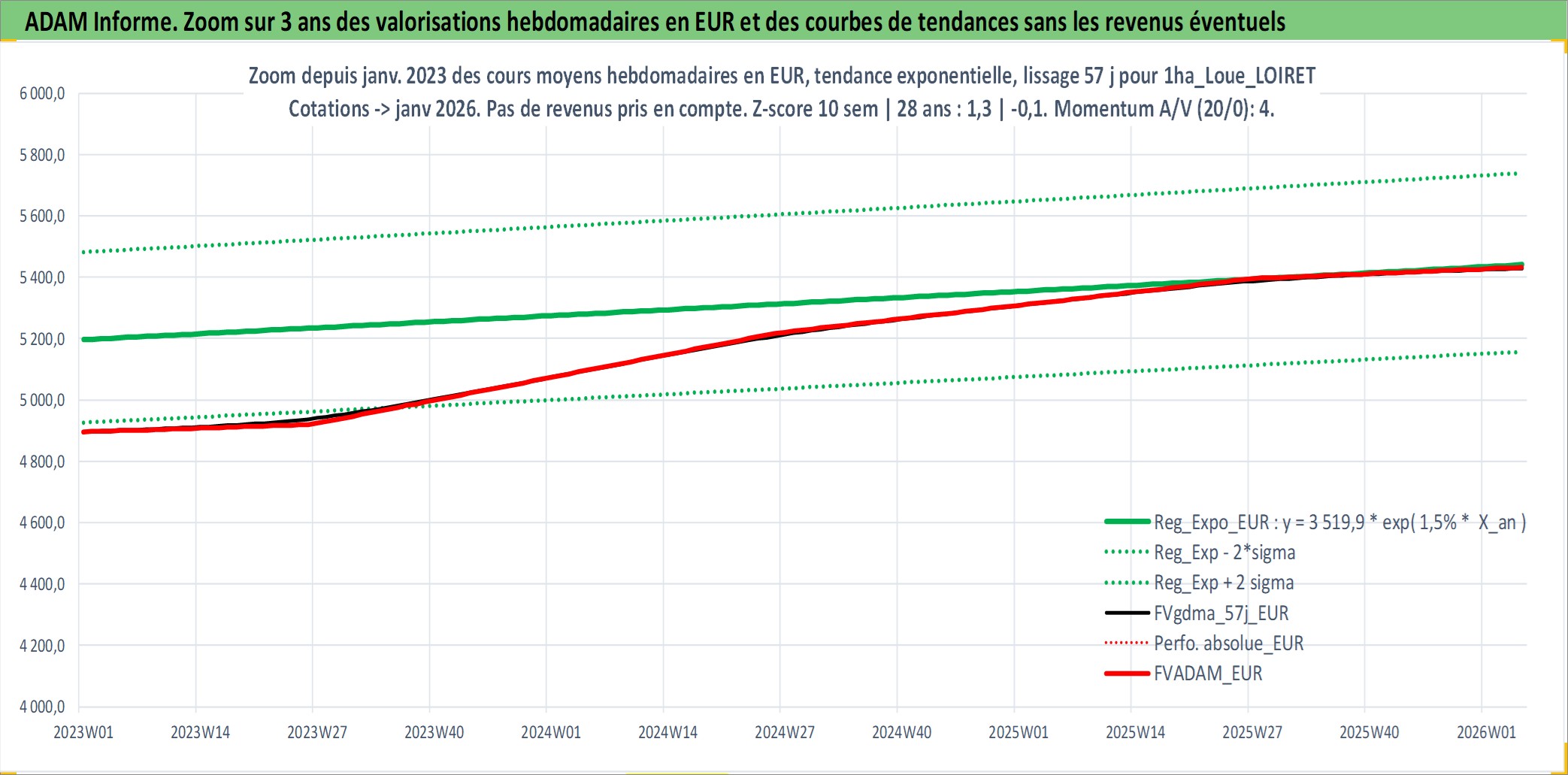 Site dédié aux investisseursPage dédiée sur site financeAnalyse des valorisations hebdomadaires de l'actif 1ha_Loue_LOIRET. Cet actif est cote en EUR. Les valorisations couvrent les semaines 1997W01 a 2026W05. Les fermages de ce bien foncier sont pris egaux a 2,5% annuels de la valeur venale du bien.