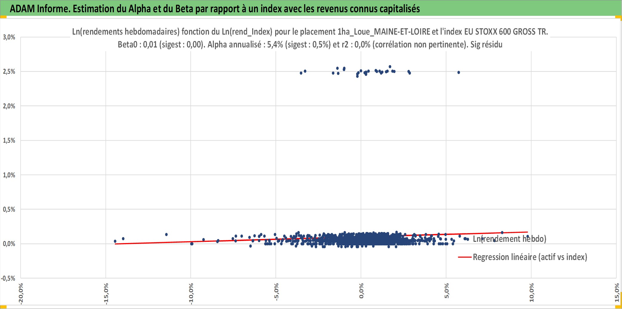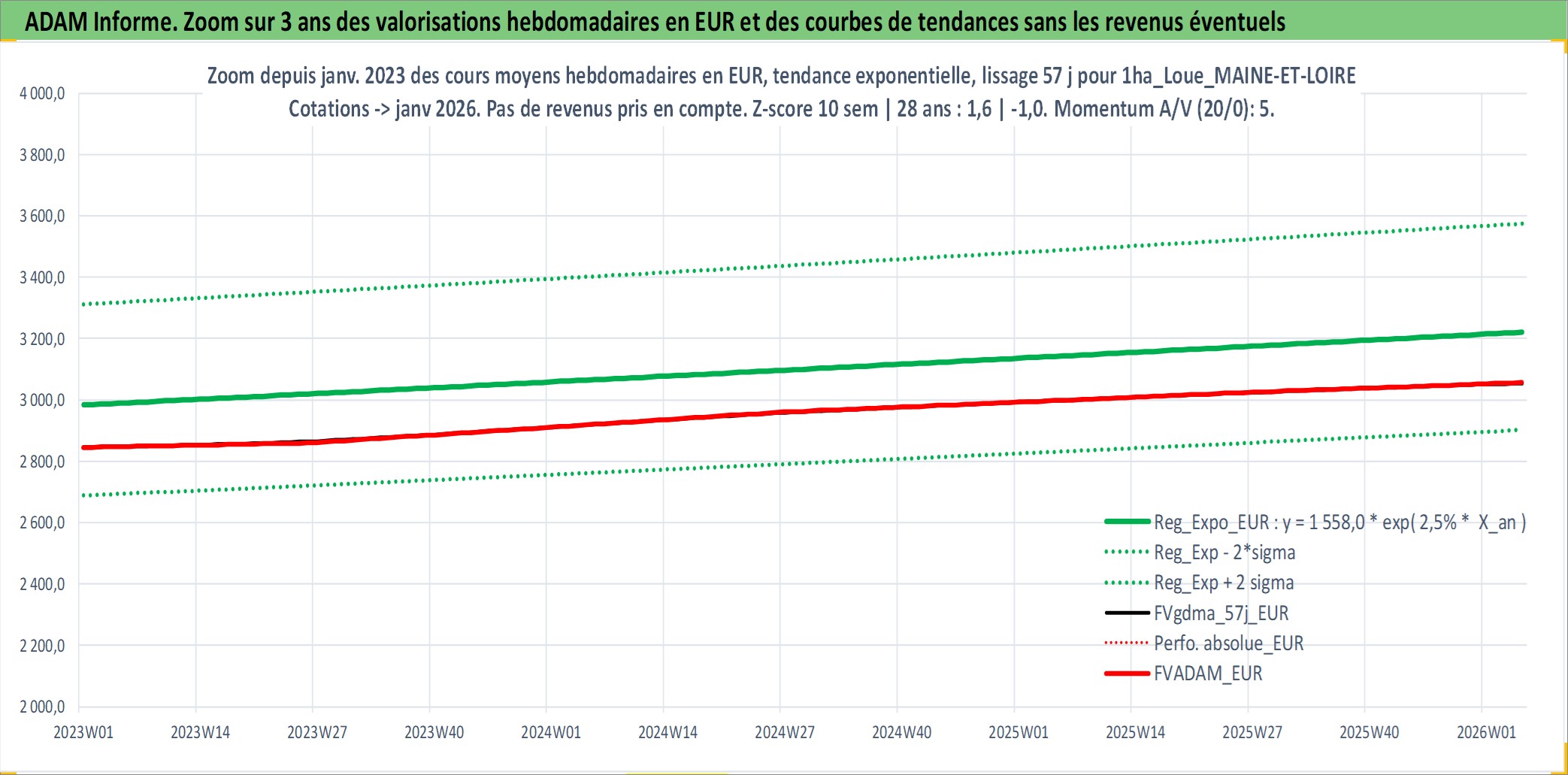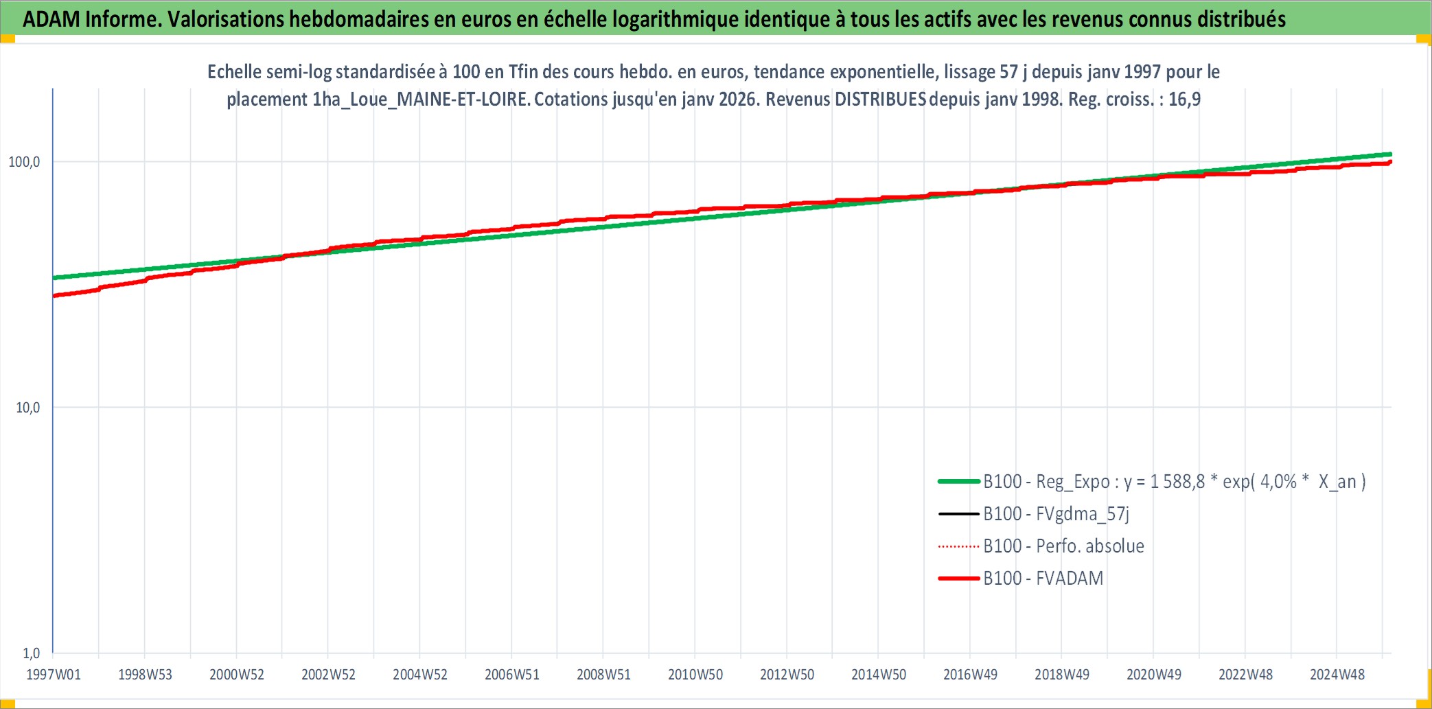 Site dédié aux investisseursPage dédiée sur site financeAnalyse des valorisations hebdomadaires de l'actif 1ha_Loue_MAINE-ET-LOIRE. Cet actif est cote en EUR. Les valorisations couvrent les semaines 1997W01 a 2026W05. Les fermages de ce bien foncier sont pris egaux a 2,5% annuels de la valeur venale du bien.