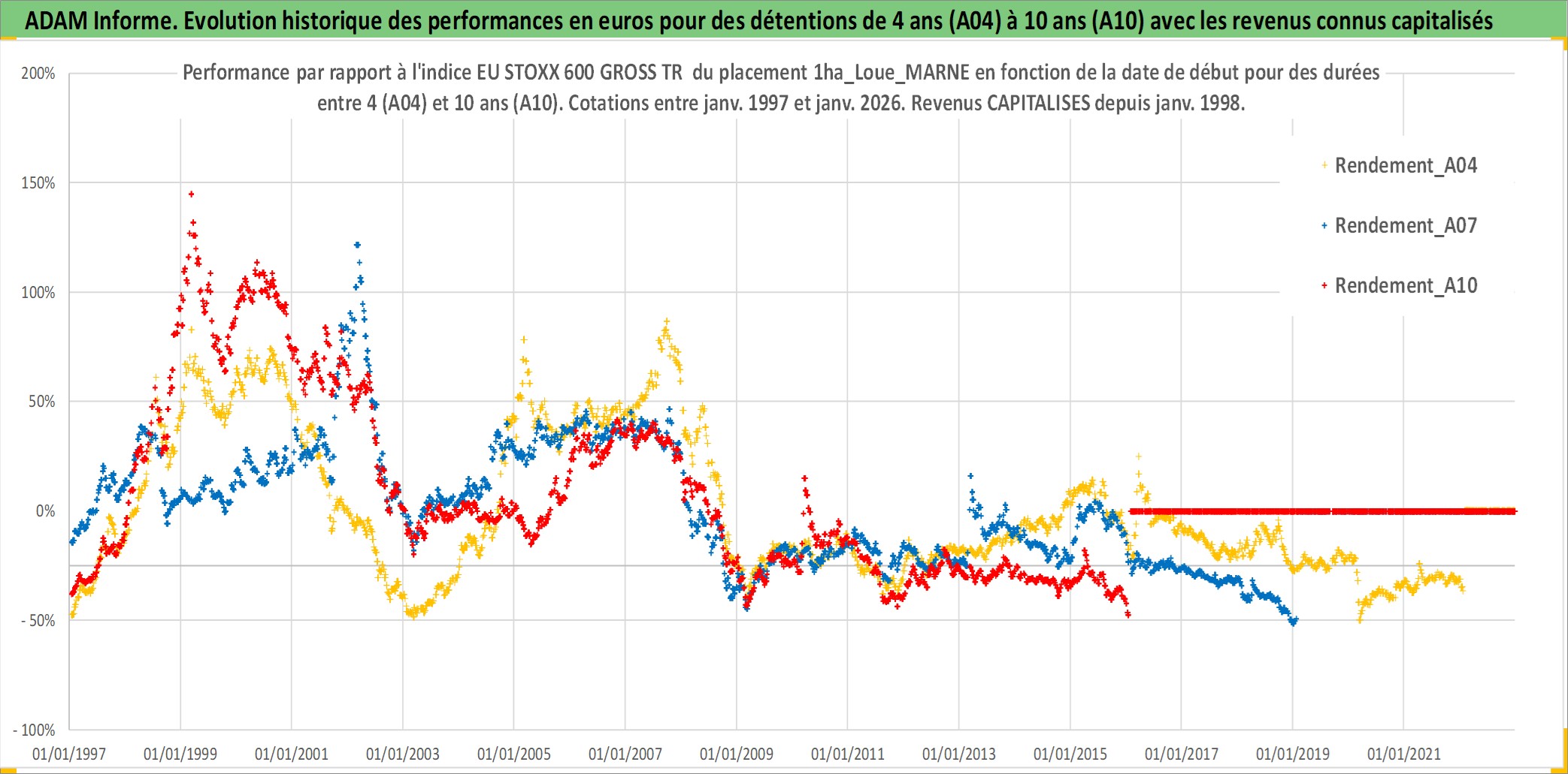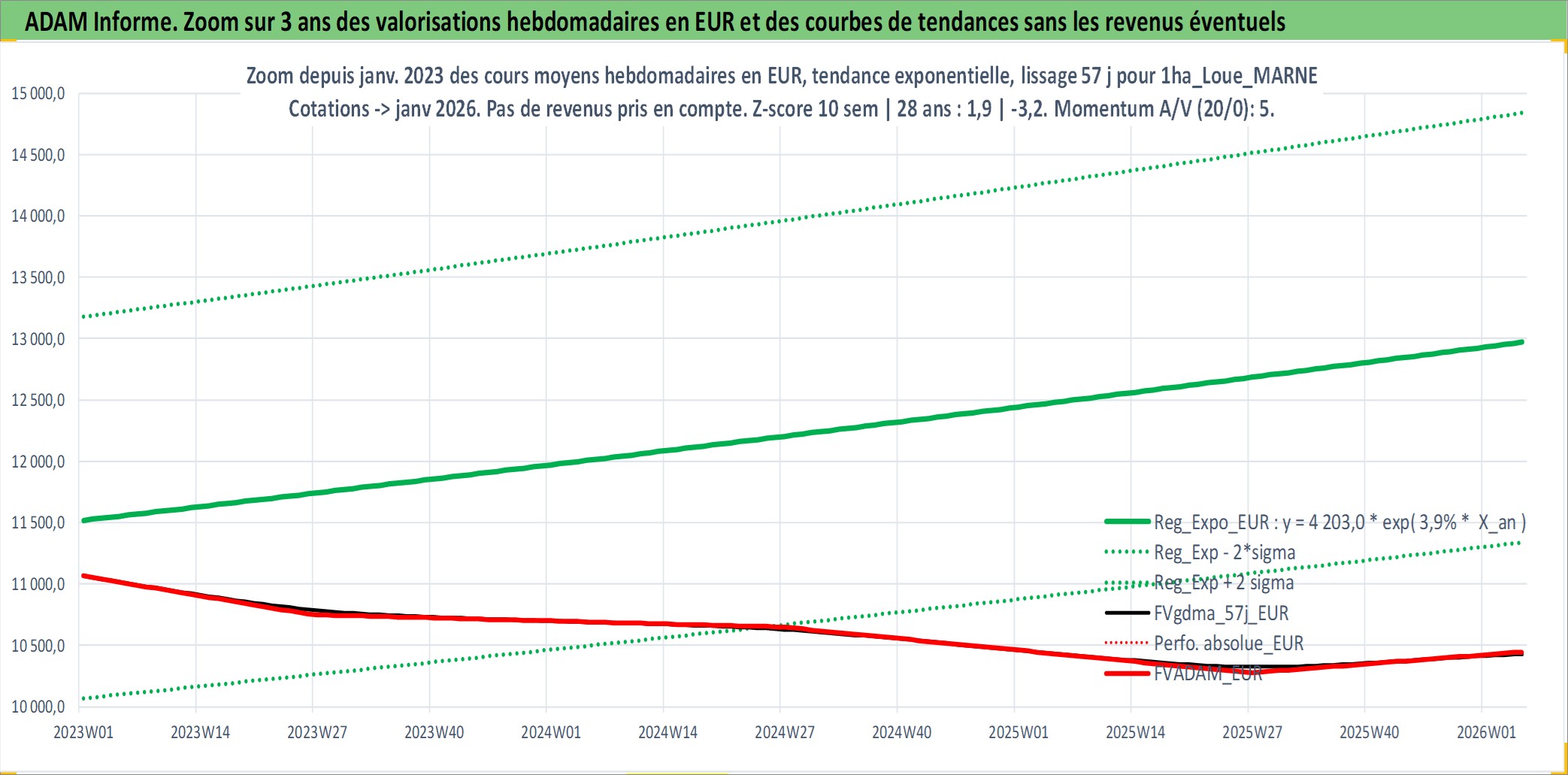 Site dédié aux investisseursPage dédiée sur site financeAnalyse des valorisations hebdomadaires de l'actif 1ha_Loue_MARNE. Cet actif est cote en EUR. Les valorisations couvrent les semaines 1997W01 a 2026W05. Les fermages de ce bien foncier sont pris egaux a 2,5% annuels de la valeur venale du bien.