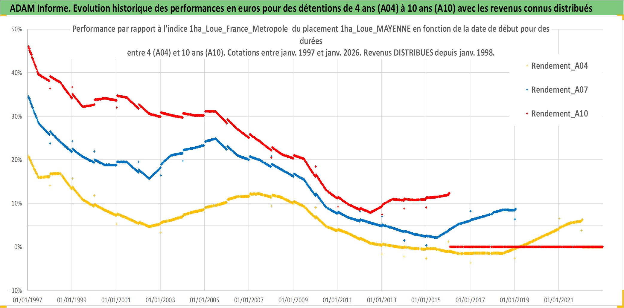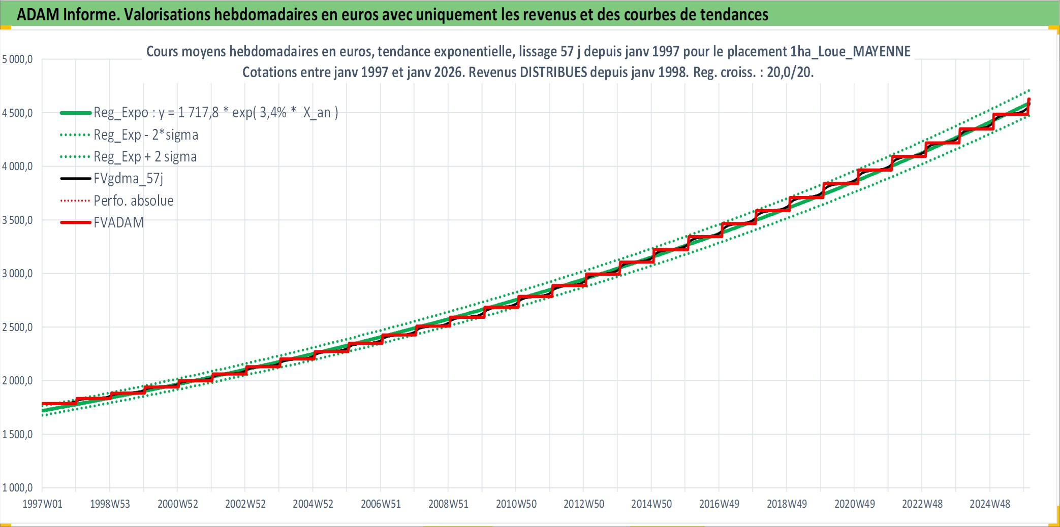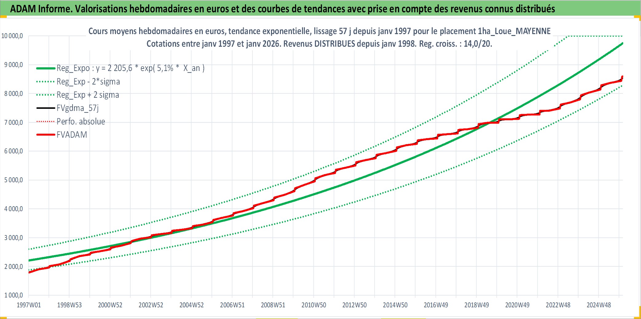 Site dédié aux investisseursPage dédiée sur site financeAnalyse des valorisations hebdomadaires de l'actif 1ha_Loue_MAYENNE. Cet actif est cote en EUR. Les valorisations couvrent les semaines 1997W01 a 2026W05. Les fermages de ce bien foncier sont pris egaux a 2,5% annuels de la valeur venale du bien.
