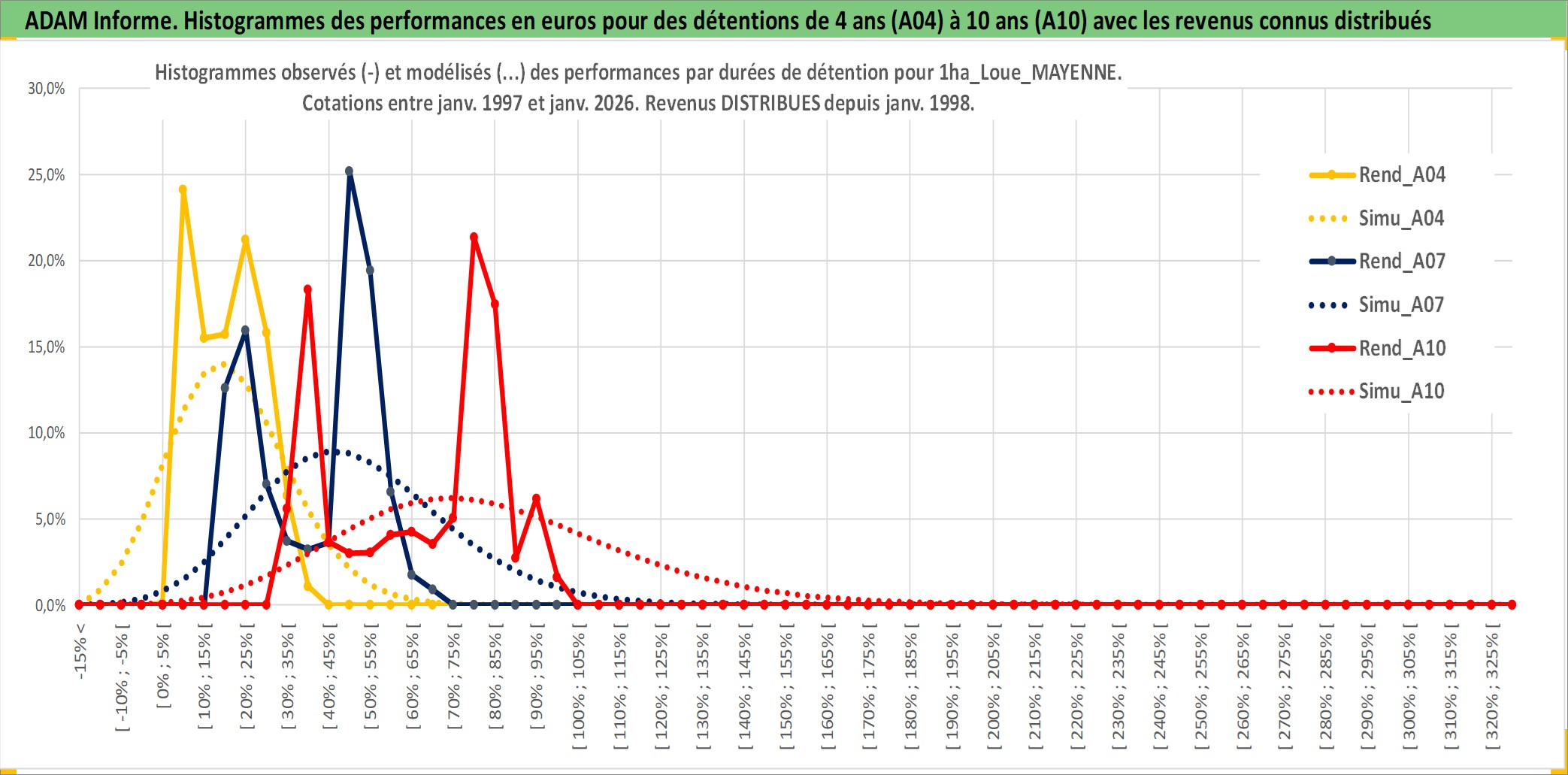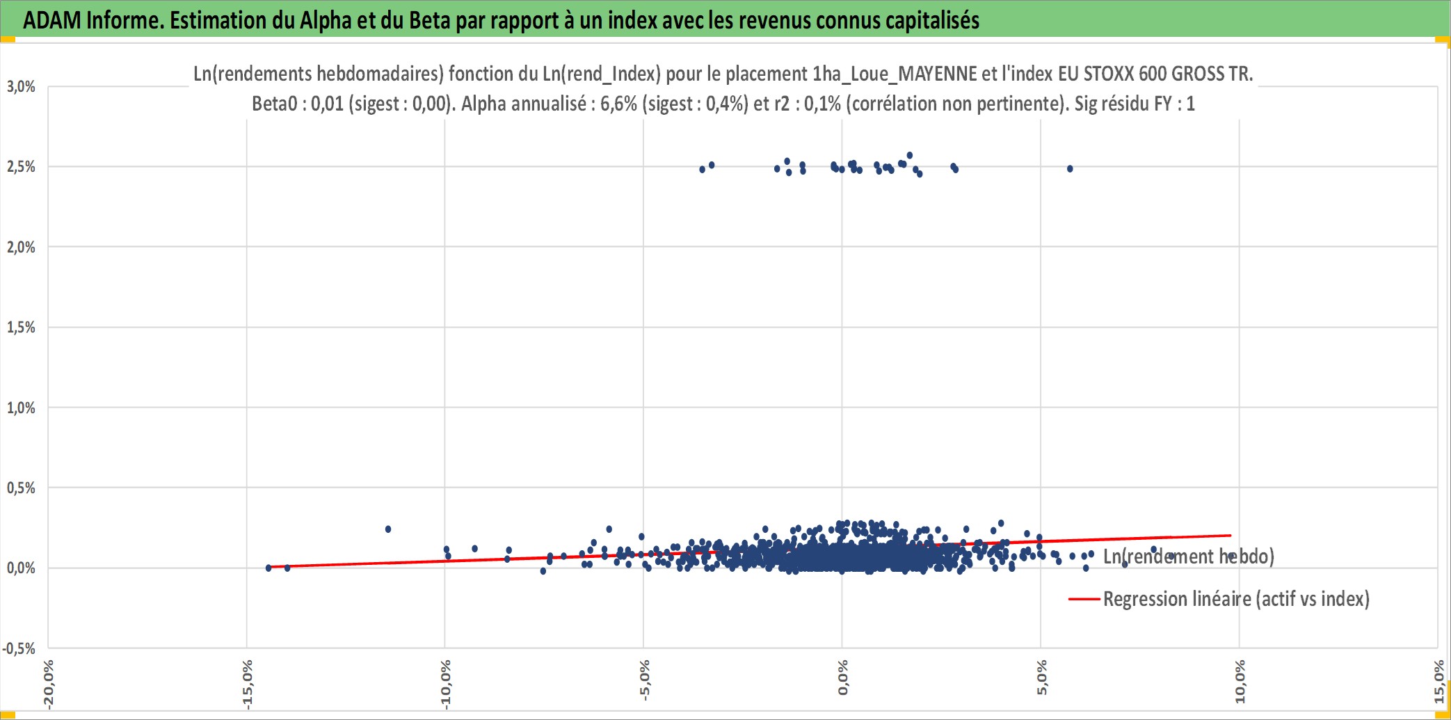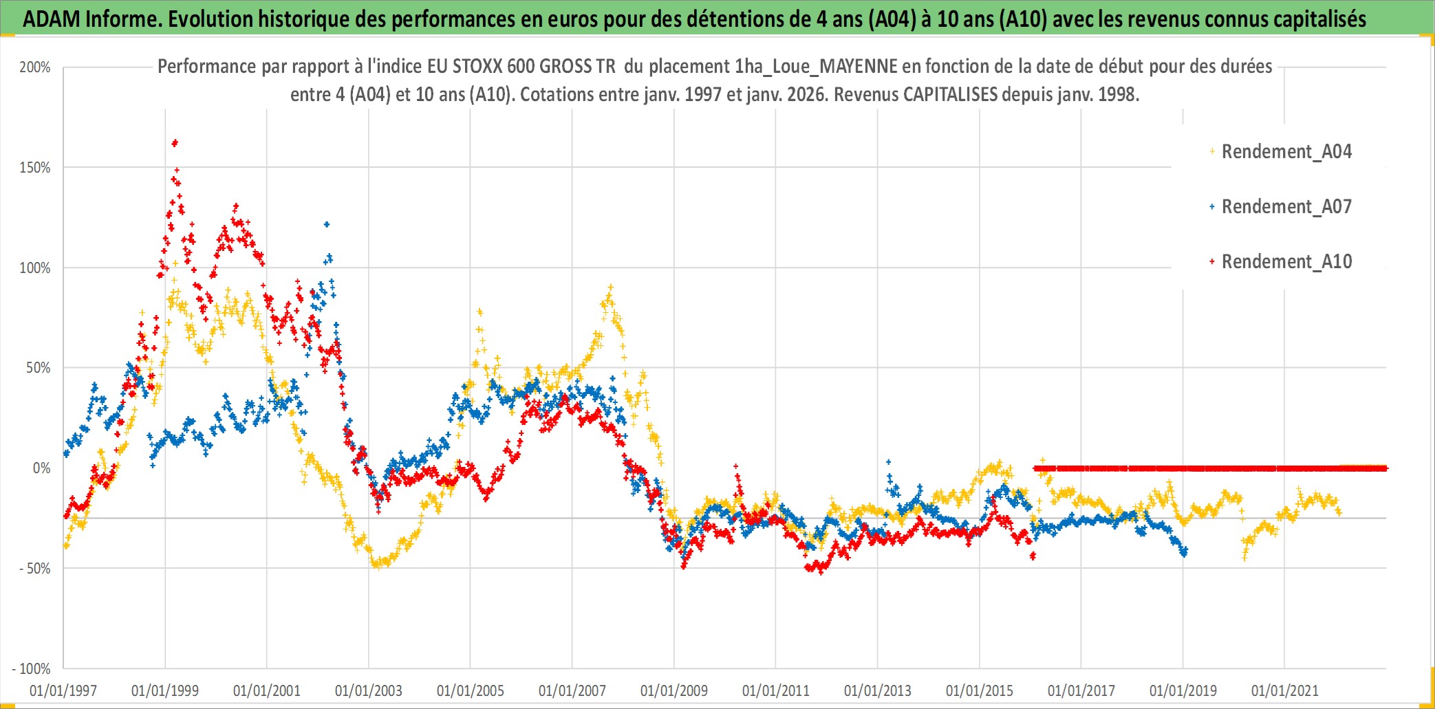 Site dédié aux investisseursPage dédiée sur site financeAnalyse des valorisations hebdomadaires de l'actif 1ha_Loue_MAYENNE. Cet actif est cote en EUR. Les valorisations couvrent les semaines 1997W01 a 2026W05. Les fermages de ce bien foncier sont pris egaux a 2,5% annuels de la valeur venale du bien.
