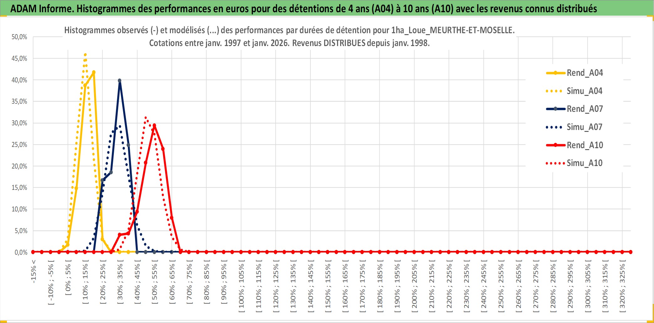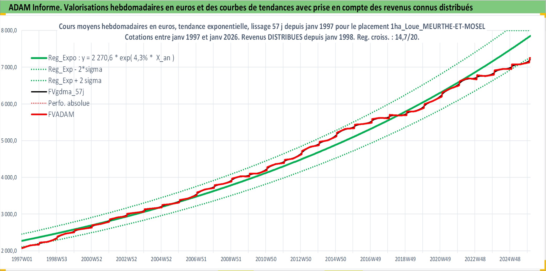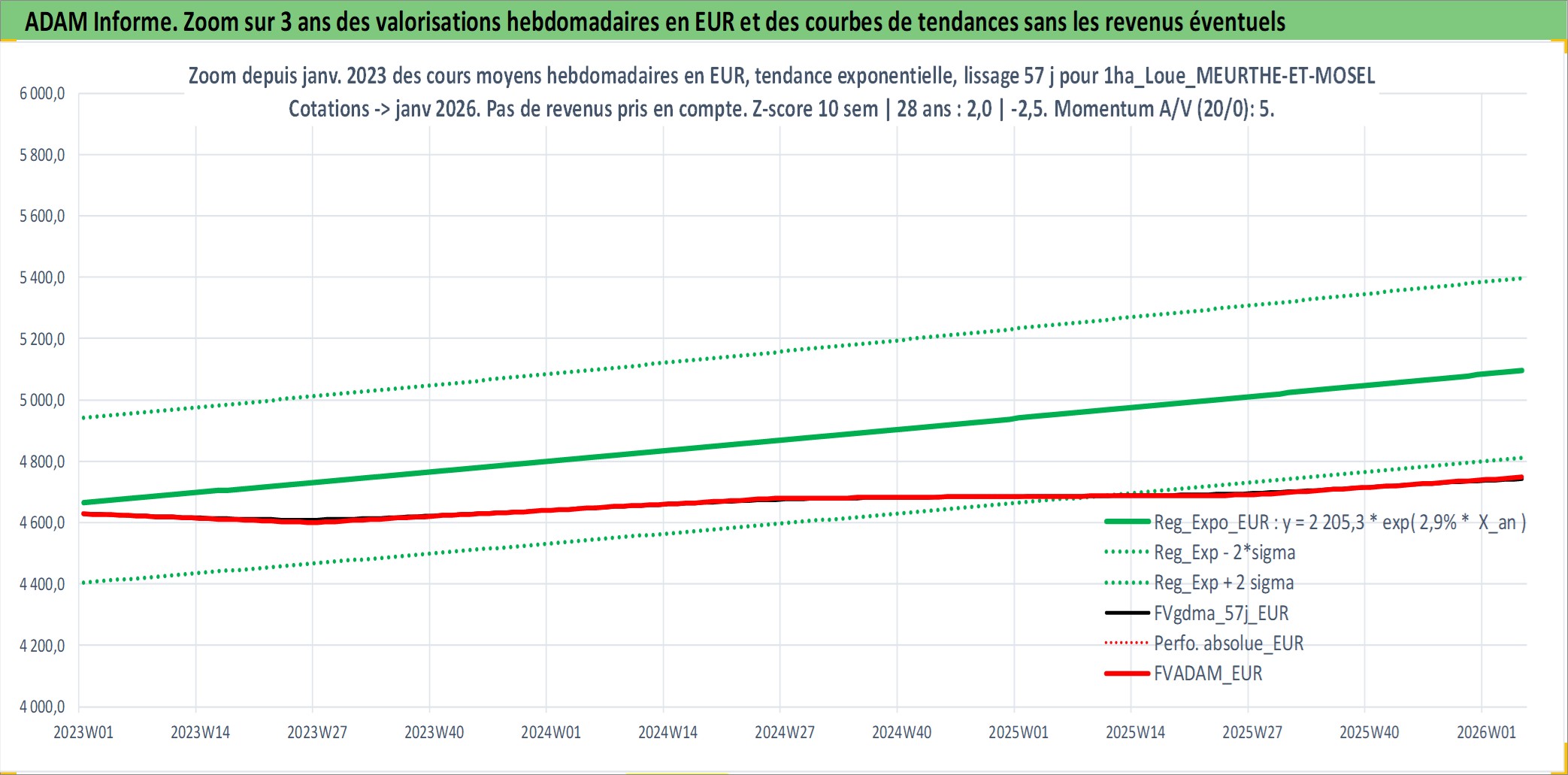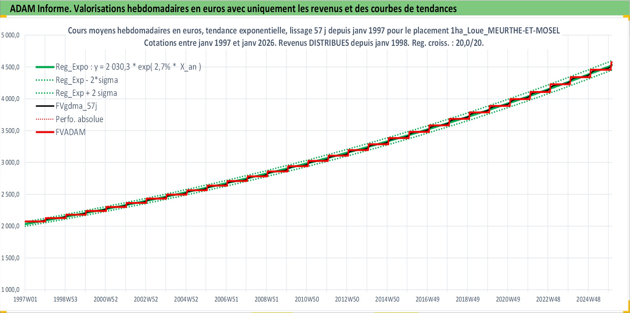 Site dédié aux investisseursPage dédiée sur site financeAnalyse des valorisations hebdomadaires de l'actif 1ha_Loue_MEURTHE-ET-MOSELLE. Cet actif est cote en EUR. Les valorisations couvrent les semaines 1997W01 a 2026W05. Les fermages de ce bien foncier sont pris egaux a 2,5% annuels de la valeur venale du bien.