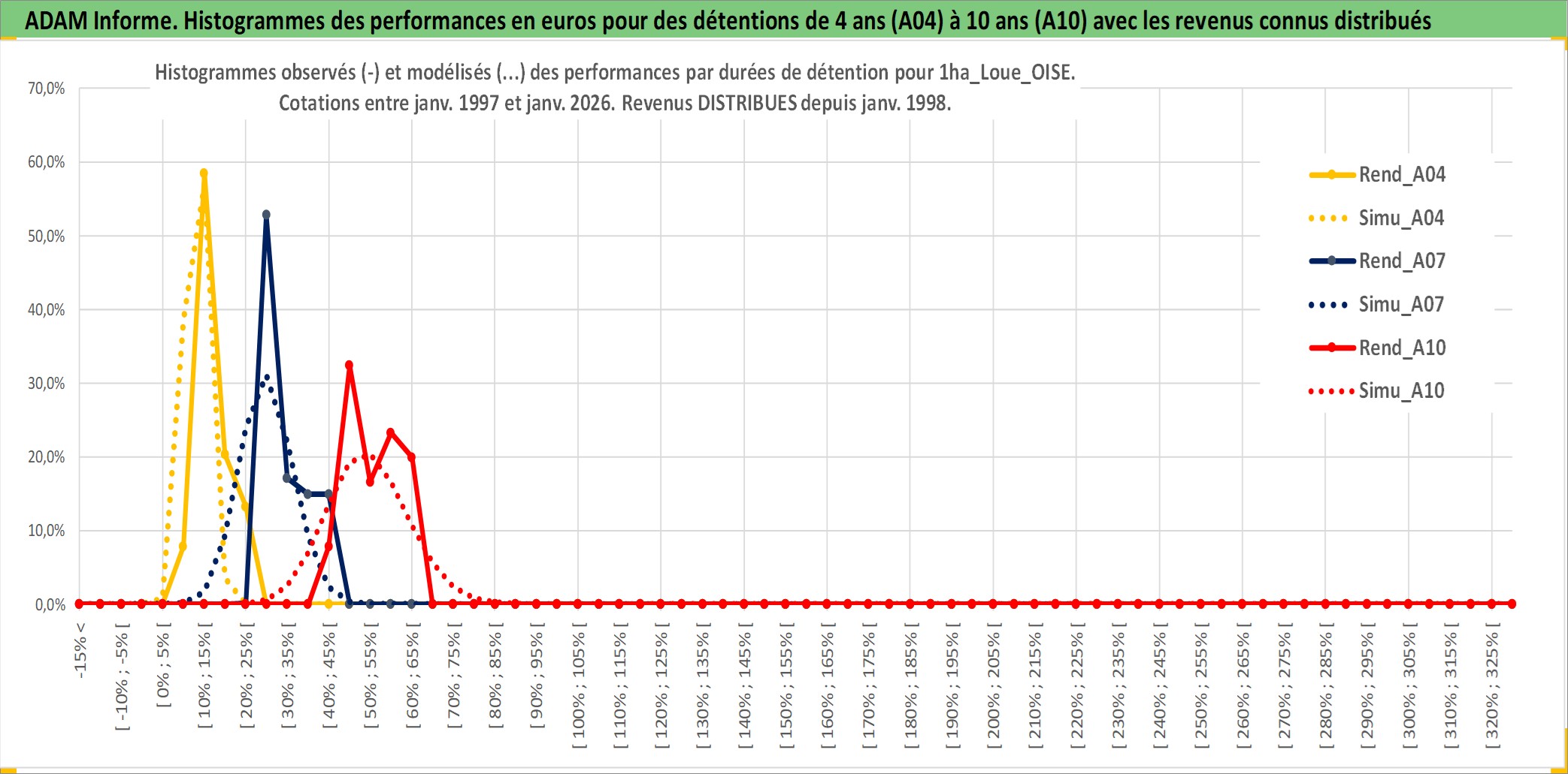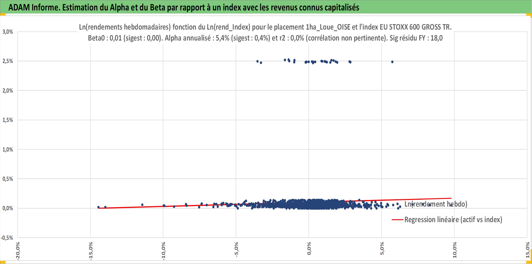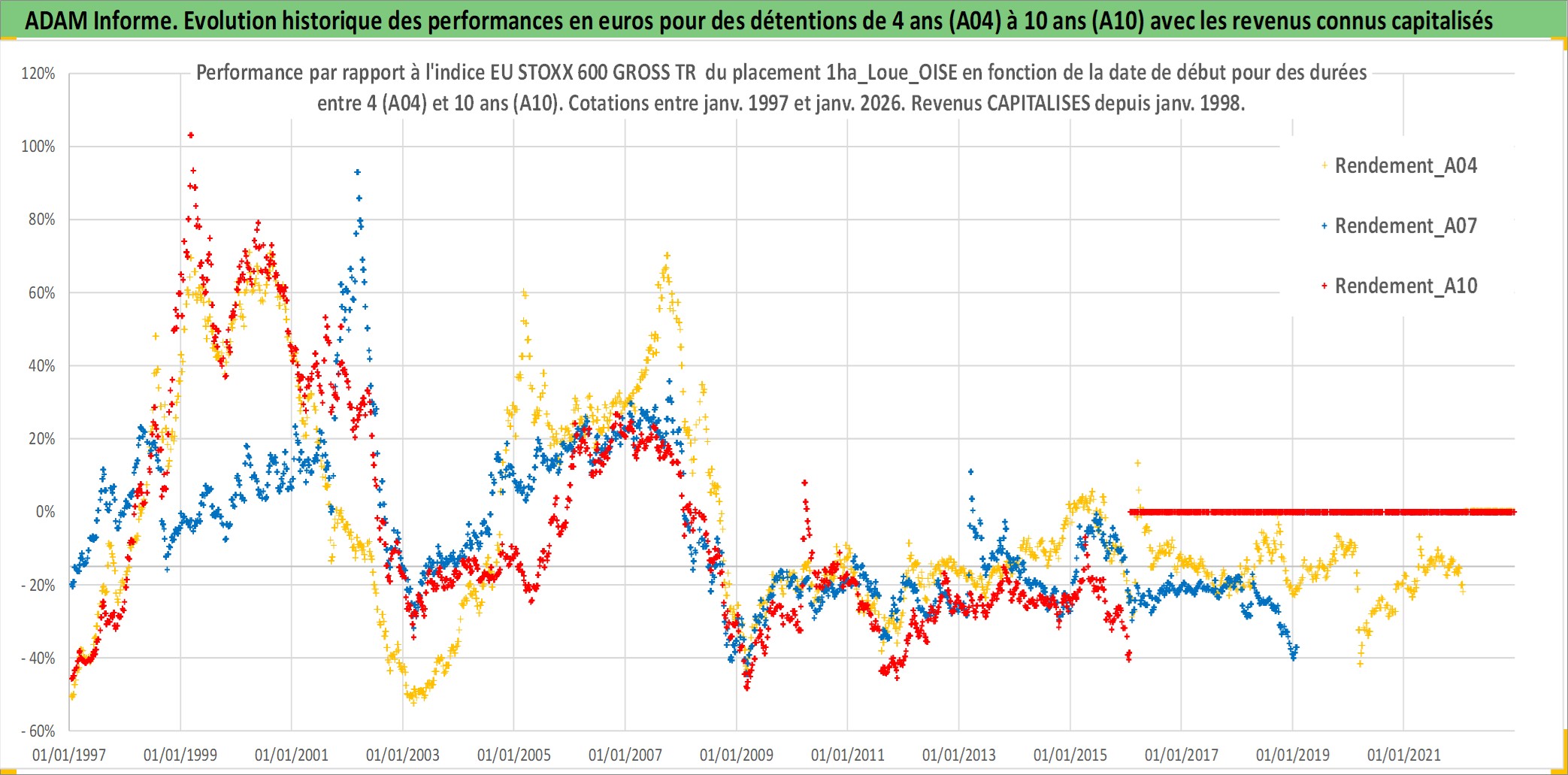 Site dédié aux investisseursPage dédiée sur site financeAnalyse des valorisations hebdomadaires de l'actif 1ha_Loue_OISE. Cet actif est cote en EUR. Les valorisations couvrent les semaines 1997W01 a 2026W05. Les fermages de ce bien foncier sont pris egaux a 2,5% annuels de la valeur venale du bien.