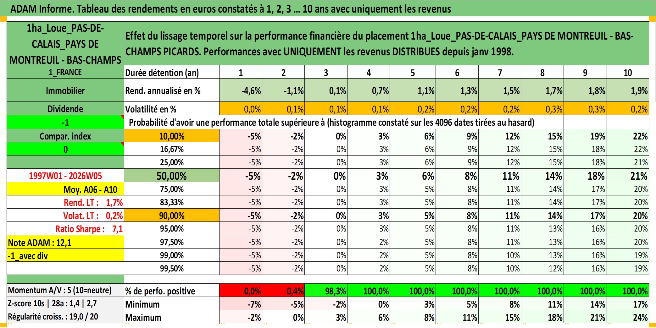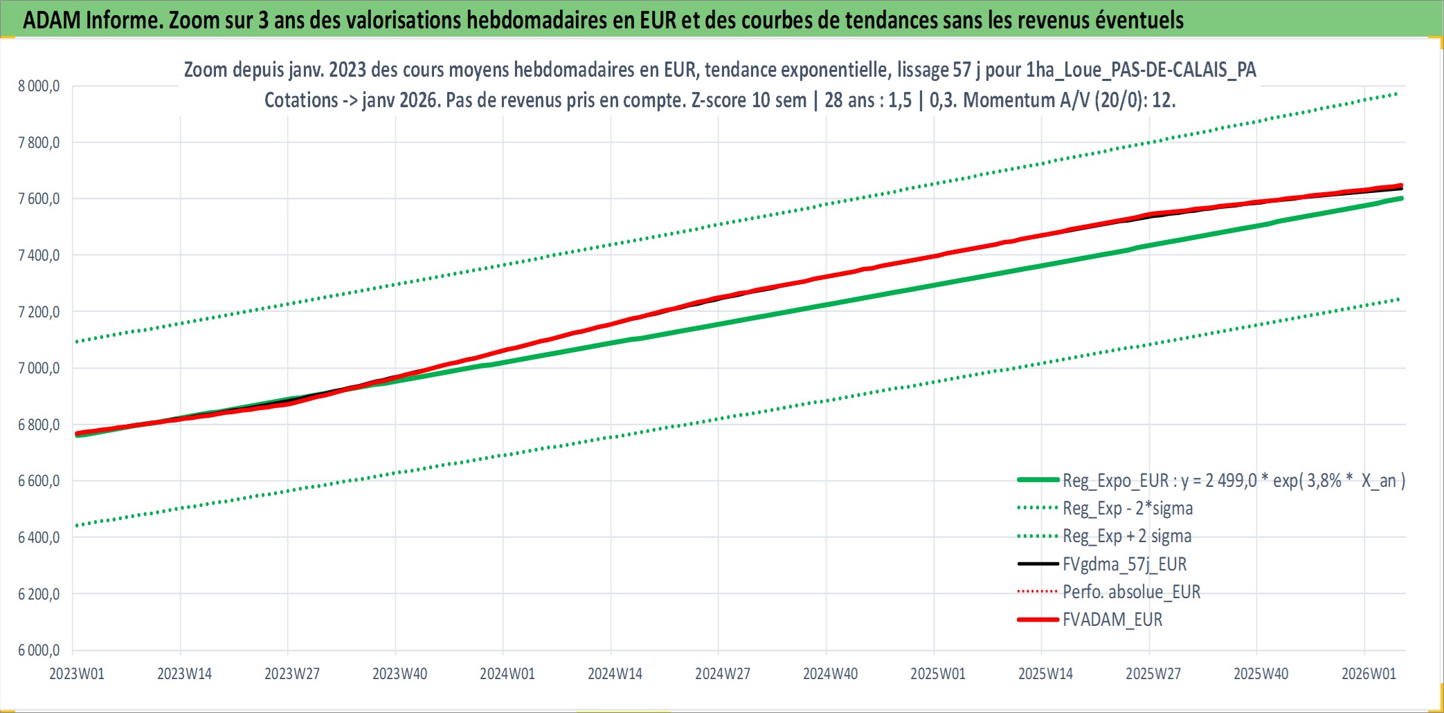 Site dédié aux investisseursPage dédiée sur site financeAnalyse des valorisations hebdomadaires de l'actif 1ha_Loue_PAS-DE-CALAIS_PAYS DE MONTREUIL - BAS-CHAMPS PICARDS. Cet actif est cote en EUR. Les valorisations couvrent les semaines 1997W01 a 2026W05. Les fermages de ce bien foncier sont pris egaux a 2,5% annuels de la valeur venale du bien.