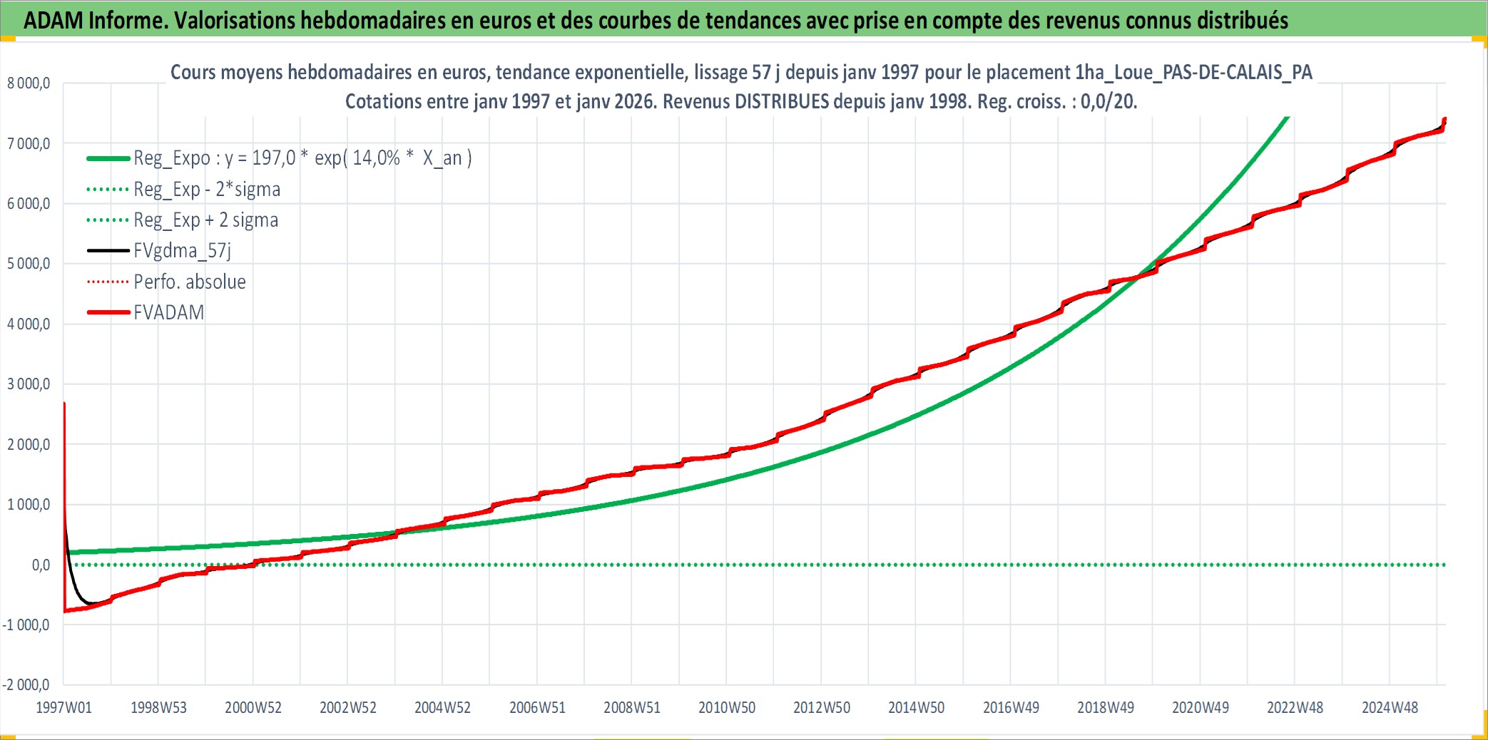 Site dédié aux investisseursPage dédiée sur site financeAnalyse des valorisations hebdomadaires de l'actif 1ha_Loue_PAS-DE-CALAIS_PAYS AIRE - PLAINE DE LA LYS - BETHUNOIS. Cet actif est cote en EUR. Les valorisations couvrent les semaines 1997W01 a 2026W05. Les fermages de ce bien foncier sont pris egaux a 2,5% annuels de la valeur venale du bien.