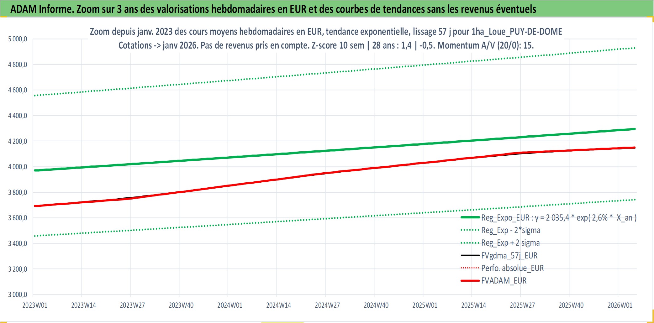 Site dédié aux investisseursPage dédiée sur site financeAnalyse des valorisations hebdomadaires de l'actif 1ha_Loue_PUY-DE-DOME. Cet actif est cote en EUR. Les valorisations couvrent les semaines 1997W01 a 2026W05. Les fermages de ce bien foncier sont pris egaux a 2,5% annuels de la valeur venale du bien.