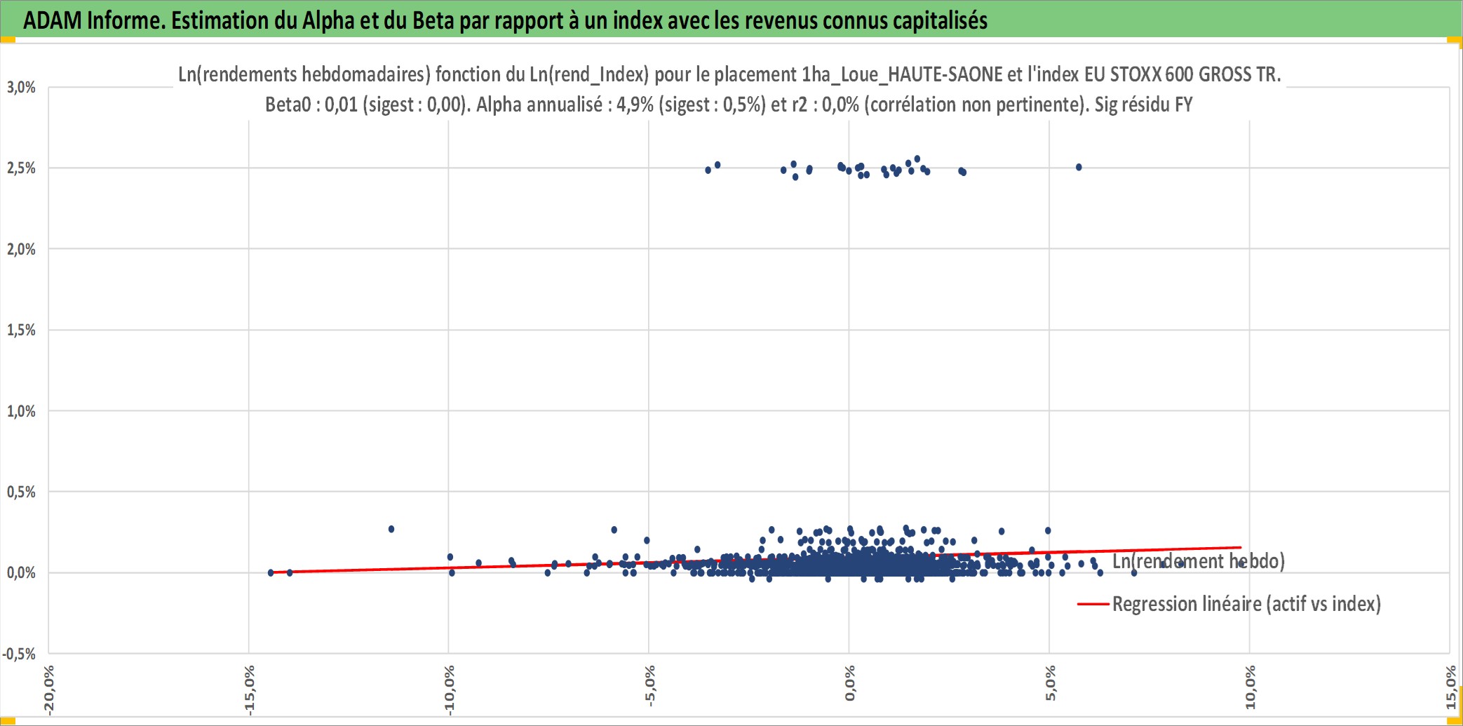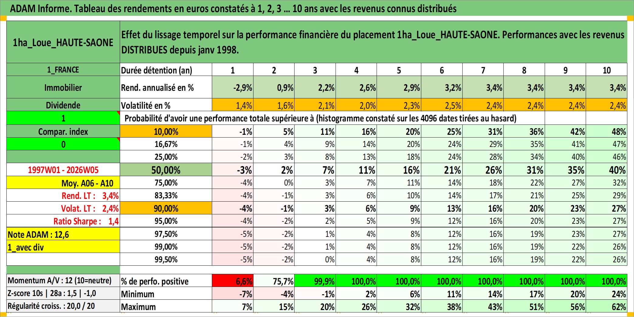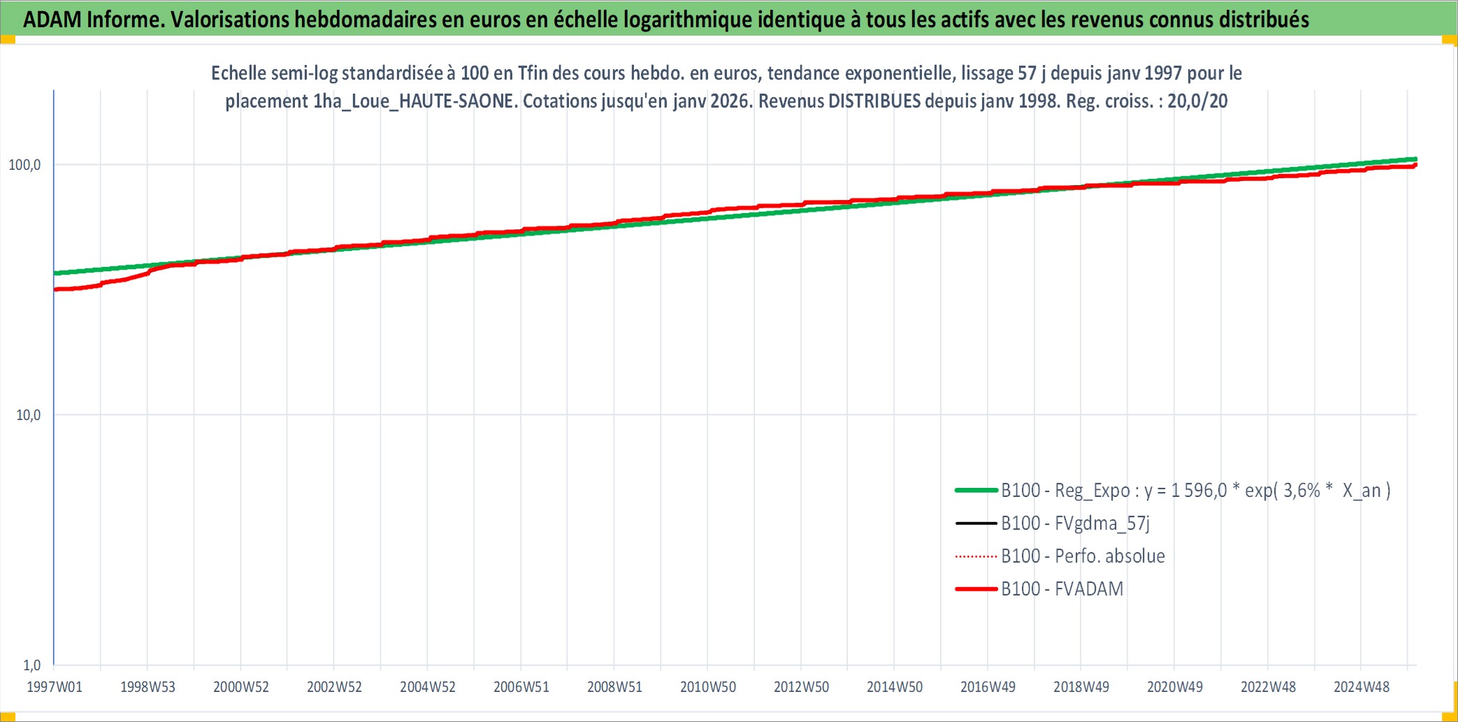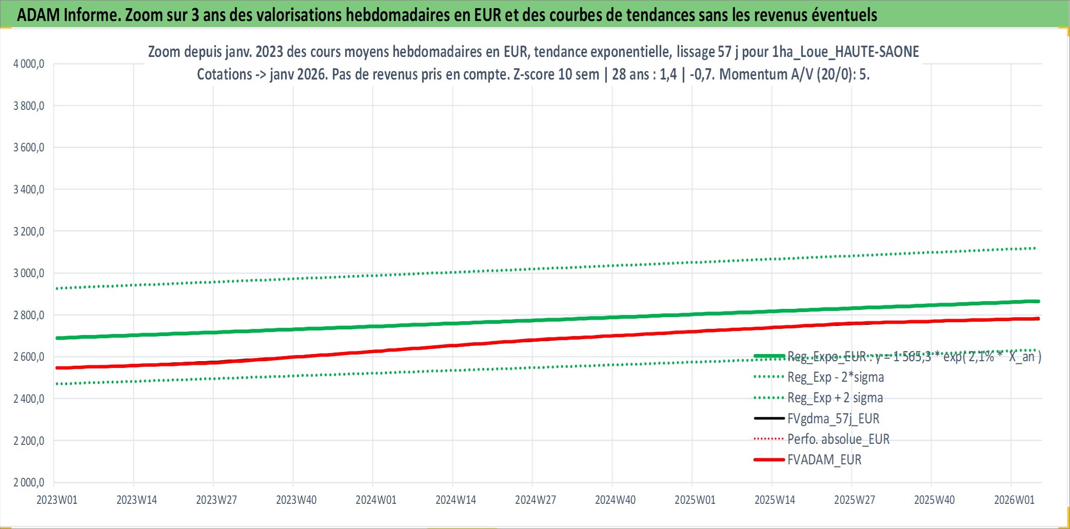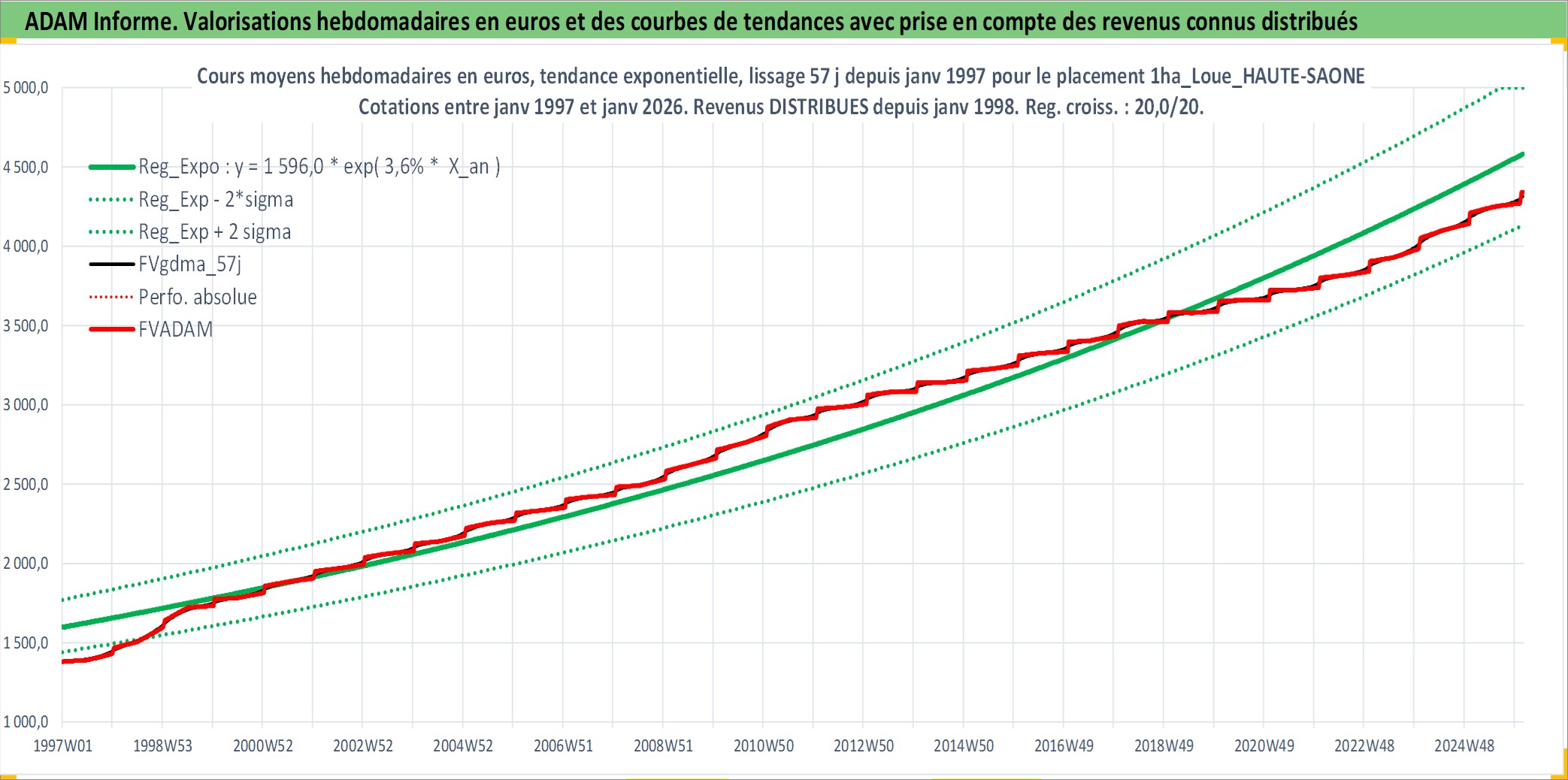 Site dédié aux investisseursPage dédiée sur site financeAnalyse des valorisations hebdomadaires de l'actif 1ha_Loue_HAUTE-SAONE. Cet actif est cote en EUR. Les valorisations couvrent les semaines 1997W01 a 2026W05. Les fermages de ce bien foncier sont pris egaux a 2,5% annuels de la valeur venale du bien.