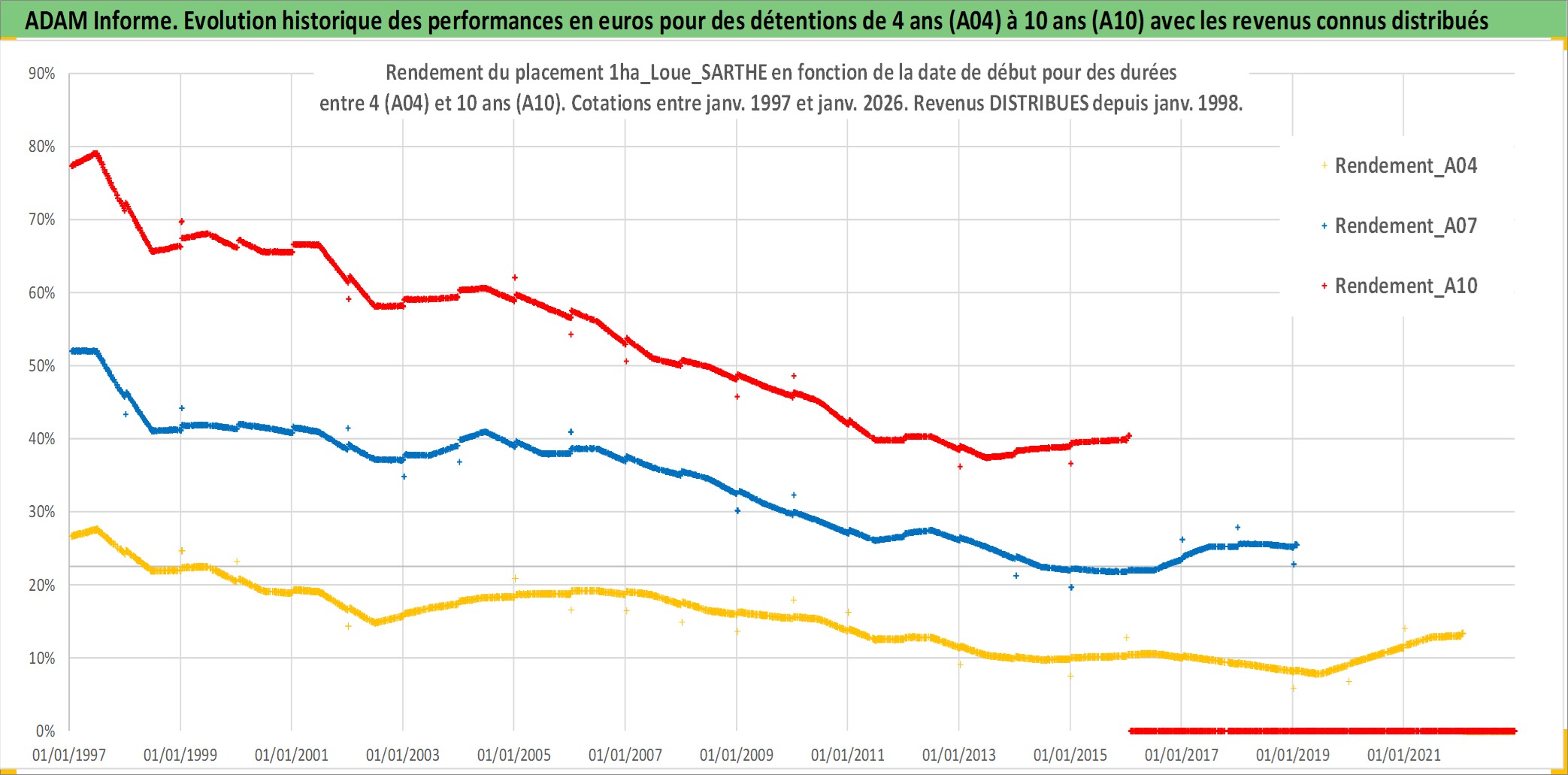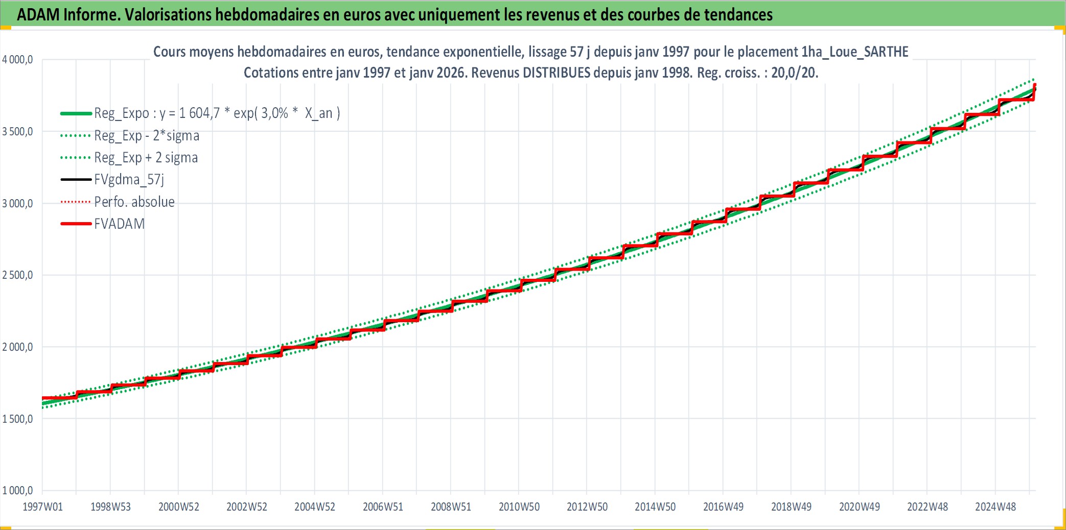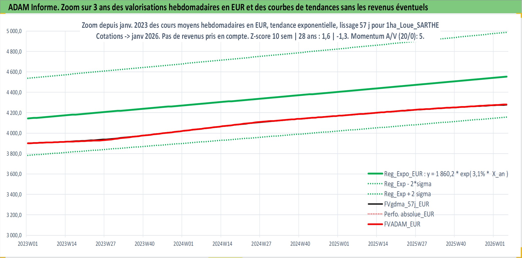 Site dédié aux investisseursPage dédiée sur site financeAnalyse des valorisations hebdomadaires de l'actif 1ha_Loue_SARTHE. Cet actif est cote en EUR. Les valorisations couvrent les semaines 1997W01 a 2026W05. Les fermages de ce bien foncier sont pris egaux a 2,5% annuels de la valeur venale du bien.