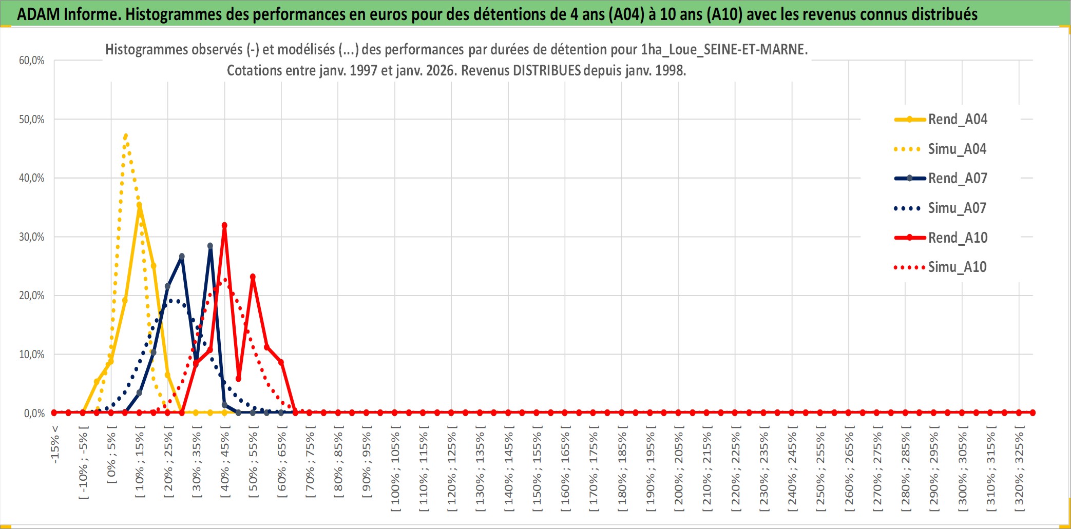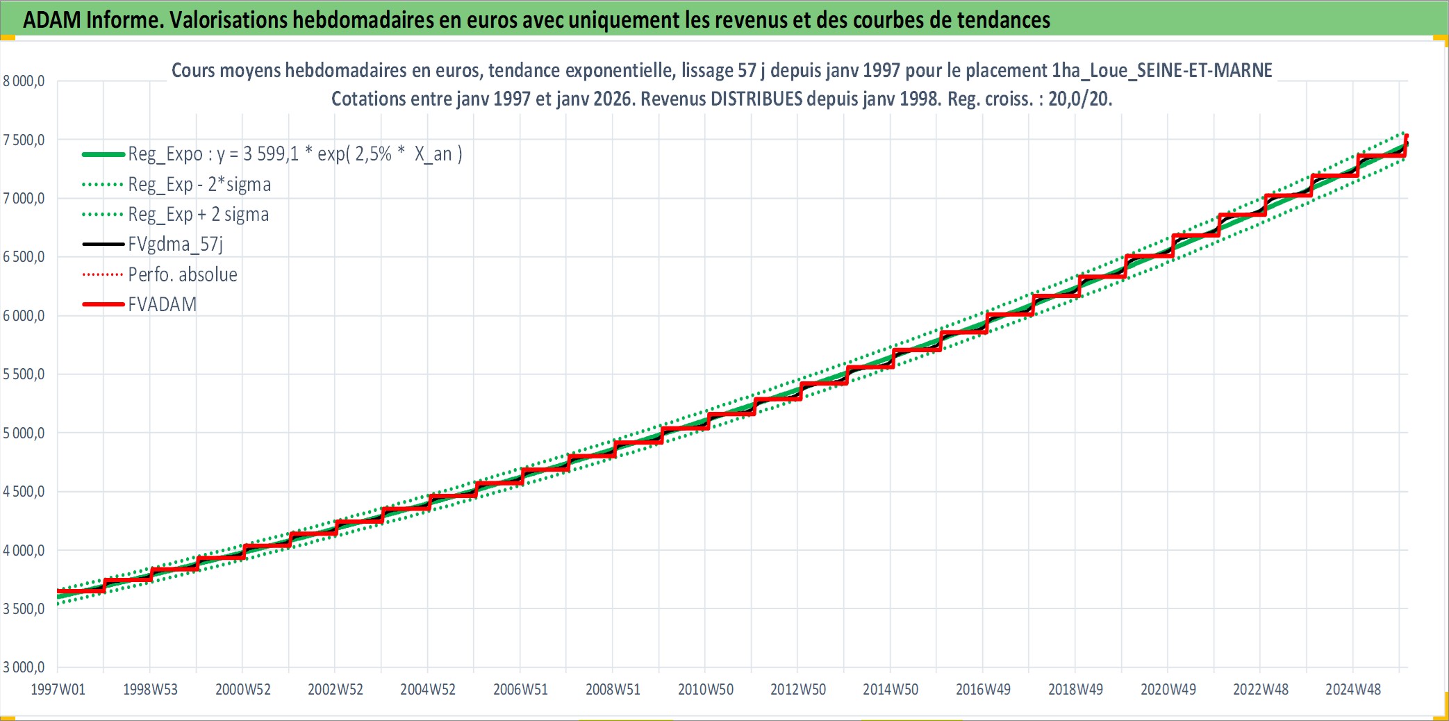 Site dédié aux investisseursPage dédiée sur site financeAnalyse des valorisations hebdomadaires de l'actif 1ha_Loue_SEINE-ET-MARNE. Cet actif est cote en EUR. Les valorisations couvrent les semaines 1997W01 a 2026W05. Les fermages de ce bien foncier sont pris egaux a 2,5% annuels de la valeur venale du bien.