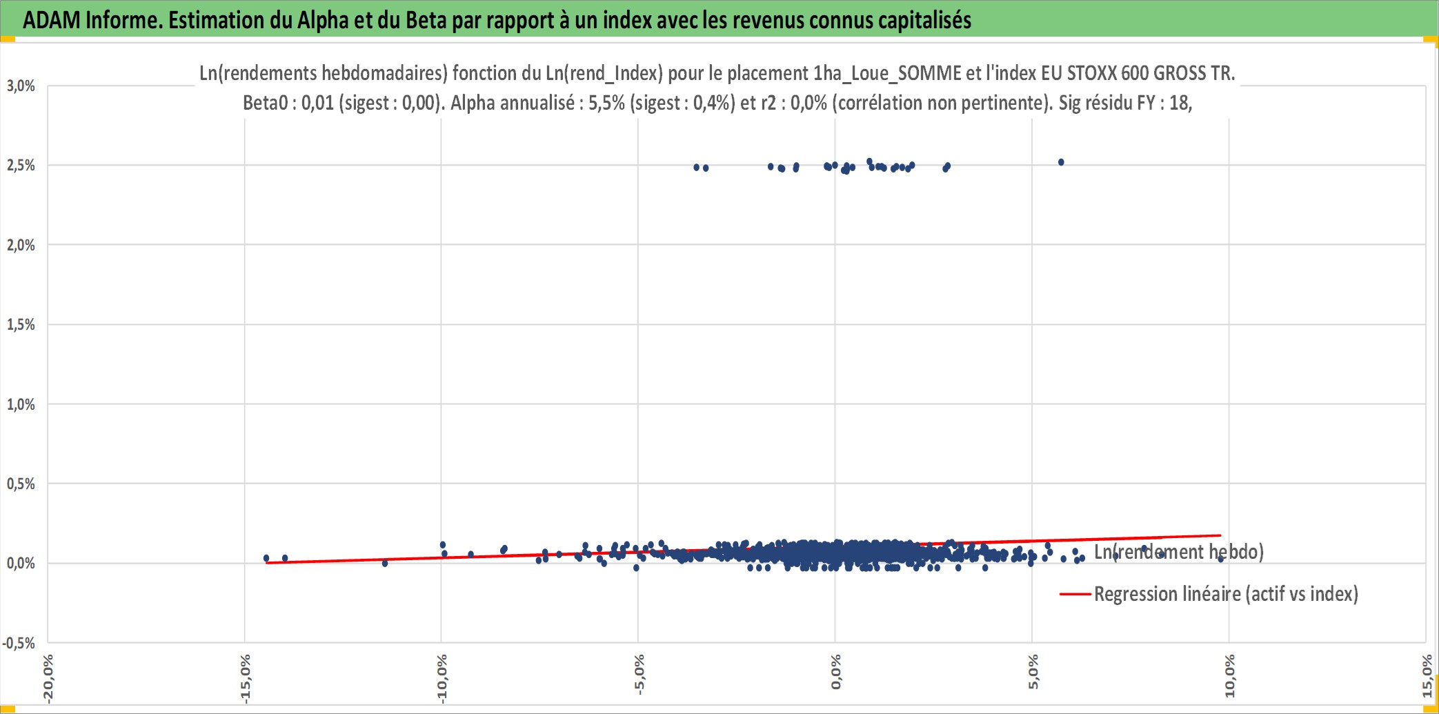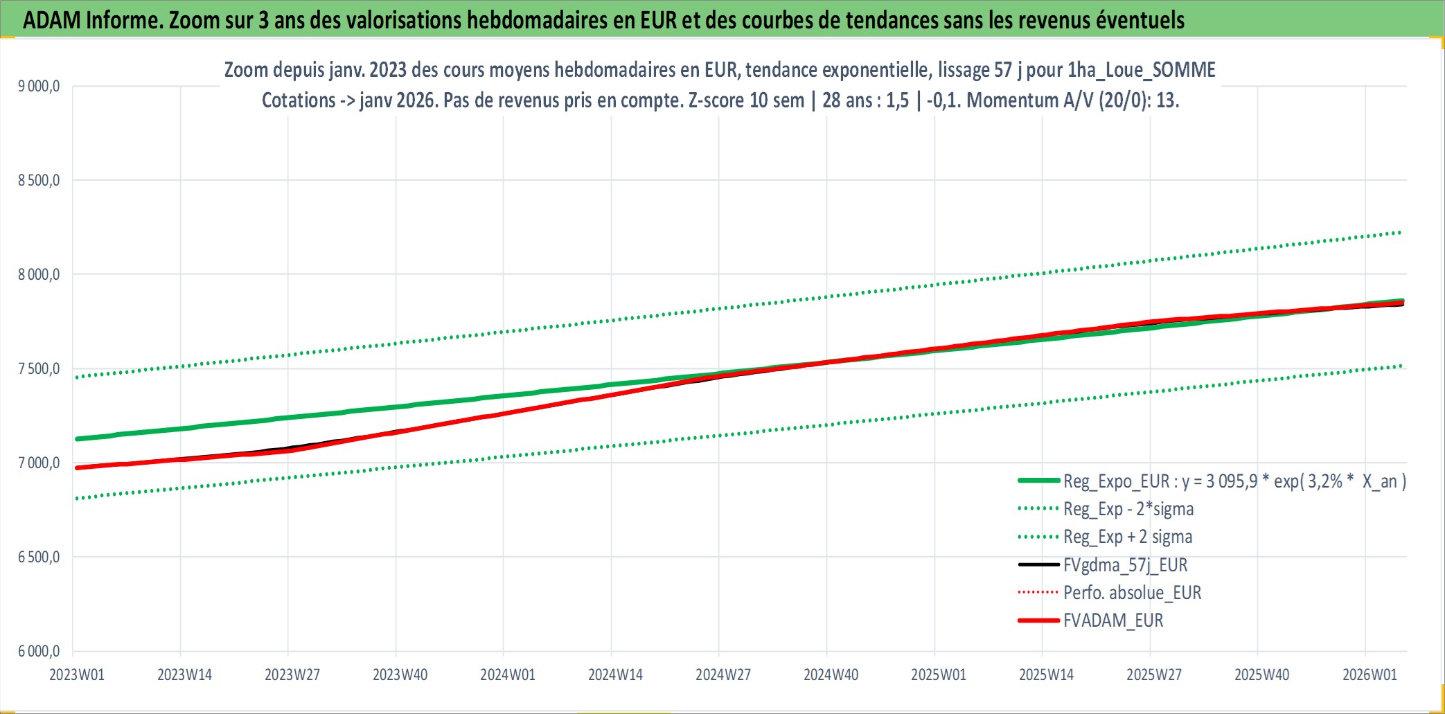 Site dédié aux investisseursPage dédiée sur site financeAnalyse des valorisations hebdomadaires de l'actif 1ha_Loue_SOMME. Cet actif est cote en EUR. Les valorisations couvrent les semaines 1997W01 a 2026W05. Les fermages de ce bien foncier sont pris egaux a 2,5% annuels de la valeur venale du bien.