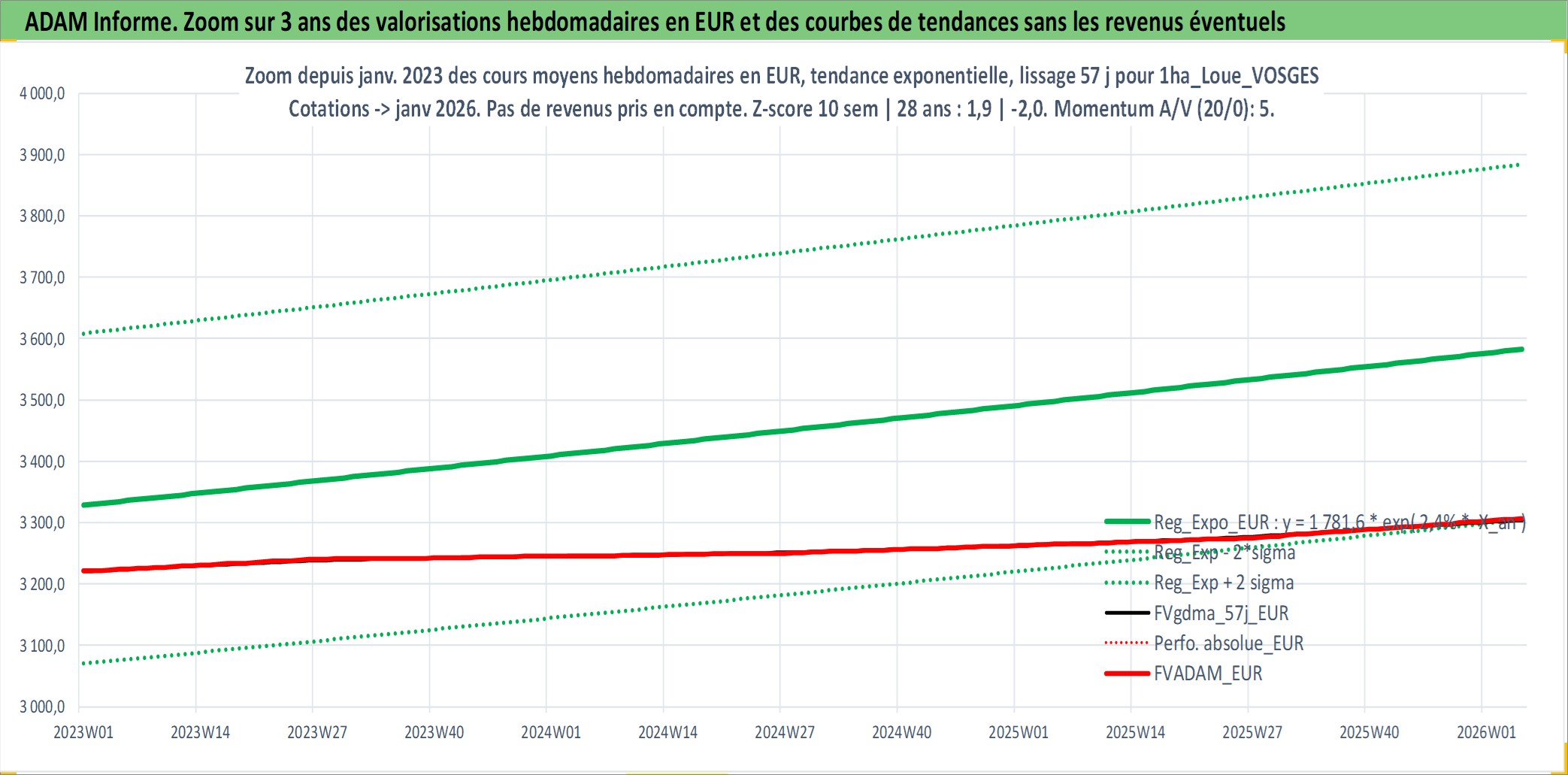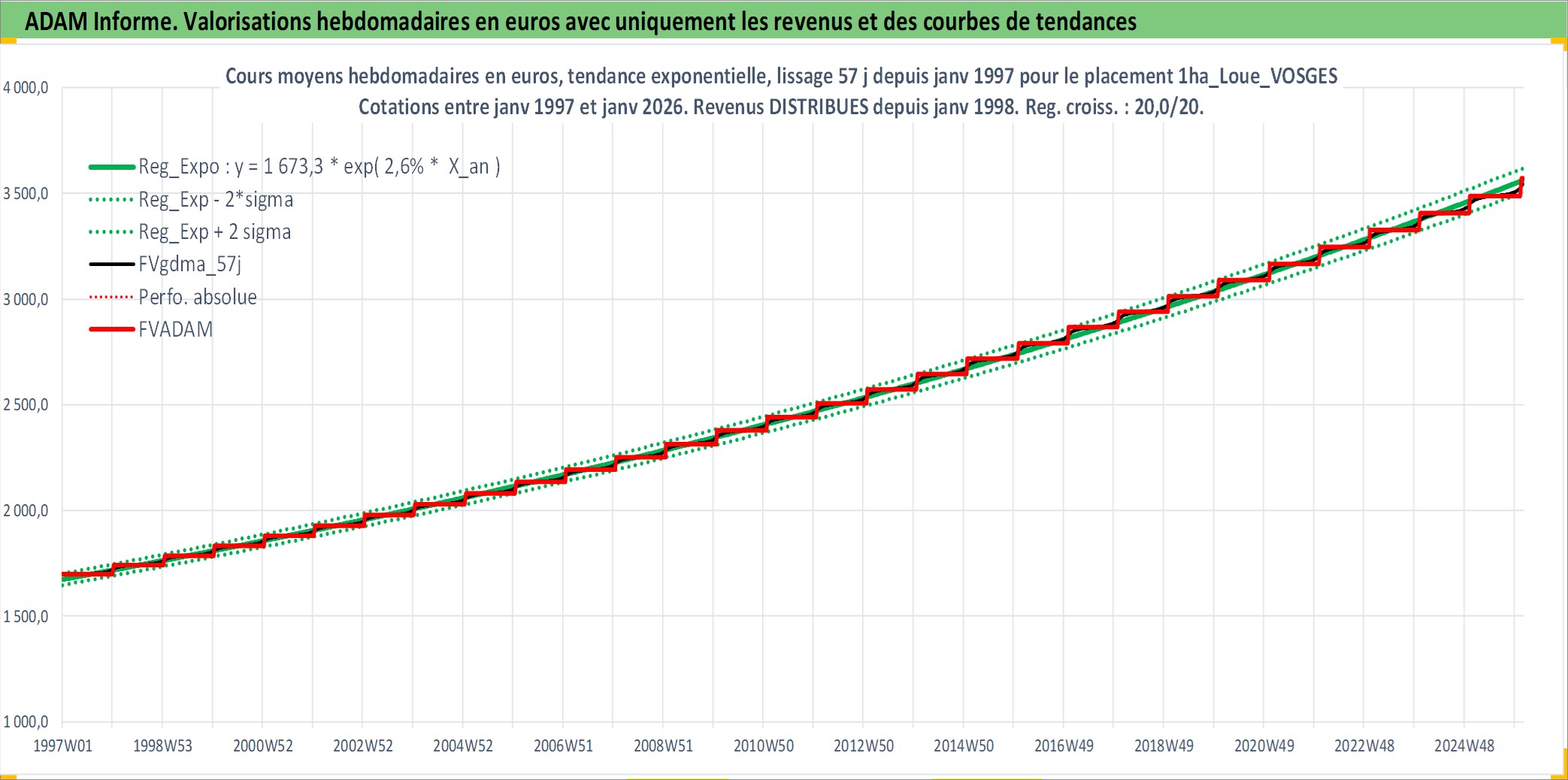 Site dédié aux investisseursPage dédiée sur site financeAnalyse des valorisations hebdomadaires de l'actif 1ha_Loue_VOSGES. Cet actif est cote en EUR. Les valorisations couvrent les semaines 1997W01 a 2026W05. Les fermages de ce bien foncier sont pris egaux a 2,5% annuels de la valeur venale du bien.