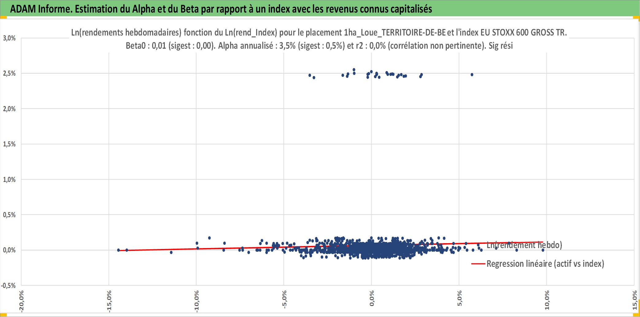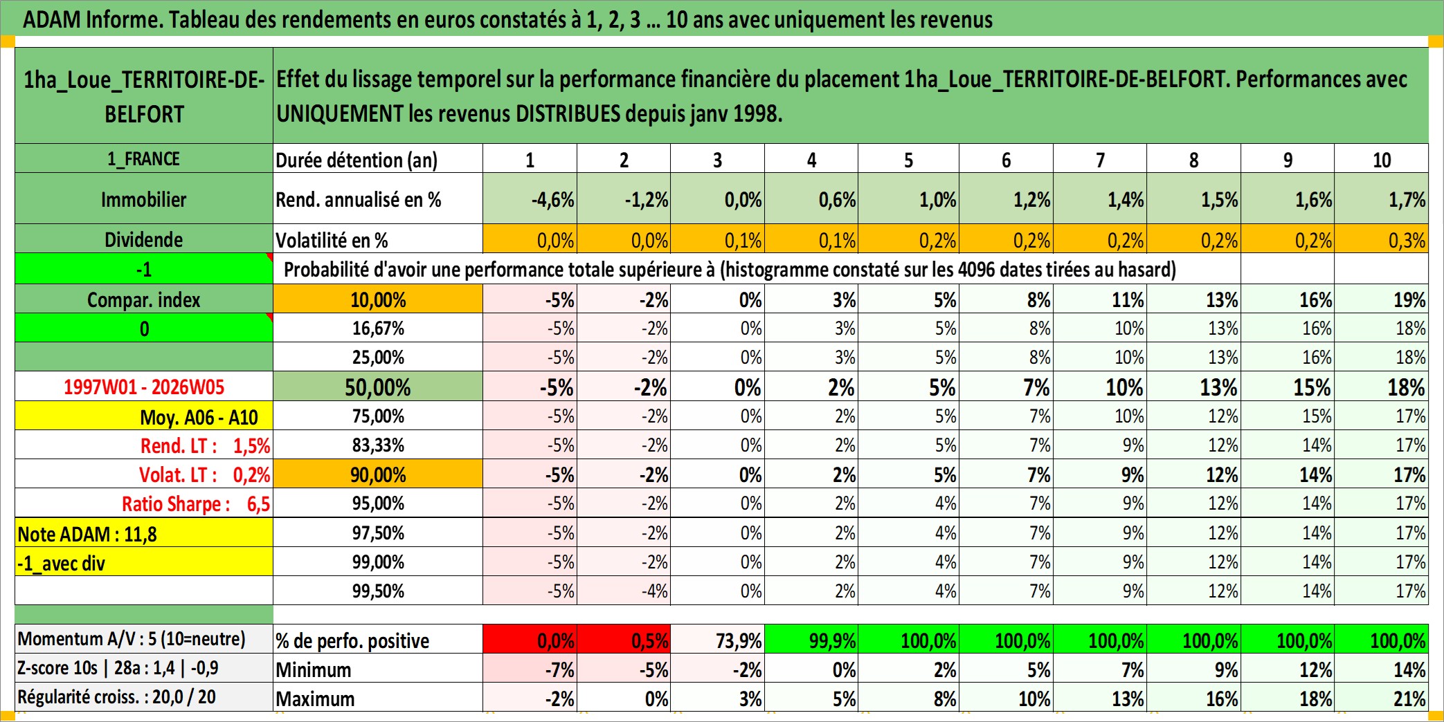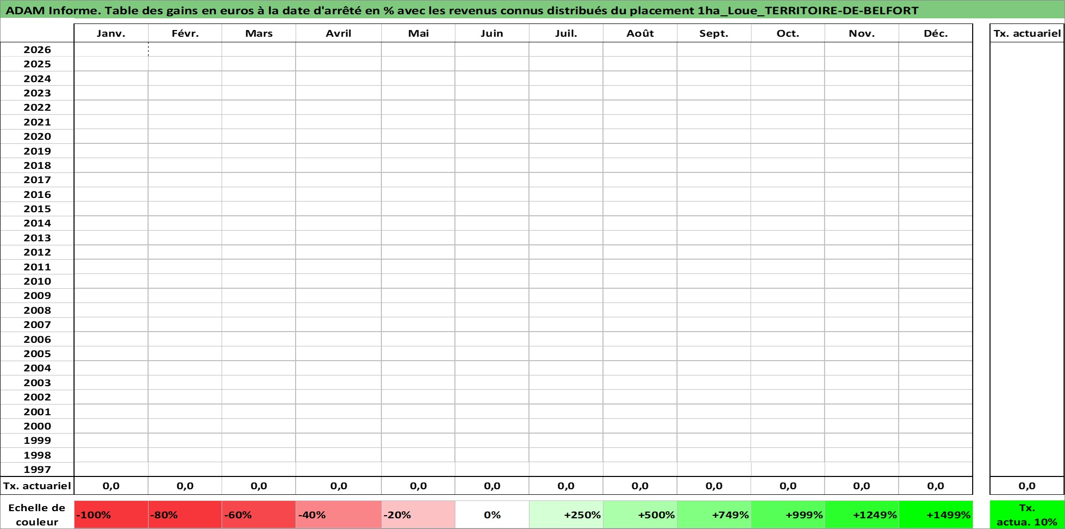 Site dédié aux investisseursPage dédiée sur site financeAnalyse des valorisations hebdomadaires de l'actif 1ha_Loue_TERRITOIRE-DE-BELFORT. Cet actif est cote en EUR. Les valorisations couvrent les semaines 1997W01 a 2026W05. Les fermages de ce bien foncier sont pris egaux a 2,5% annuels de la valeur venale du bien.