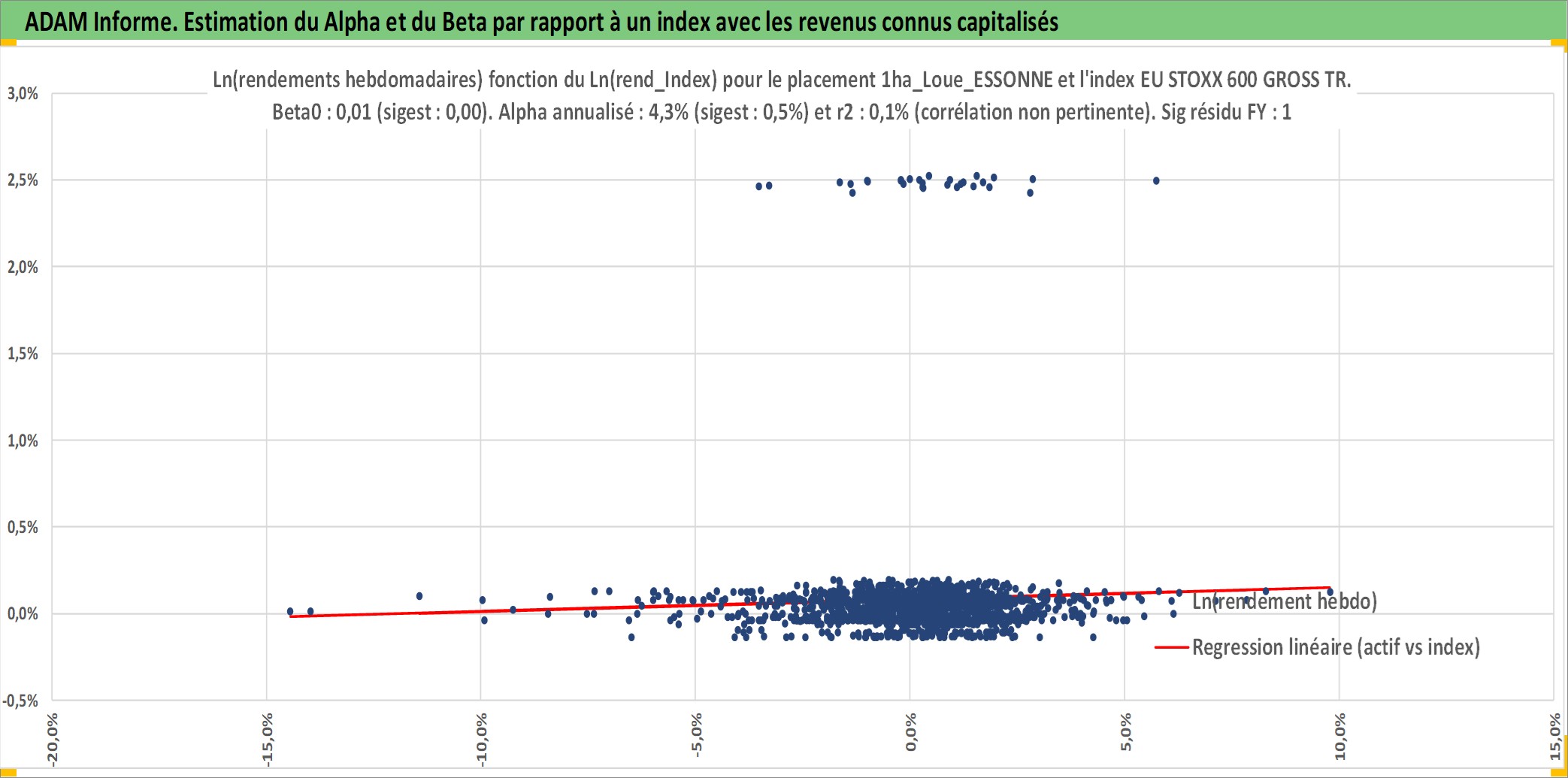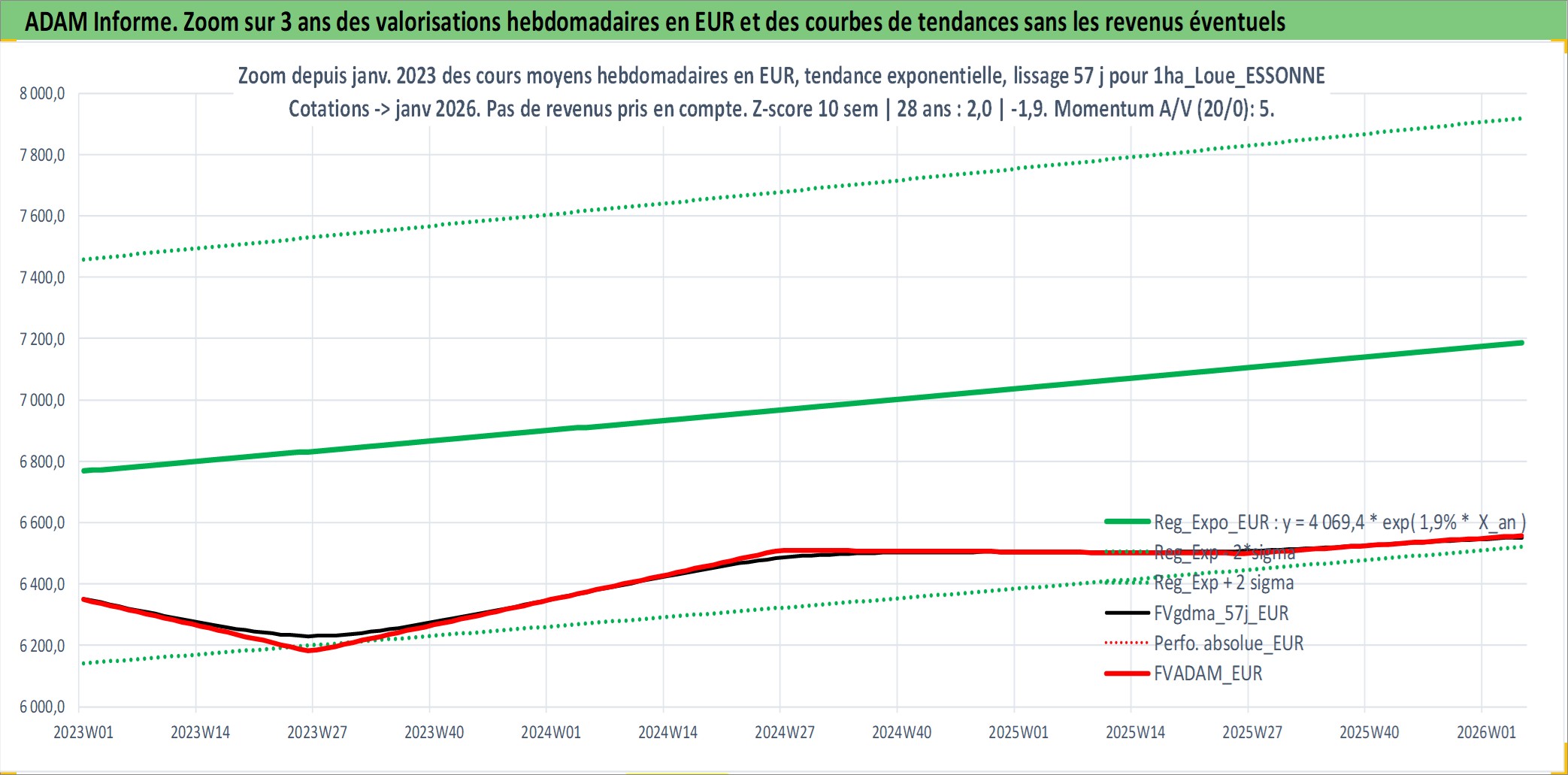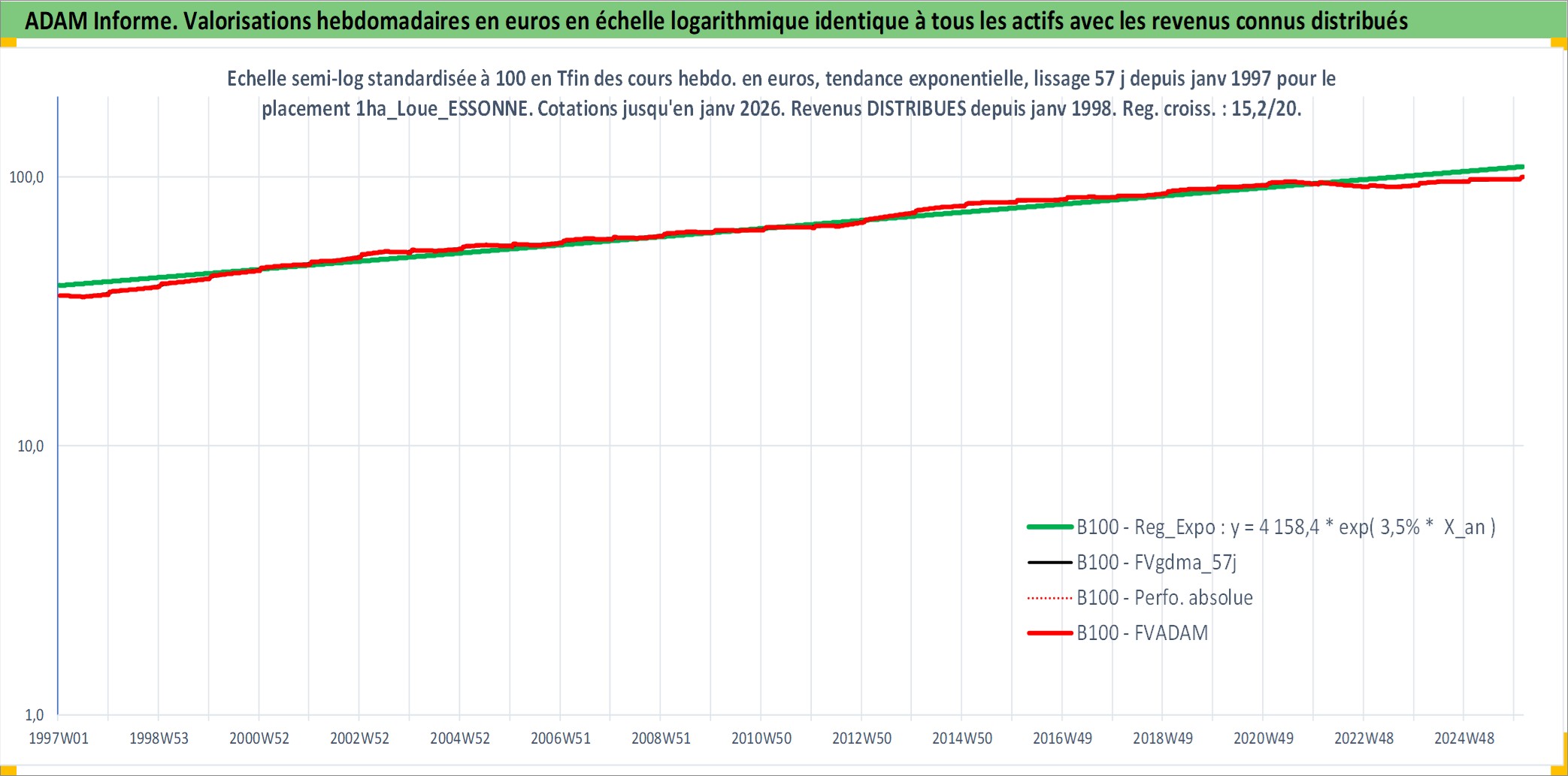 Site dédié aux investisseursPage dédiée sur site financeAnalyse des valorisations hebdomadaires de l'actif 1ha_Loue_ESSONNE. Cet actif est cote en EUR. Les valorisations couvrent les semaines 1997W01 a 2026W05. Les fermages de ce bien foncier sont pris egaux a 2,5% annuels de la valeur venale du bien.