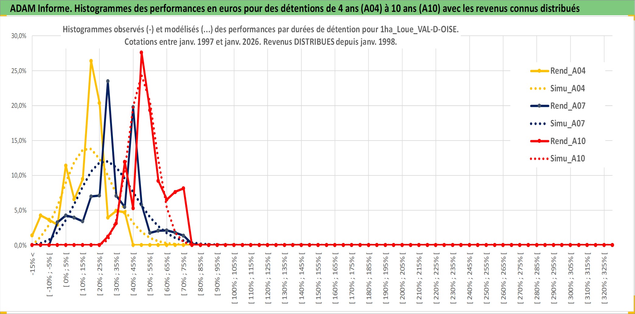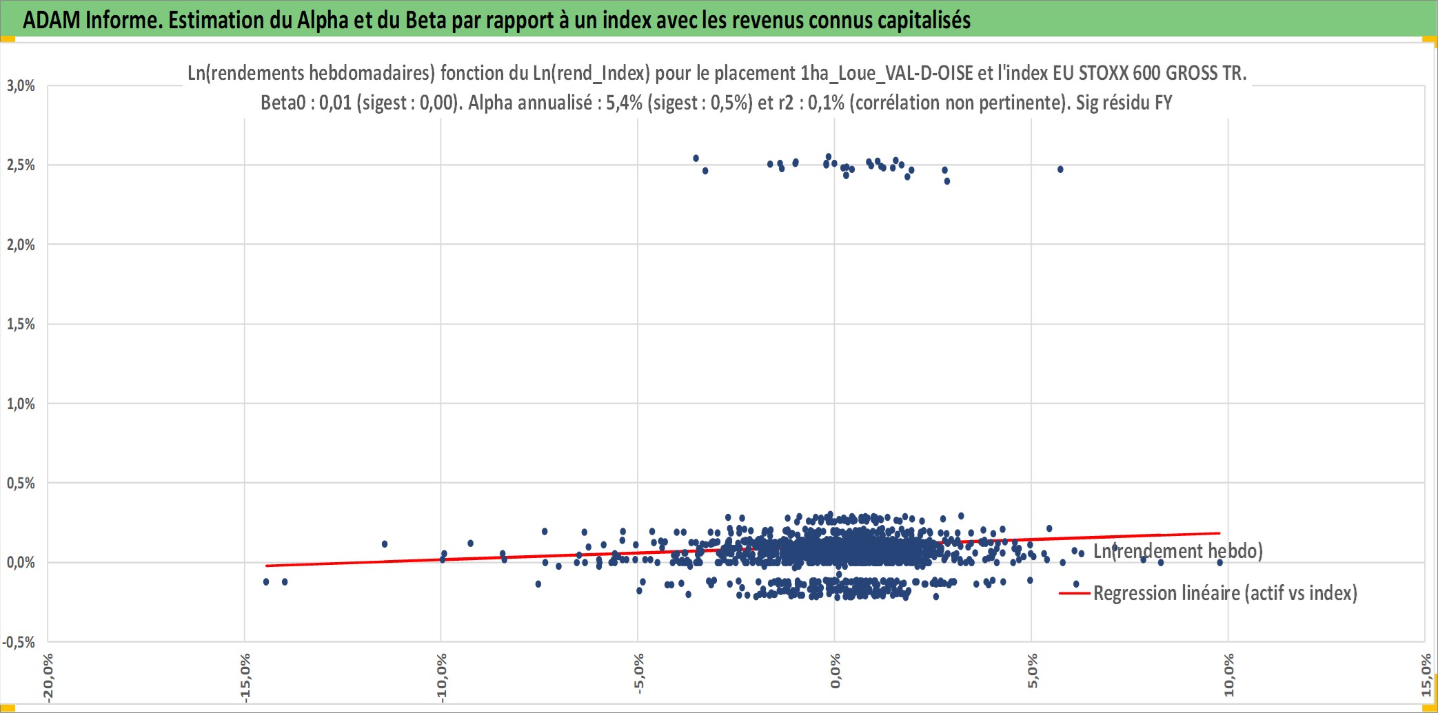 Site dédié aux investisseursPage dédiée sur site financeAnalyse des valorisations hebdomadaires de l'actif 1ha_Loue_VAL-D-OISE. Cet actif est cote en EUR. Les valorisations couvrent les semaines 1997W01 a 2026W05. Les fermages de ce bien foncier sont pris egaux a 2,5% annuels de la valeur venale du bien.