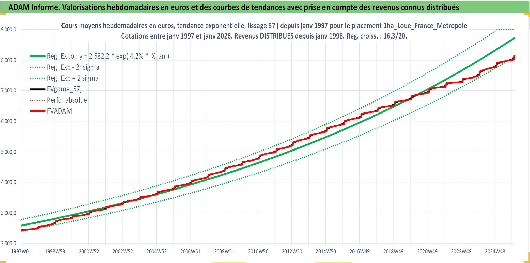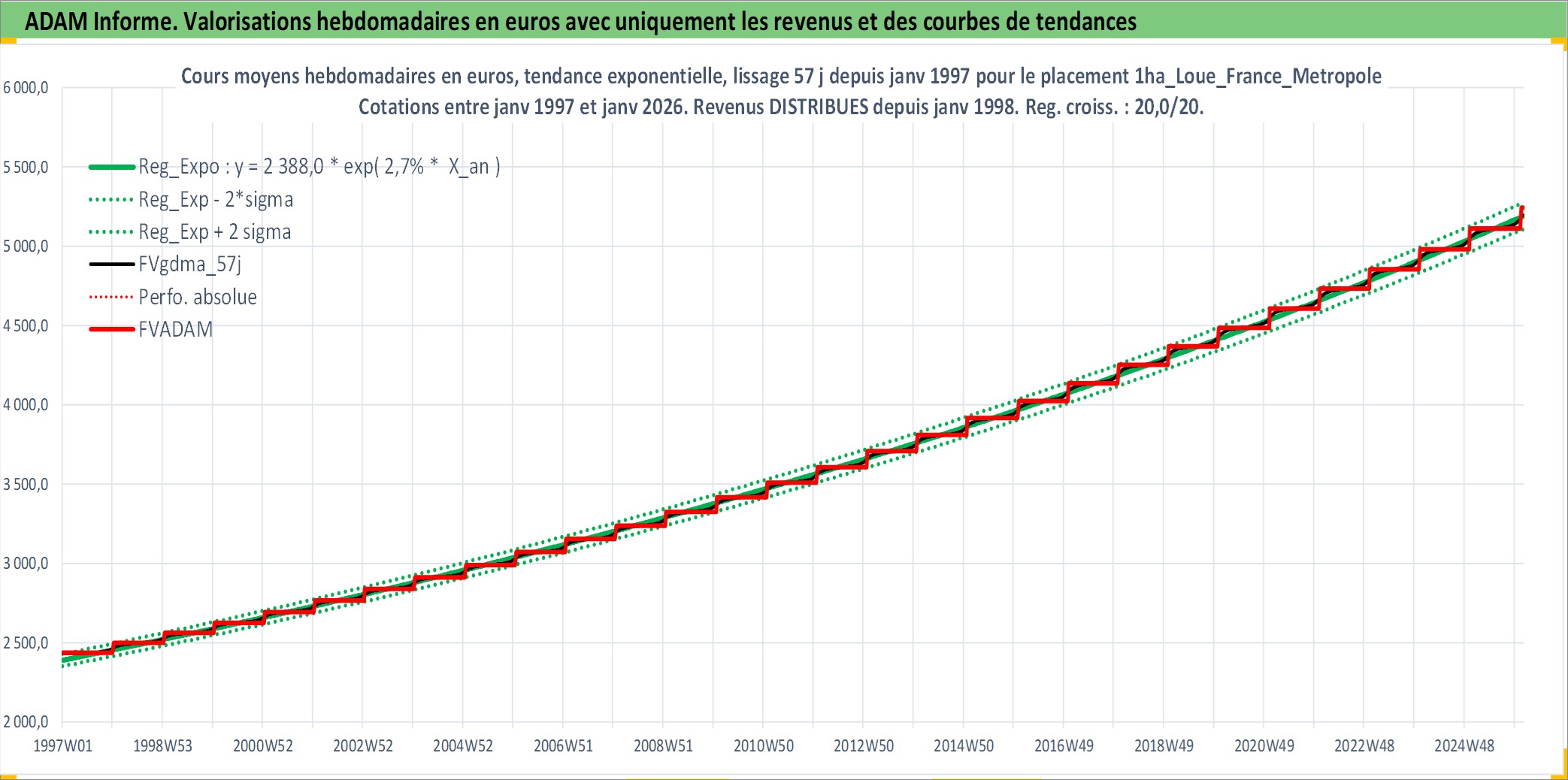 Site dédié aux investisseursPage dédiée sur site financeAnalyse des valorisations hebdomadaires de l'actif 1ha_Loue_France_Metropole. Cet actif est cote en EUR. Les valorisations couvrent les semaines 1997W01 a 2026W05. Les fermages de ce bien foncier sont pris egaux a 2,5% annuels de la valeur venale du bien.