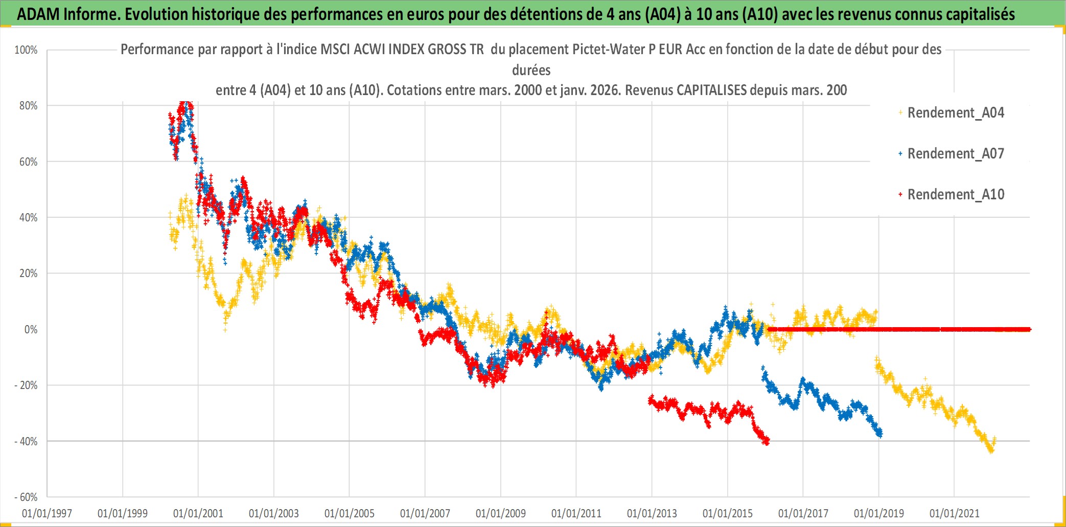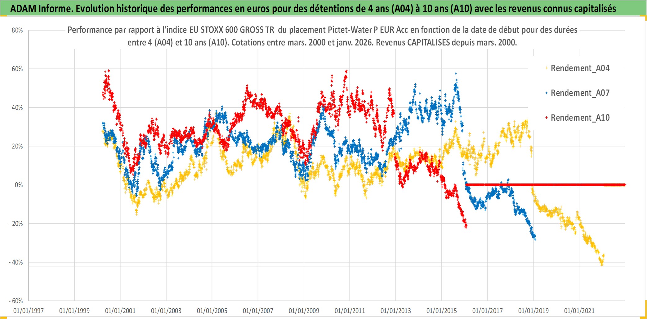 Site dédié aux investisseursPage dédiée sur site financeAnalyse des valorisations hebdomadaires du fonds Pictet-Water P EUR Acc. Cet actif est cote en EUR. Les valorisations couvrent les semaines 2000W11 a 2026W05. Les revenus de cet actif financier sont pris en compte depuis la semaine 2000W11. La note globale ESG de cet actif est estimee a 8.0 (apres rebasage entre 0 et 20).