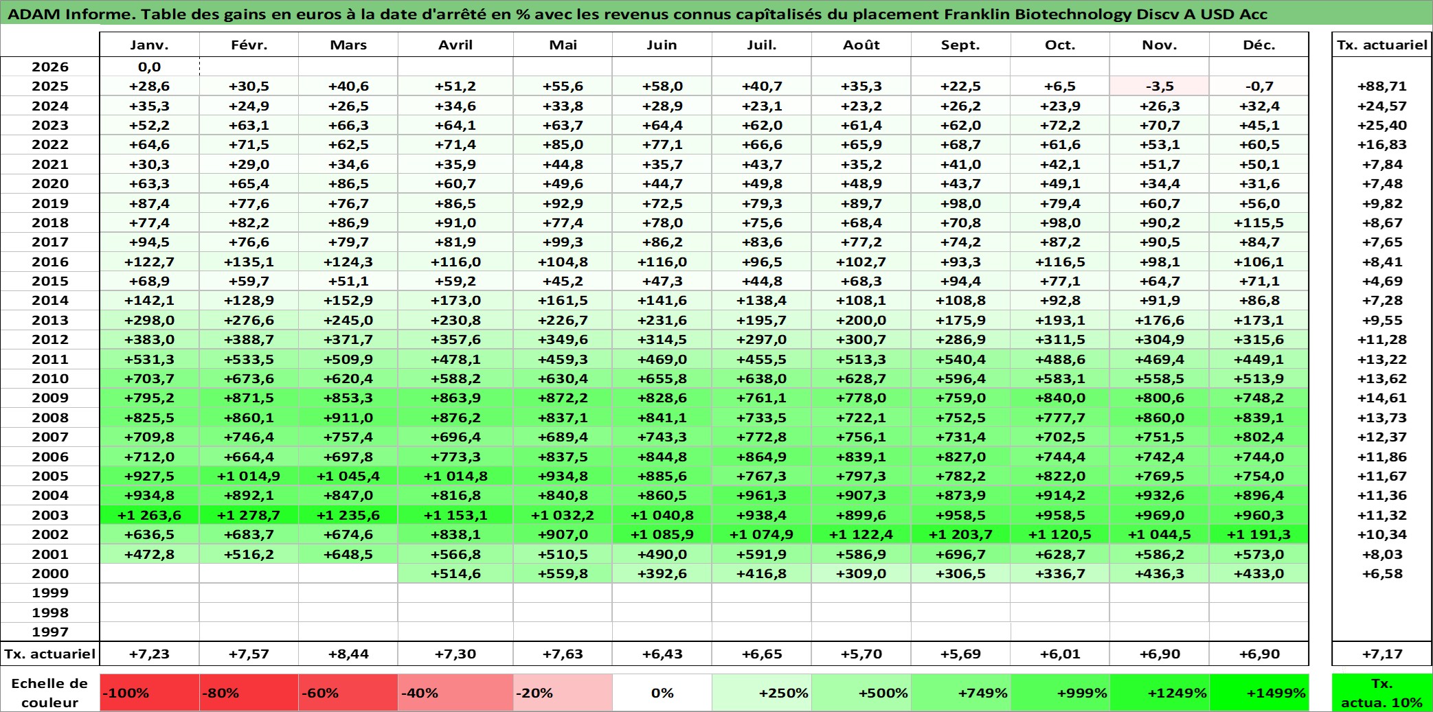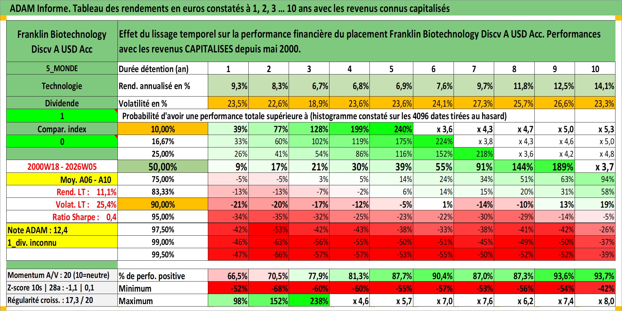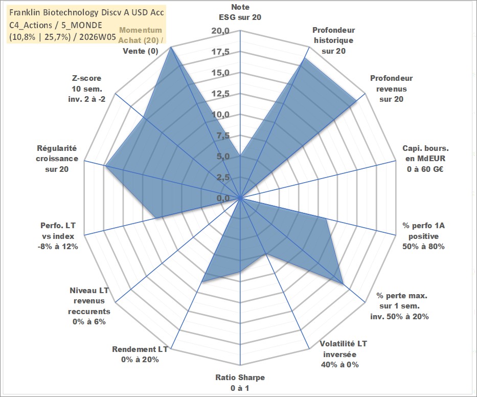 Site dédié aux investisseursPage dédiée sur site financeAnalyse des valorisations hebdomadaires du fonds Franklin Biotechnology Discv A USD Acc. Cet actif est cote en SGD. Les valorisations sont en contrevaleur EURO et couvrent les semaines 2000W18 a 2026W05. Les revenus de cet actif financier sont pris en compte depuis la semaine 2000W18. La note globale ESG de cet actif est estimee a 5.0 (apres rebasage entre 0 et 20).