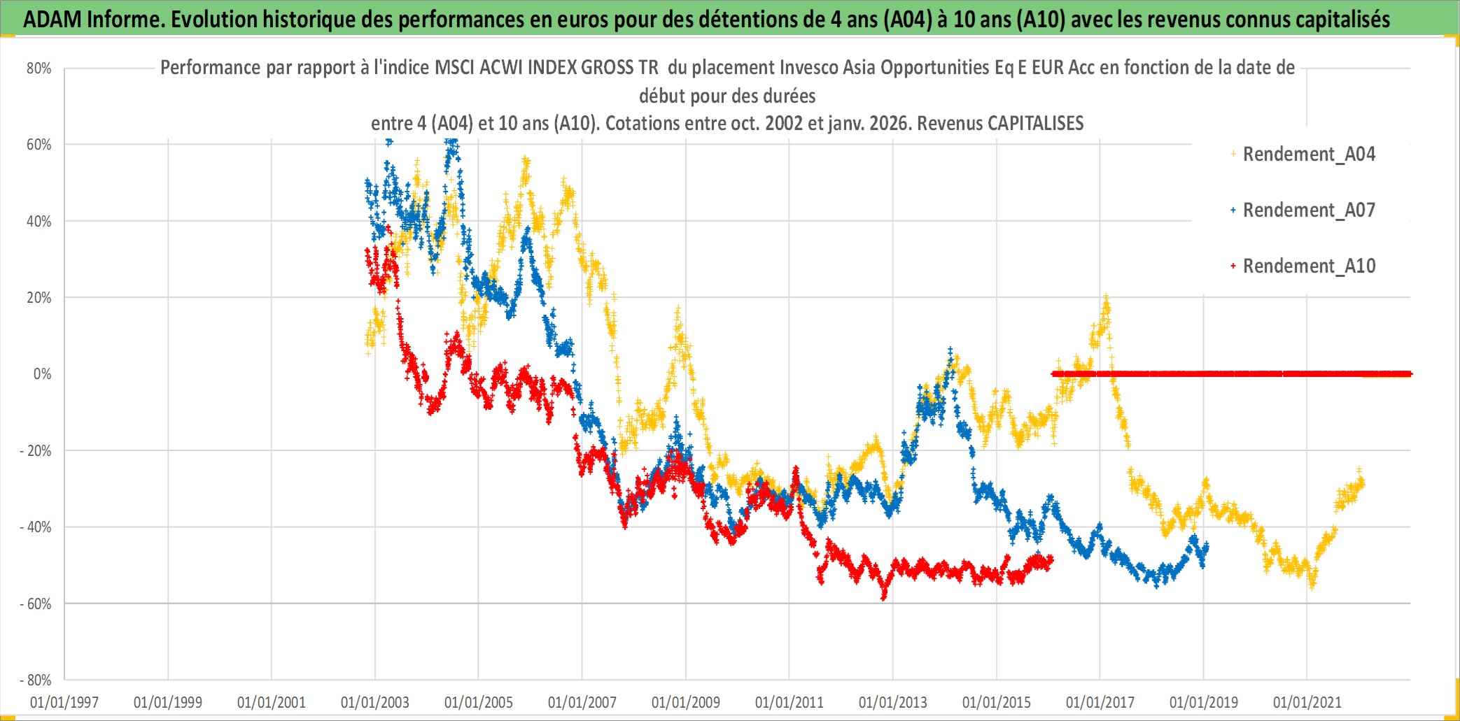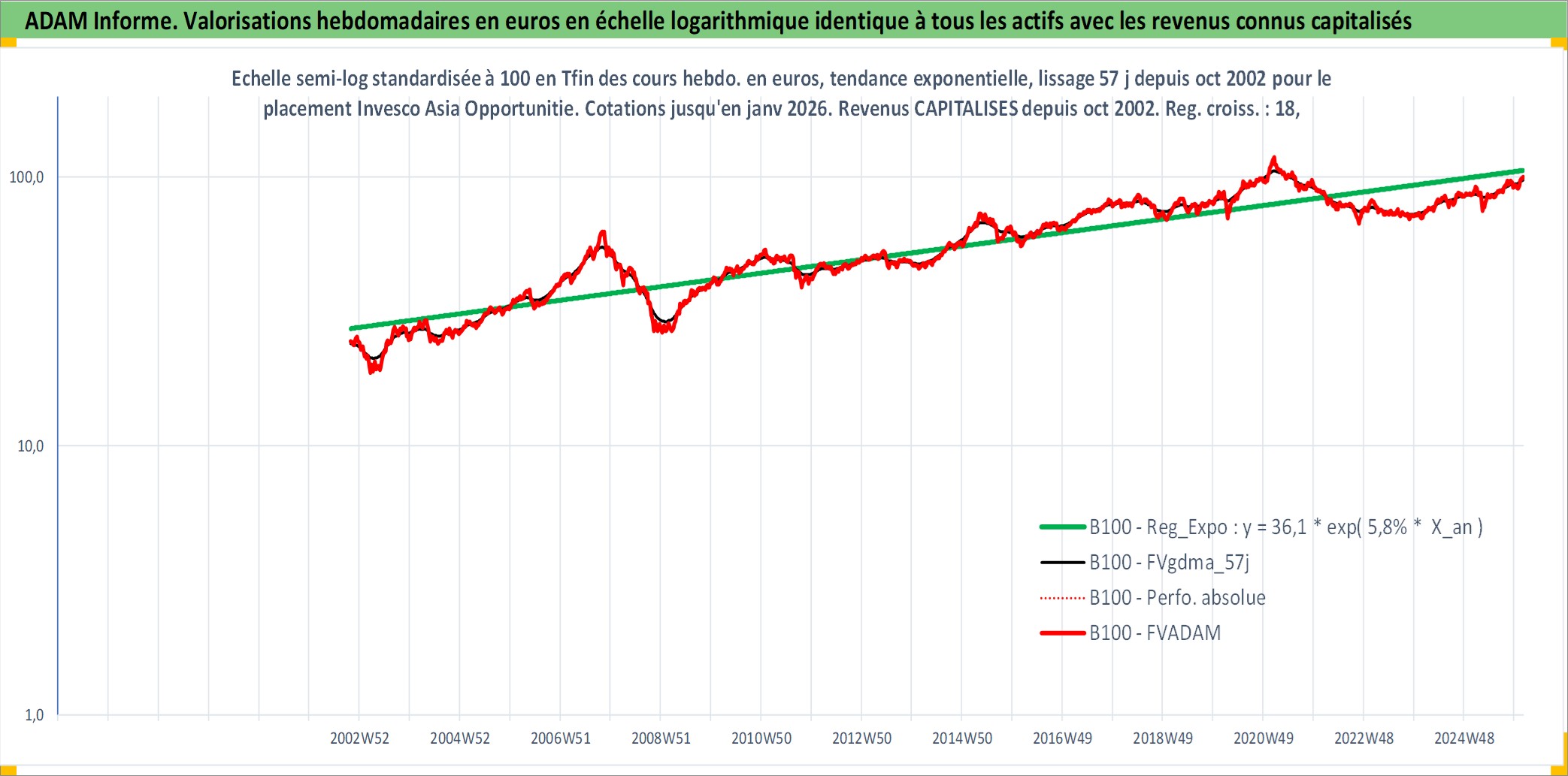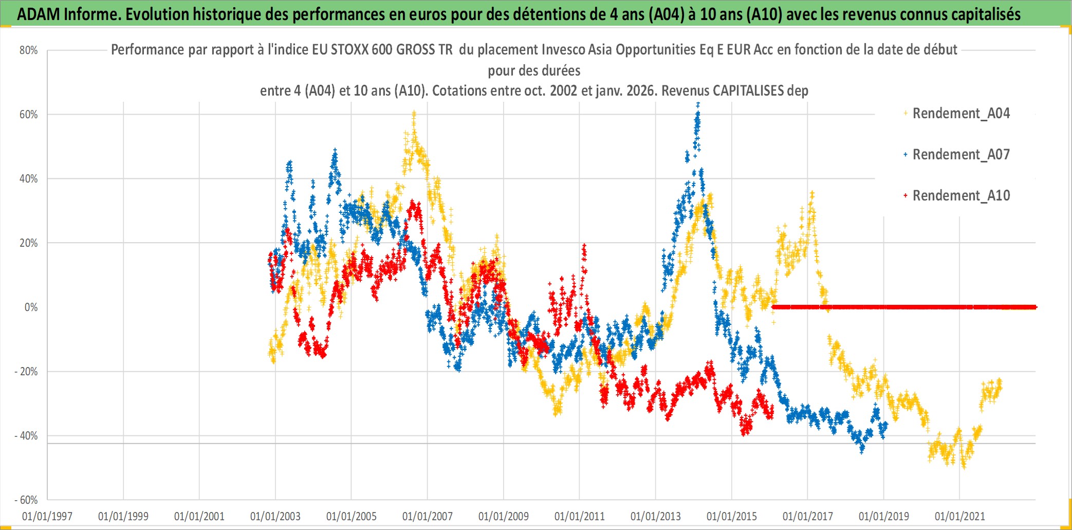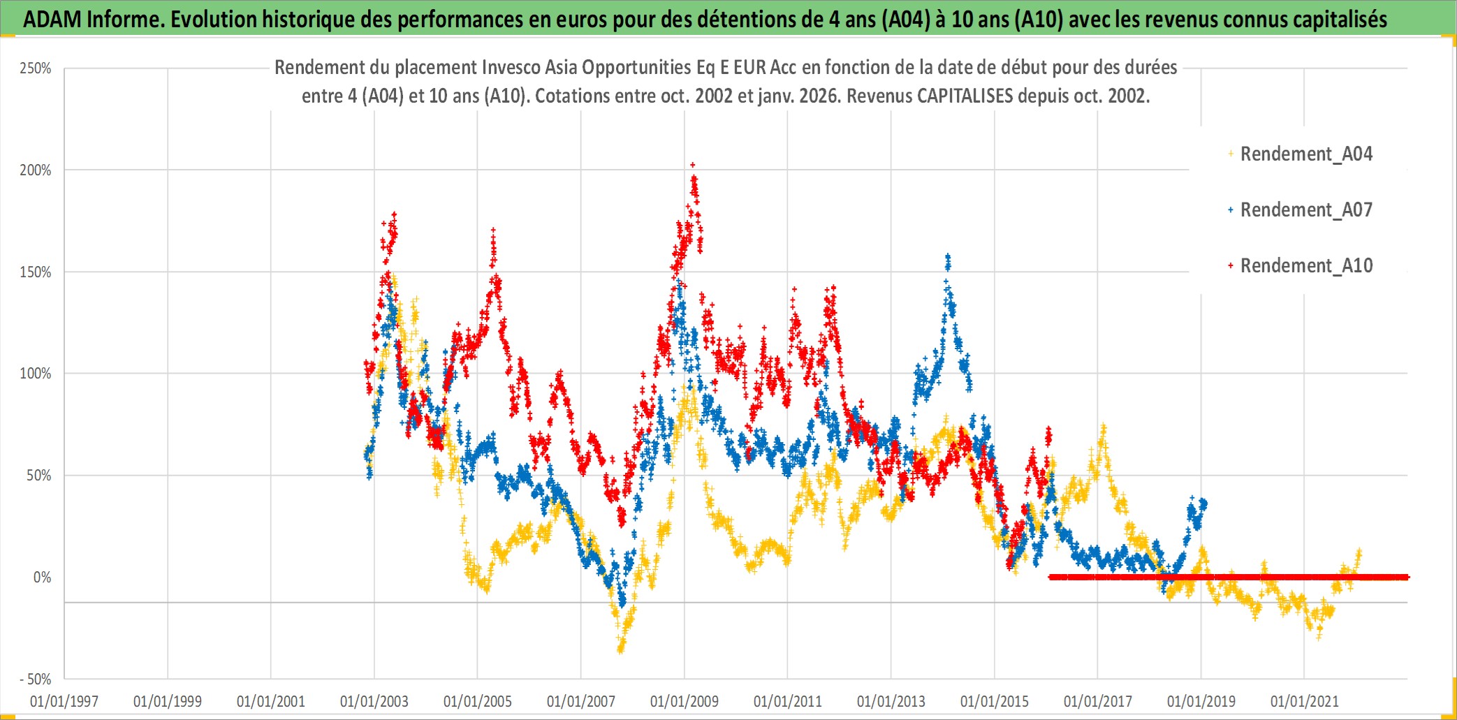 Site dédié aux investisseursPage dédiée sur site financeAnalyse des valorisations hebdomadaires du fonds Invesco Asia Opportunities Eq E EUR Acc. Cet actif est cote en EUR. Les valorisations couvrent les semaines 2002W43 a 2026W05. Les revenus de cet actif financier sont pris en compte depuis la semaine 2002W43. La note globale ESG de cet actif est estimee a 3.0 (apres rebasage entre 0 et 20).