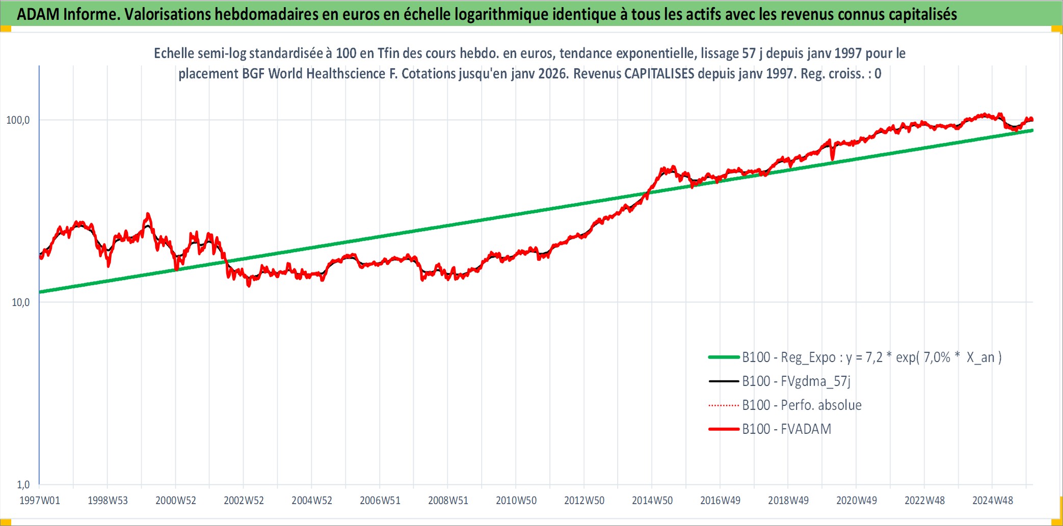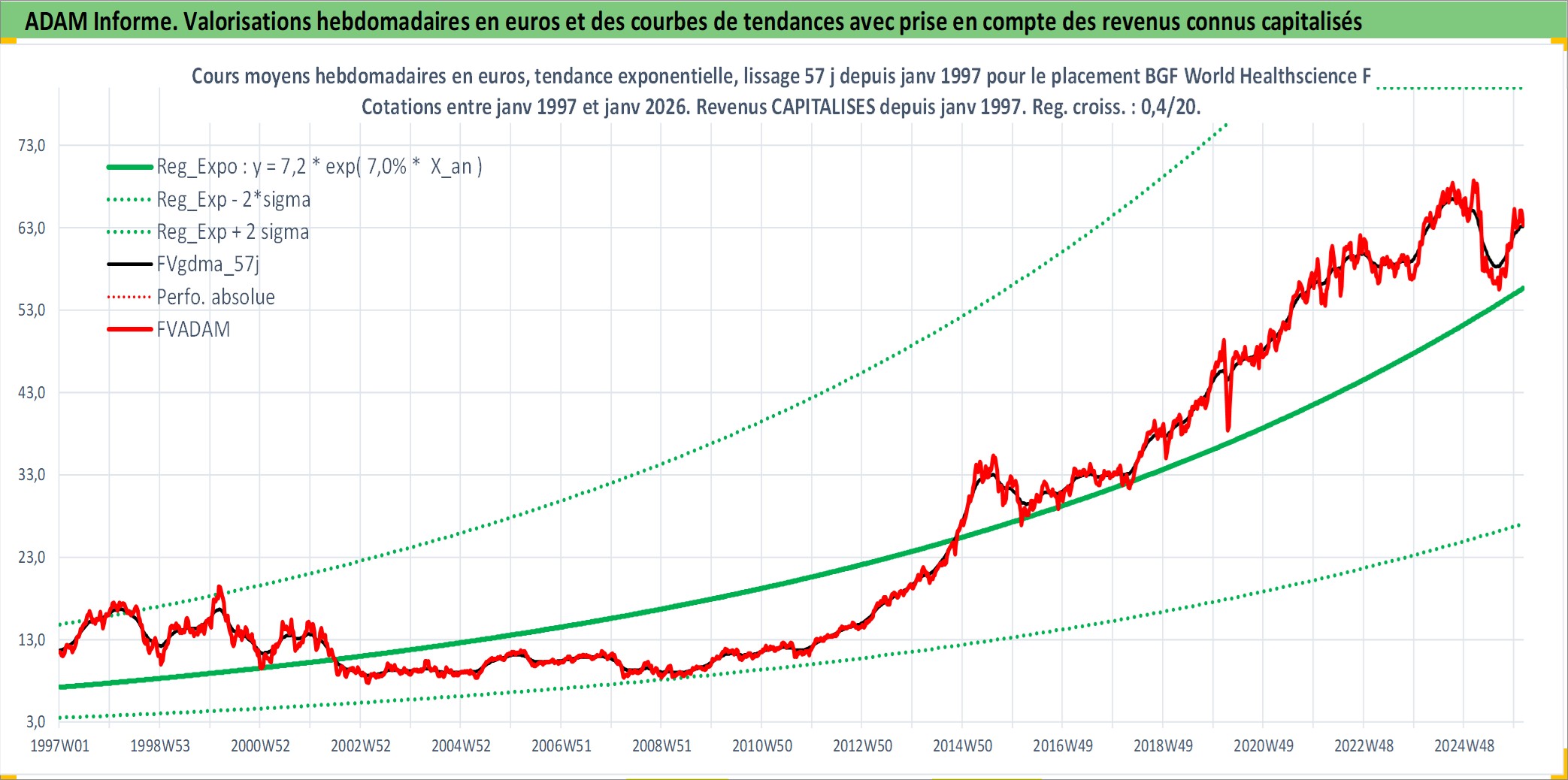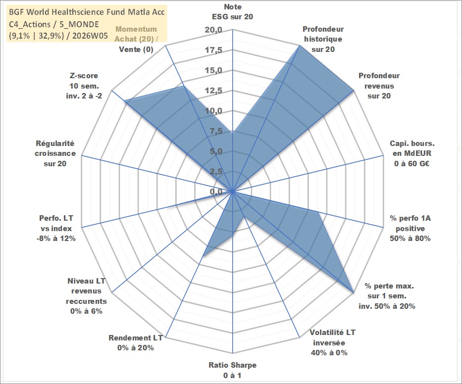 Site dédié aux investisseursPage dédiée sur site financeAnalyse des valorisations hebdomadaires du fonds BGF World Healthscience Fund Matla Acc. Cet actif est cote en USD. Les valorisations sont en contrevaleur EURO et couvrent les semaines 1997W01 a 2026W05. Les revenus de cet actif financier sont pris en compte depuis la semaine 1997W01. La note globale ESG de cet actif est estimee a 7.1 (apres rebasage entre 0 et 20).