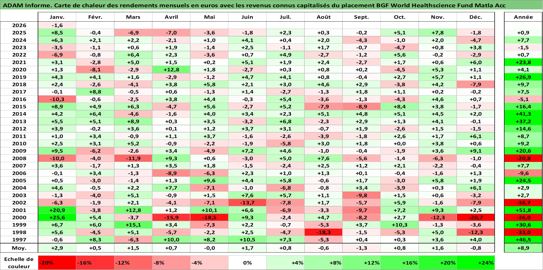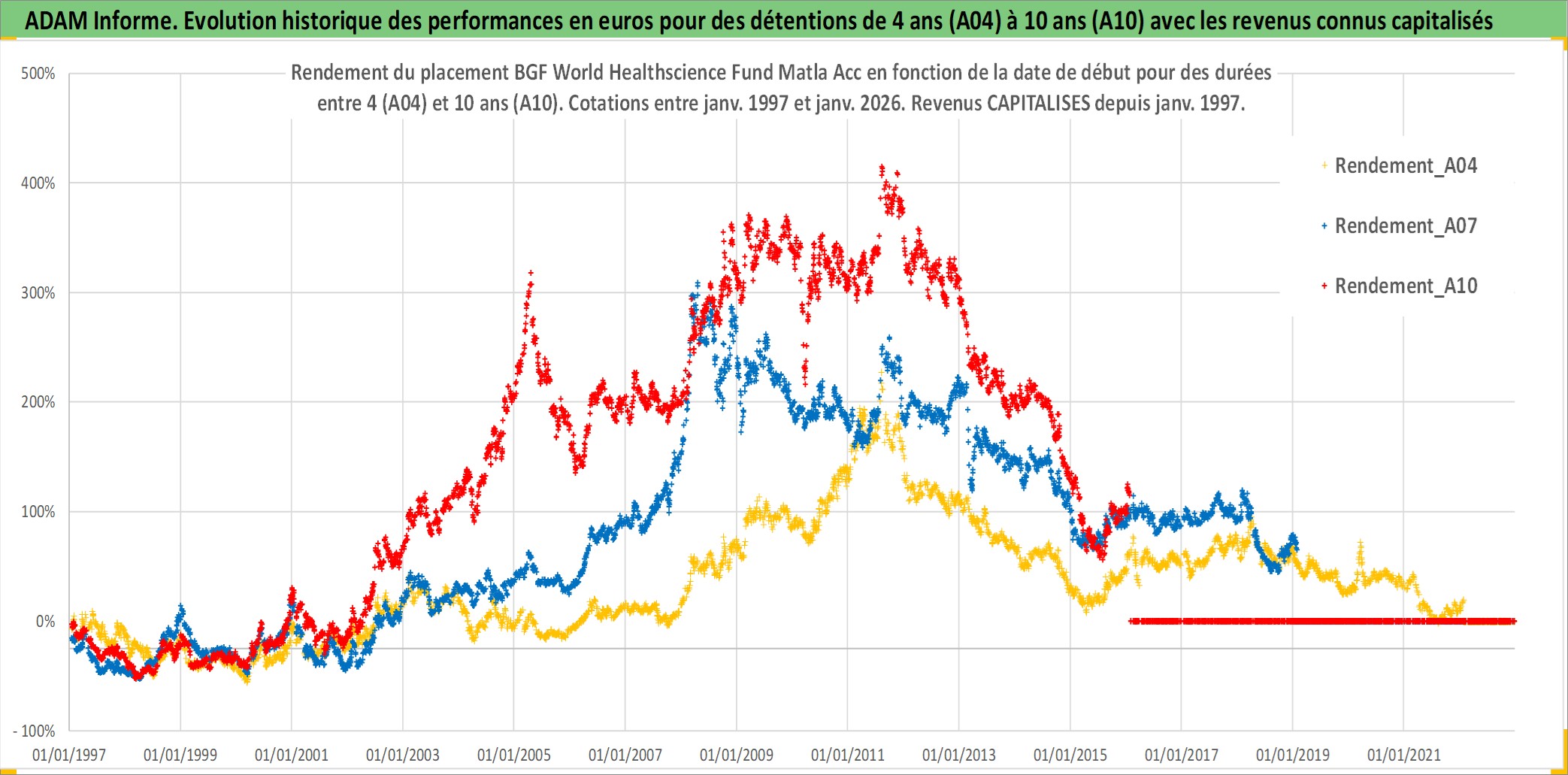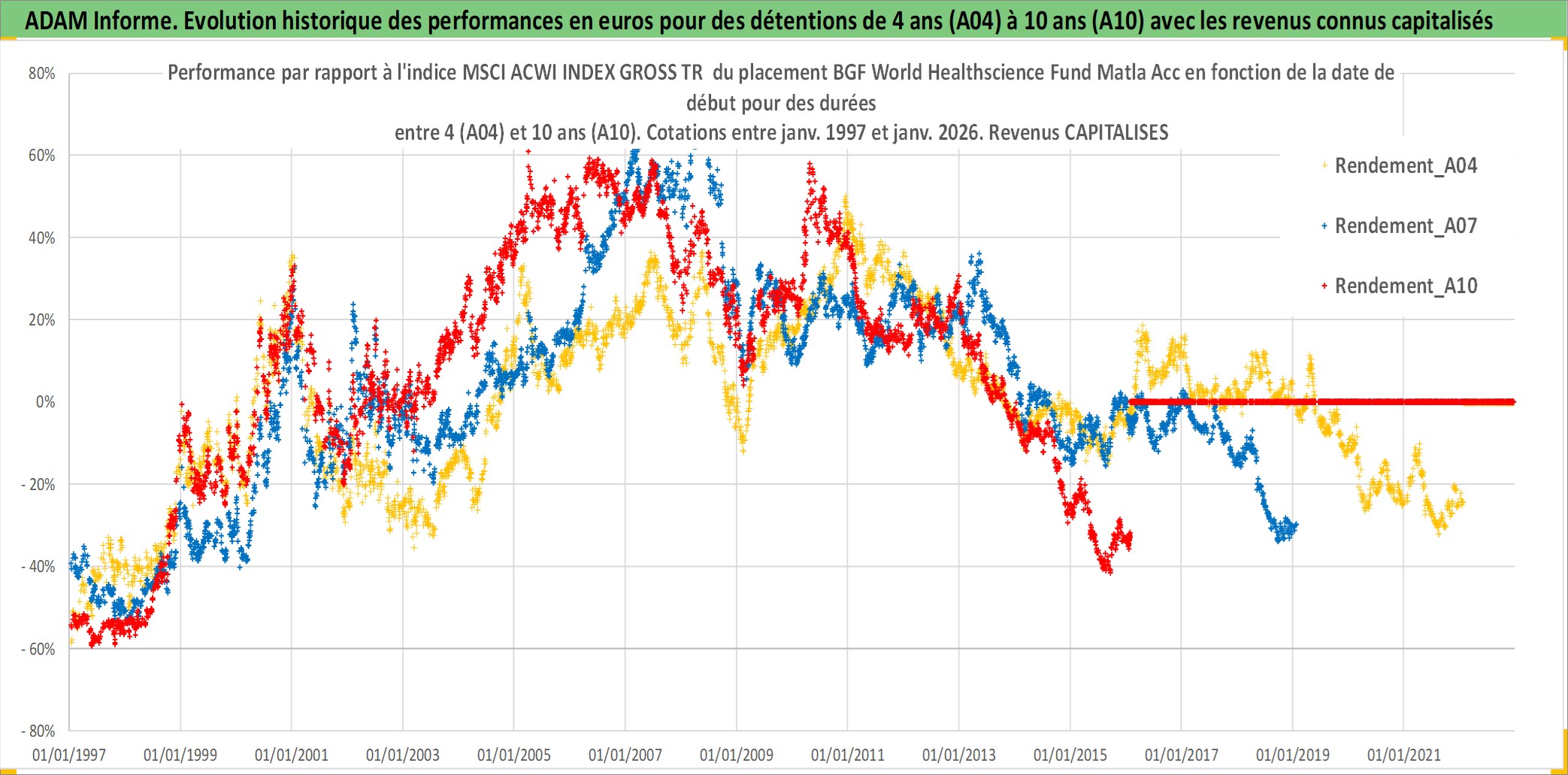 Site dédié aux investisseursPage dédiée sur site financeAnalyse des valorisations hebdomadaires du fonds BGF World Healthscience Fund Matla Acc. Cet actif est cote en USD. Les valorisations sont en contrevaleur EURO et couvrent les semaines 1997W01 a 2026W05. Les revenus de cet actif financier sont pris en compte depuis la semaine 1997W01. La note globale ESG de cet actif est estimee a 7.1 (apres rebasage entre 0 et 20).