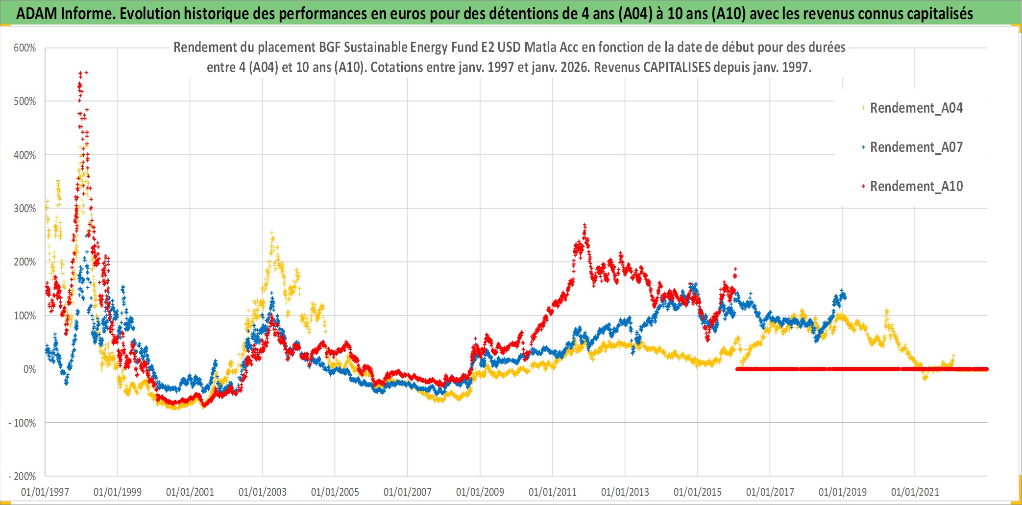 Site dédié aux investisseursPage dédiée sur site financeAnalyse des valorisations hebdomadaires du fonds BGF Sustainable Energy Fund E2 USD Matla Acc. Cet actif est cote en USD. Les valorisations sont en contrevaleur EURO et couvrent les semaines 1997W01 a 2026W05. Les revenus de cet actif financier sont pris en compte depuis la semaine 1997W01. La note globale ESG de cet actif est estimee a 7.8 (apres rebasage entre 0 et 20).