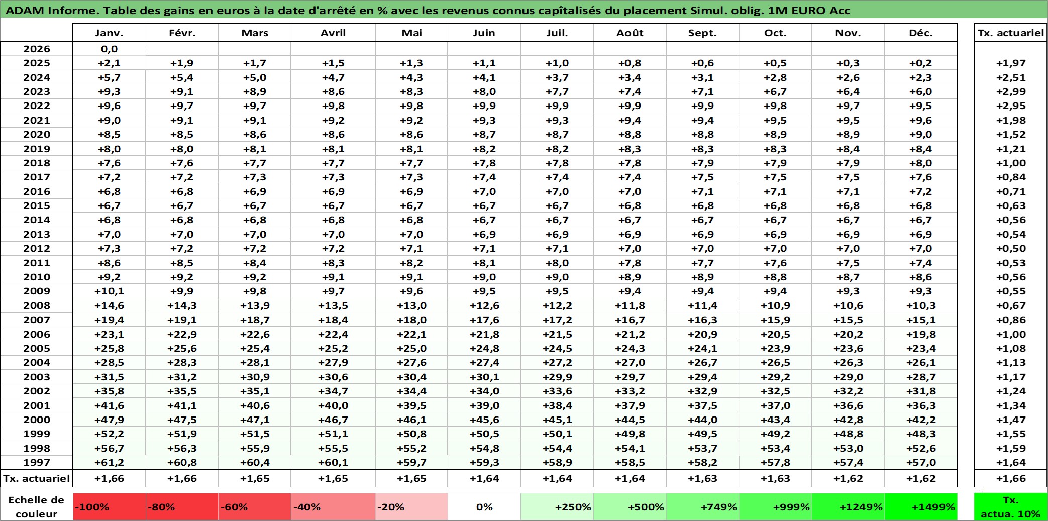 Site dédié aux investisseursPage dédiée sur site financeAnalyse des valorisations hebdomadaires de l'action Simul. oblig. 1M EURO Acc. Cet actif est cote en EUR. Les valorisations couvrent les semaines 1997W01 a 2026W05. Les revenus de cet actif financier sont pris en compte depuis la semaine 1997W01. La note ESG de cet actif n'est pas connue.