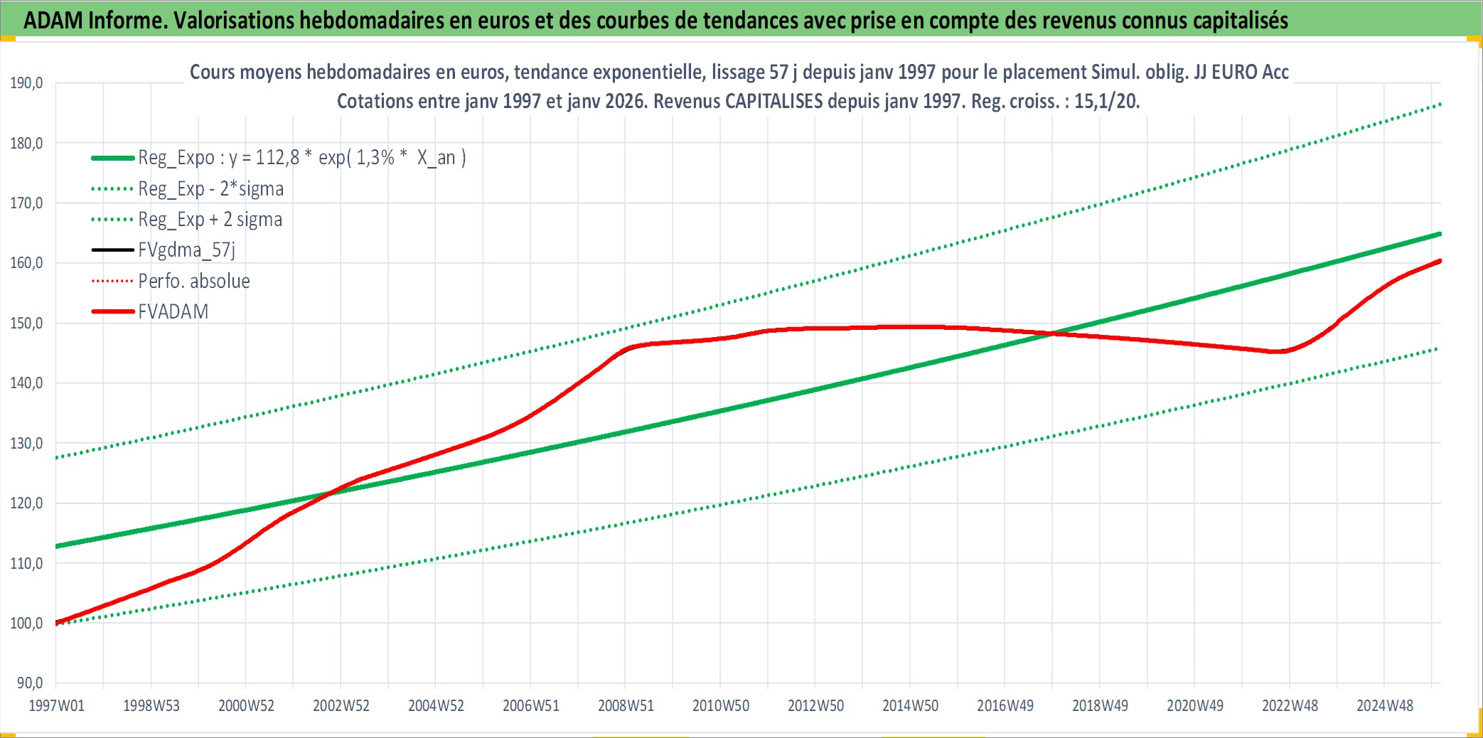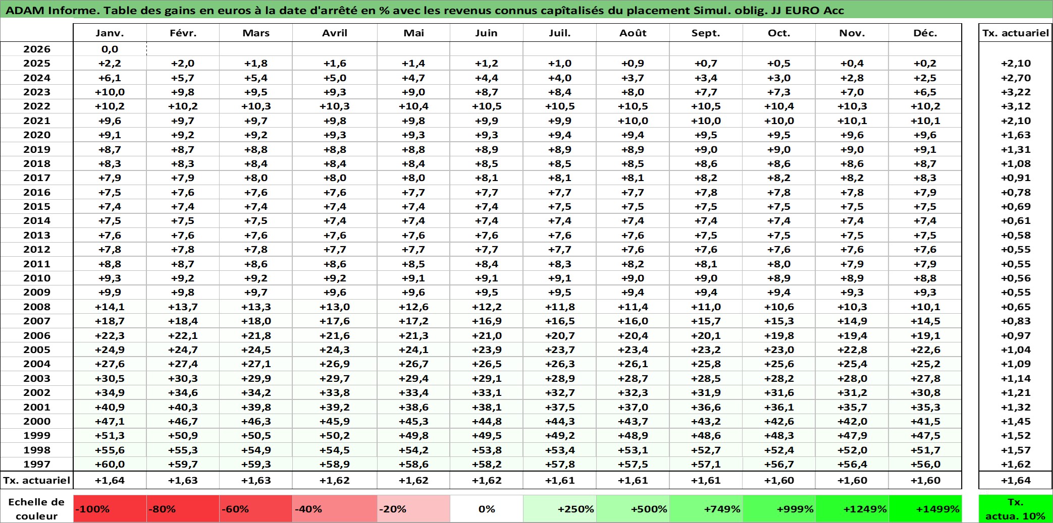 Site dédié aux investisseursPage dédiée sur site financeAnalyse des valorisations hebdomadaires de l'action Simul. oblig. JJ EURO Acc. Cet actif est cote en EUR. Les valorisations couvrent les semaines 1997W01 a 2026W05. Les revenus de cet actif financier sont pris en compte depuis la semaine 1997W01. La note ESG de cet actif n'est pas connue.