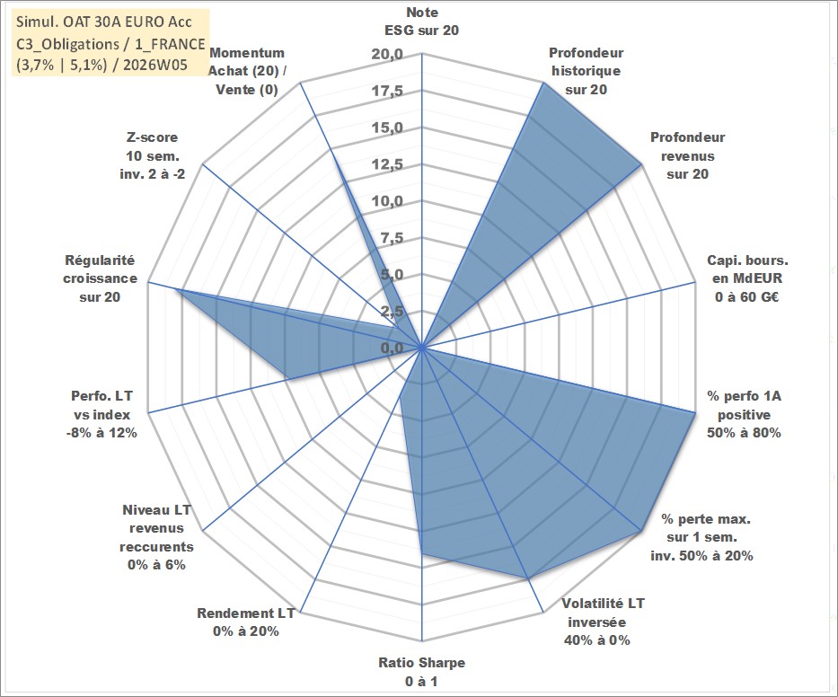 Site dédié aux investisseursPage dédiée sur site financeAnalyse des valorisations hebdomadaires de l'action Simul. OAT 30A EURO Acc. Cet actif est cote en EUR. Les valorisations couvrent les semaines 1997W01 a 2026W05. Les revenus de cet actif financier sont pris en compte depuis la semaine 1997W01. La note ESG de cet actif n'est pas connue.