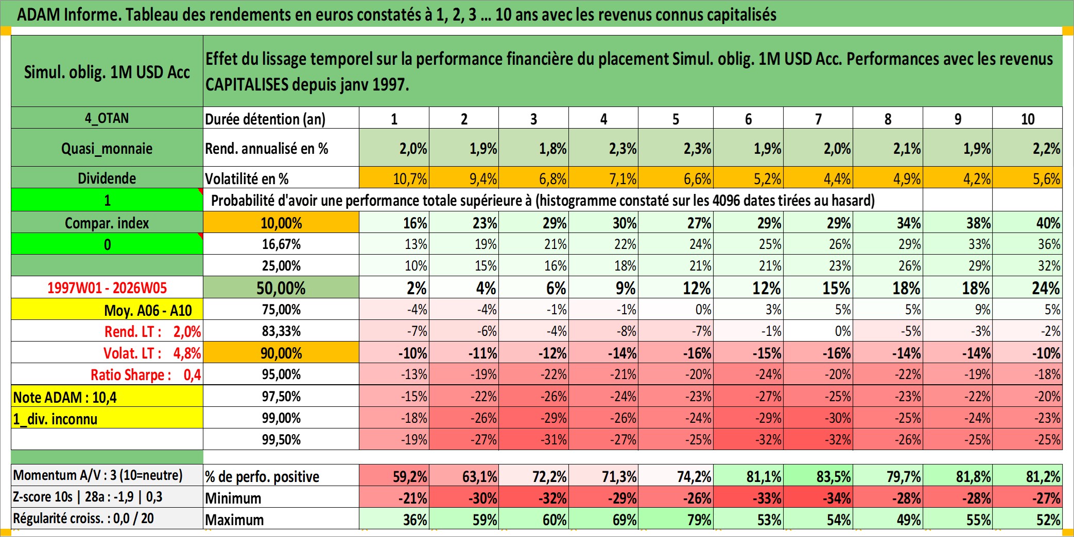 Site dédié aux investisseursPage dédiée sur site financeAnalyse des valorisations hebdomadaires de l'action Simul. oblig. 1M USD Acc. Cet actif est cote en USD. Les valorisations sont en contrevaleur EURO et couvrent les semaines 1997W01 a 2026W05. Les revenus de cet actif financier sont pris en compte depuis la semaine 1997W01. La note ESG de cet actif n'est pas connue.