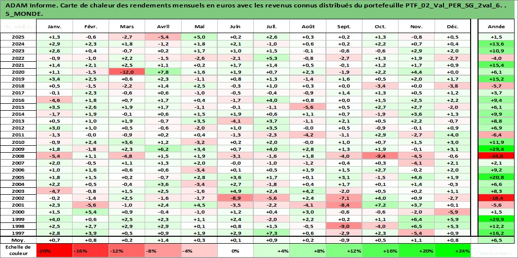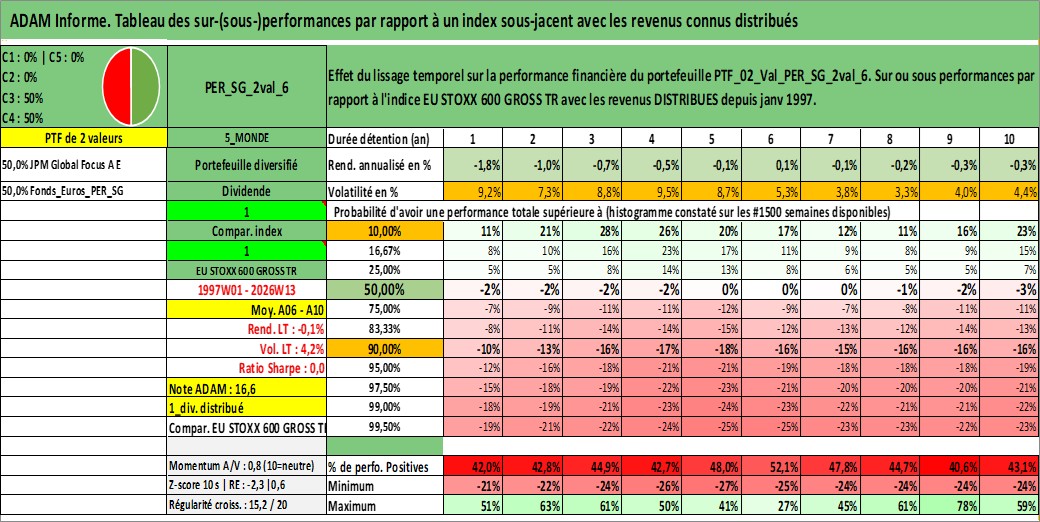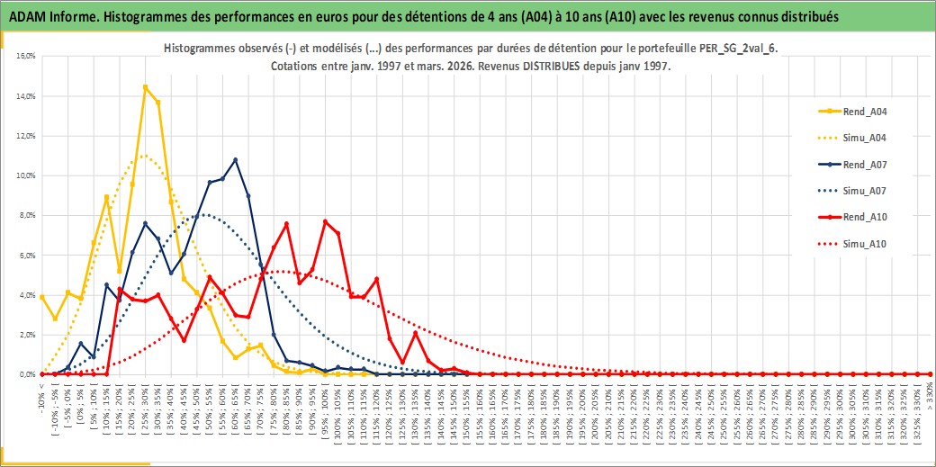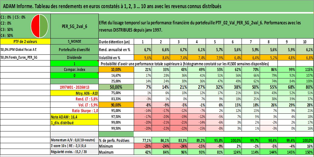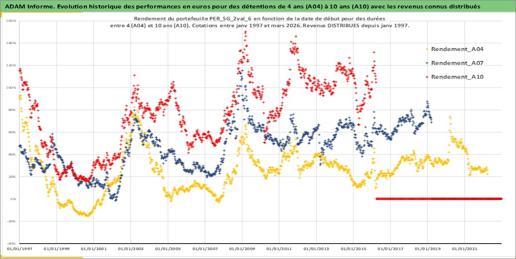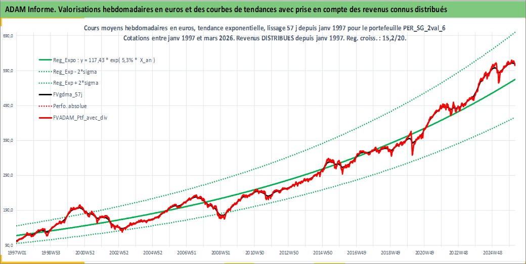 Site dédié aux investisseursPage dédiée sur site financeAnalyse des valorisations hebdomadaires du portefeuille ADAM_PER_SG_2val_6_2actifs avec un profil P6_PurActions. Ce portefeuille est cote en EUR. Les valorisations couvrent les semaines 1997W01 a 2026W13. Les revenus de cet actif financier sont pris en compte depuis la semaine 1997W01. La note ESG de cet actif n'est pas connue.