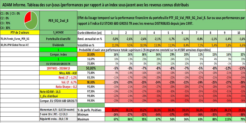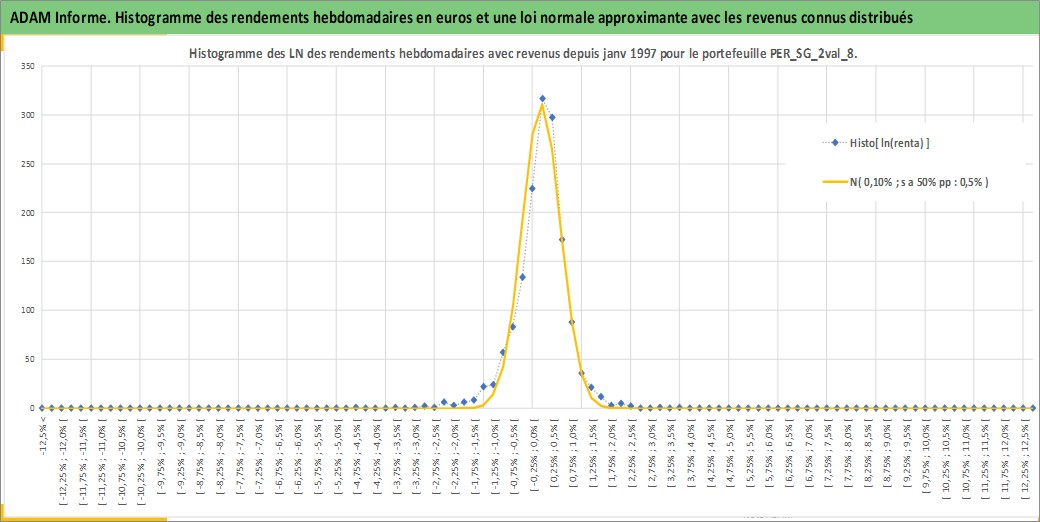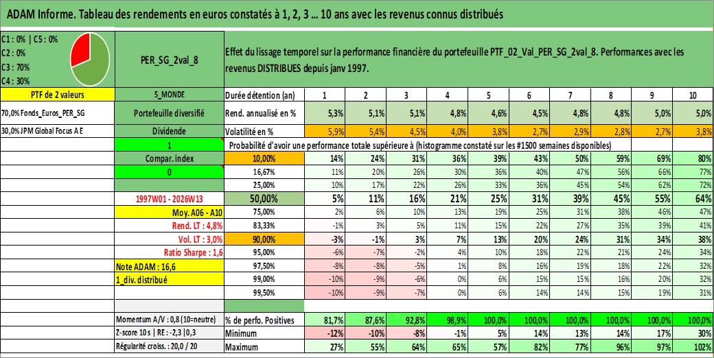 Site dédié aux investisseursPage dédiée sur site financeAnalyse des valorisations hebdomadaires du portefeuille ADAM_PER_SG_2val_8_2actifs avec un profil P6_PurActions. Ce portefeuille est cote en EUR. Les valorisations couvrent les semaines 1997W01 a 2026W13. Les revenus de cet actif financier sont pris en compte depuis la semaine 1997W01. La note ESG de cet actif n'est pas connue.