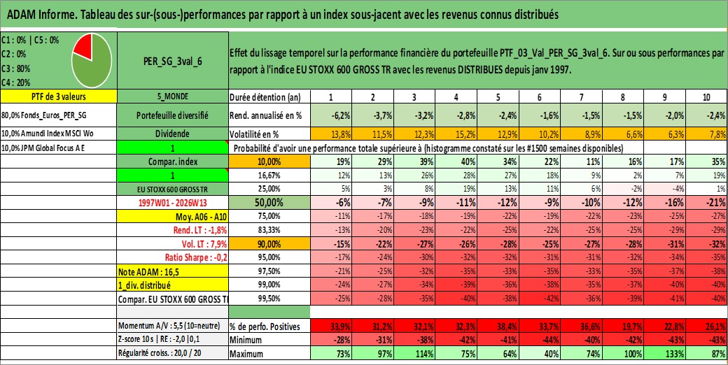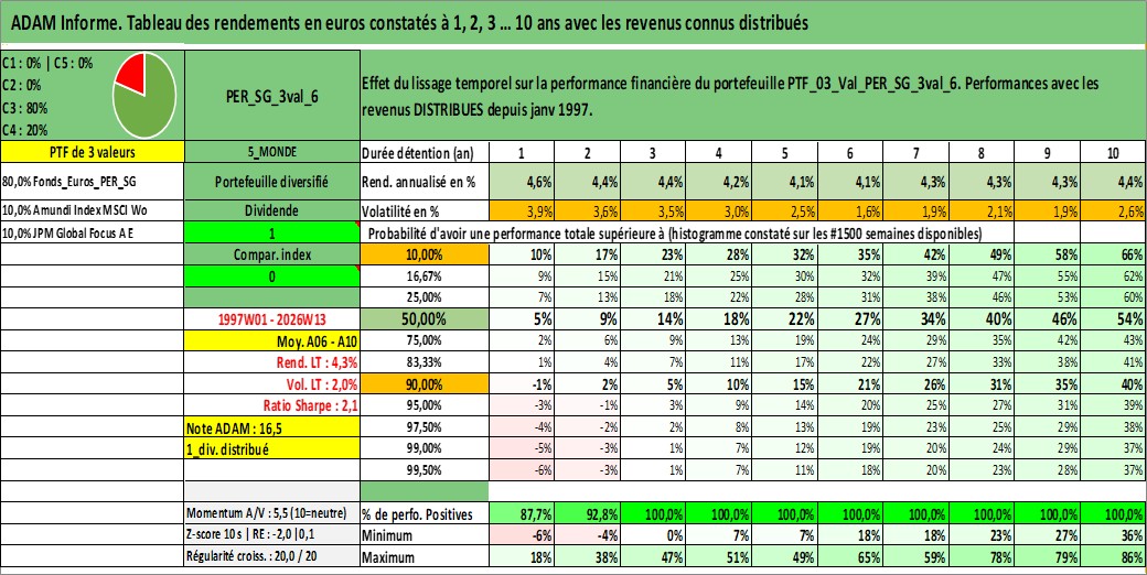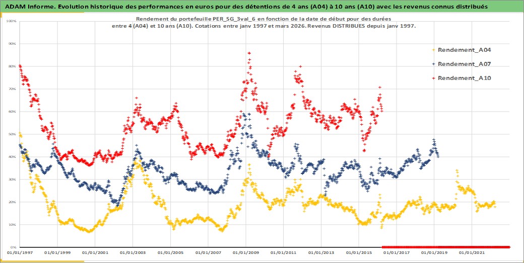 Site dédié aux investisseursPage dédiée sur site financeAnalyse des valorisations hebdomadaires du portefeuille ADAM_PER_SG_3val_6_3actifs avec un profil P6_PurActions. Ce portefeuille est cote en EUR. Les valorisations couvrent les semaines 1997W01 a 2026W13. Les revenus de cet actif financier sont pris en compte depuis la semaine 1997W01. La note ESG de cet actif n'est pas connue.