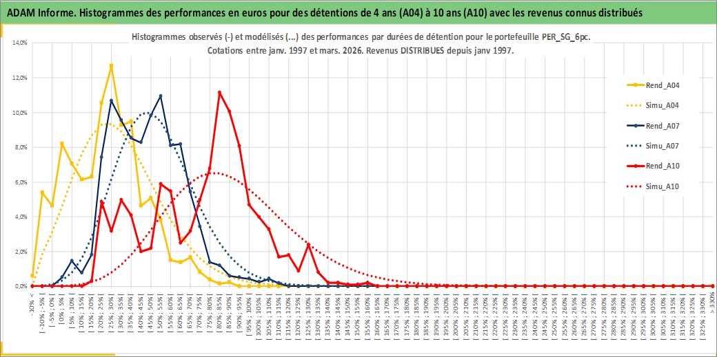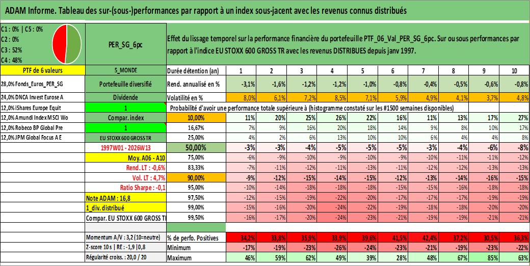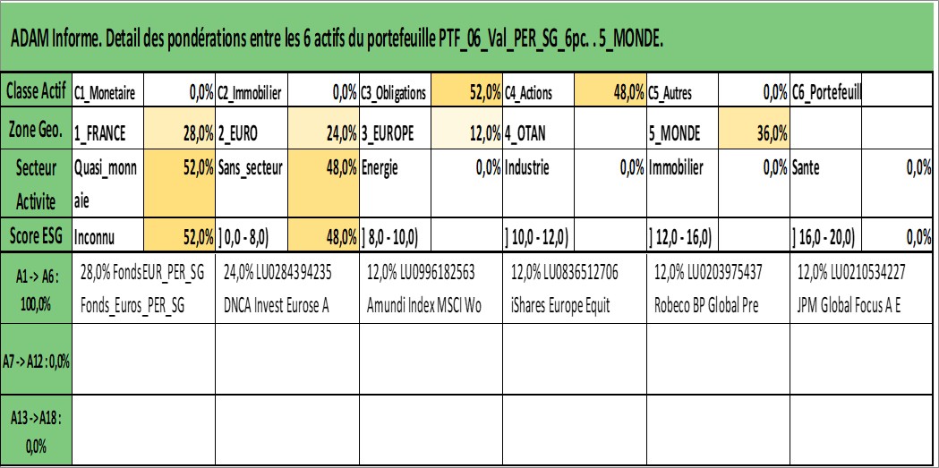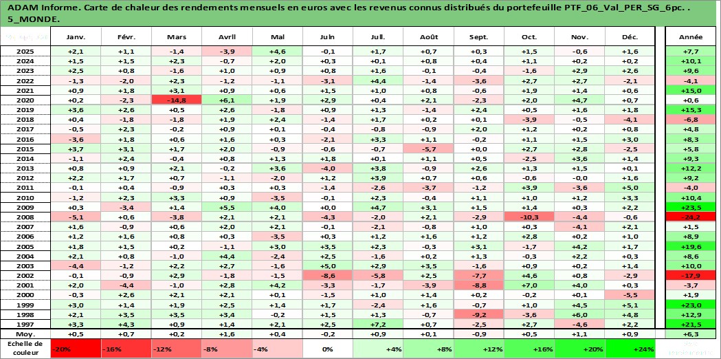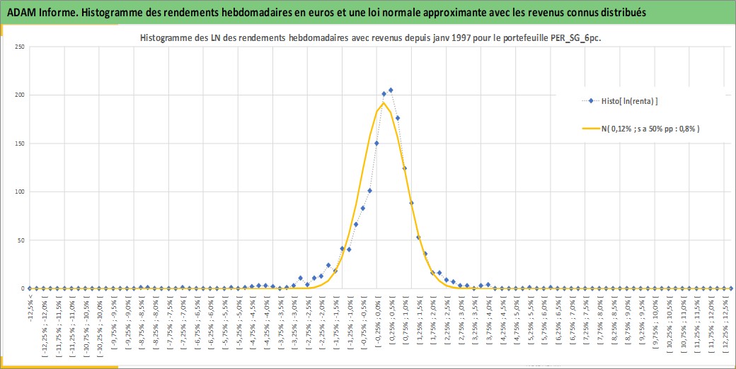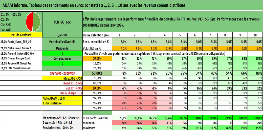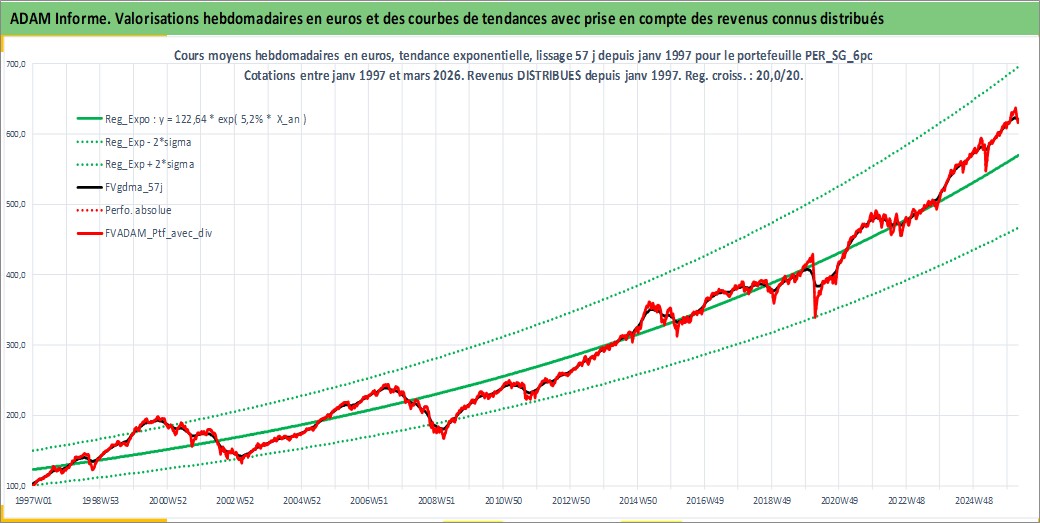 Site dédié aux investisseursPage dédiée sur site financeAnalyse des valorisations hebdomadaires du portefeuille ADAM_PER_SG_6pc_6actifs avec un profil P6_PurActions. Ce portefeuille est cote en EUR. Les valorisations couvrent les semaines 1997W01 a 2026W13. Les revenus de cet actif financier sont pris en compte depuis la semaine 1997W01. La note globale ESG de cet actif est estimee a 15.9 (apres rebasage entre 0 et 20).
